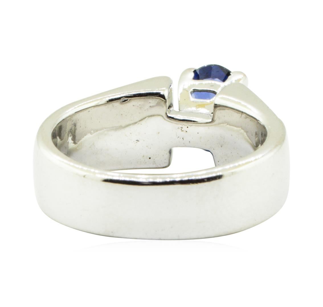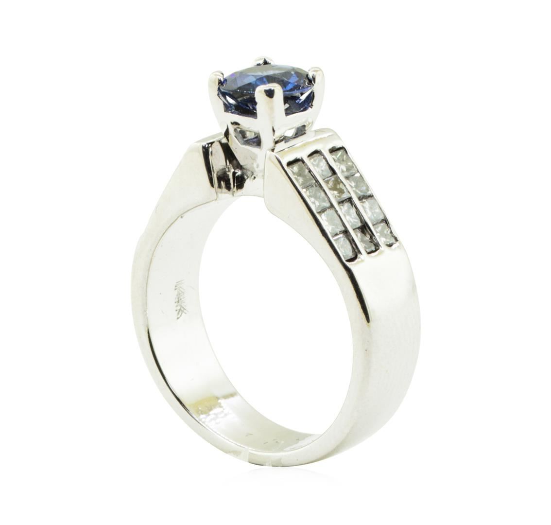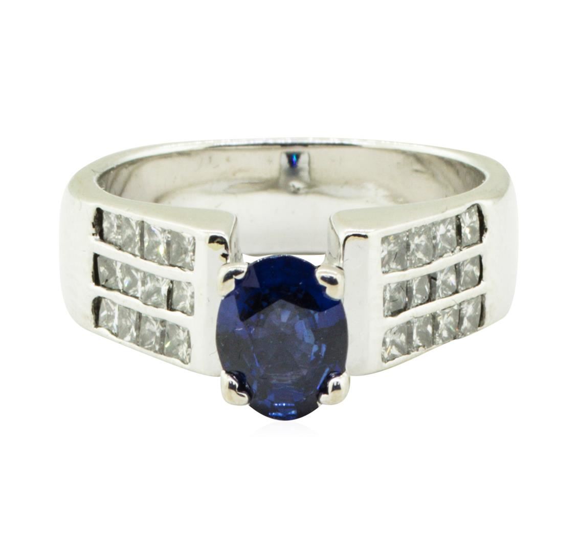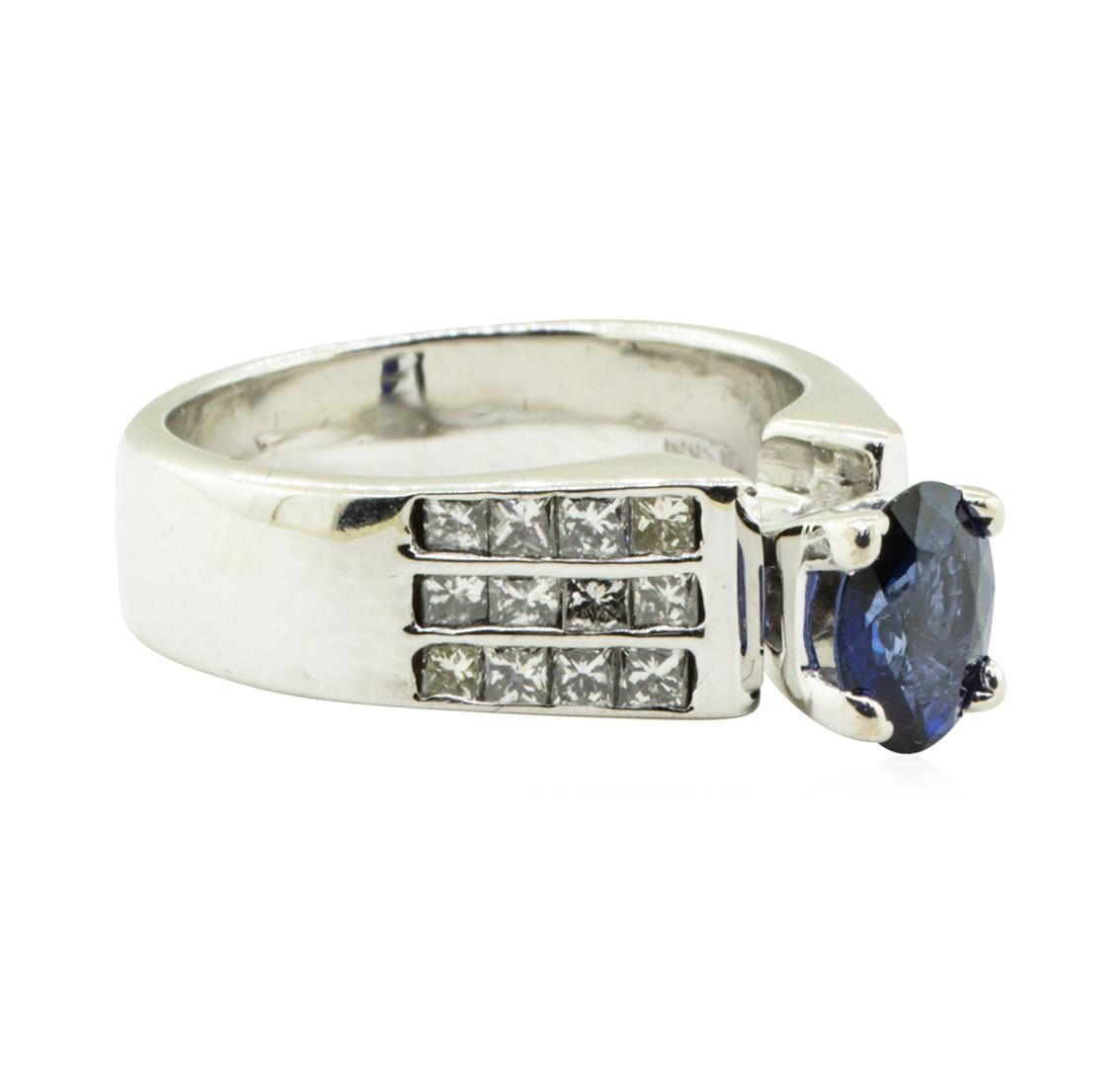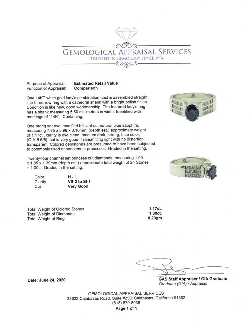 One 14KT white gold lady's combination cast & assembled straight line three-row ring with a cathedral shank with a bright polish finish. The featured lady's ring has a shank measuring 5.50 millimeters in width. Identified with markings of '14K'. Condition is like new, good workmanship. Containing: One prong set oval modified brilliant cut natural blue sapphire, measuring 7.75 x 5.98 x 3.10mm, (depth est.) approximate weight of 1.17ct., clarity is eye clean, medium dark, strong, blue color, (GIA B 6/5), cut is very good. Transmitting light with no distortion, transparent. Colored gemstones are presumed to have been subjected to commonly used enhancement processes. Graded in the setting. Twenty-Four channel set princess cut diamonds, measuring 1.90 x 1.85 x 1.39mm (depth est.) approximate total weight of 24 Stones = 1.00ct. Graded in the setting. Color H - I Clarity VS-2 to SI-1 Cut Very Good. Total Weight of Colored Stones 1.17ct.. Total Weight of Diamonds 1.00ct.. Total Weight of Ring 8.20gm GAS Appraised at $6080.00. GAS Appraised.