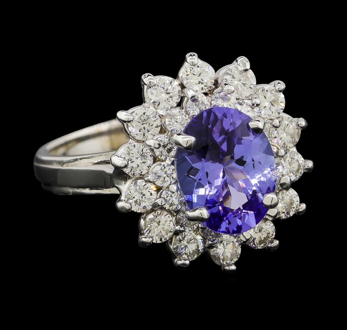 One electronically tested 14KT white gold lady's cast fashion ring with a double basket halo with a bright polish finish. The featured lady's ring has a shank measuring 2.50 millimeters wide. Identified with markings of '14K'. Condition is new, good workmanship. Containing: One prong set oval modified brilliant cut natural tanzanite, measuring 9.63 x 7.41 x 4.75mm, (depth est.) approximate weight of 2.17ct., clarity is eye clean, medium, moderately strong, bluish violet color, (GIA bV 5/4), cut is very good. Transmitting light with no distortion, transparent. Colored gemstones are presumed to have been subjected to commonly used enhancement processes. Graded in the setting. Fourteen prong set round brilliant cut diamonds, measuring 2.50 - 2.40 x 1.49mm (depth est.) approximate total weight of 14 Stones = 0.77ct. Graded in the setting. Clarity SI-1 to I-1. Color: G - I Cut Good Fourteen prong set round brilliant cut diamonds, measuring 1.90 - 1.80 x 1.15mm (depth est.) approximate total weight of 14 Stones = 0.33ct. Graded in the setting. Clarity SI-1 to SI-2. Color: H - I Cut Good. Total Weight of Colored Stones 2.17ct.. Total Weight of Diamonds 1.10ct.. Total Weight of Ring 5.50gm. GAS Appraised at $6,310.00.