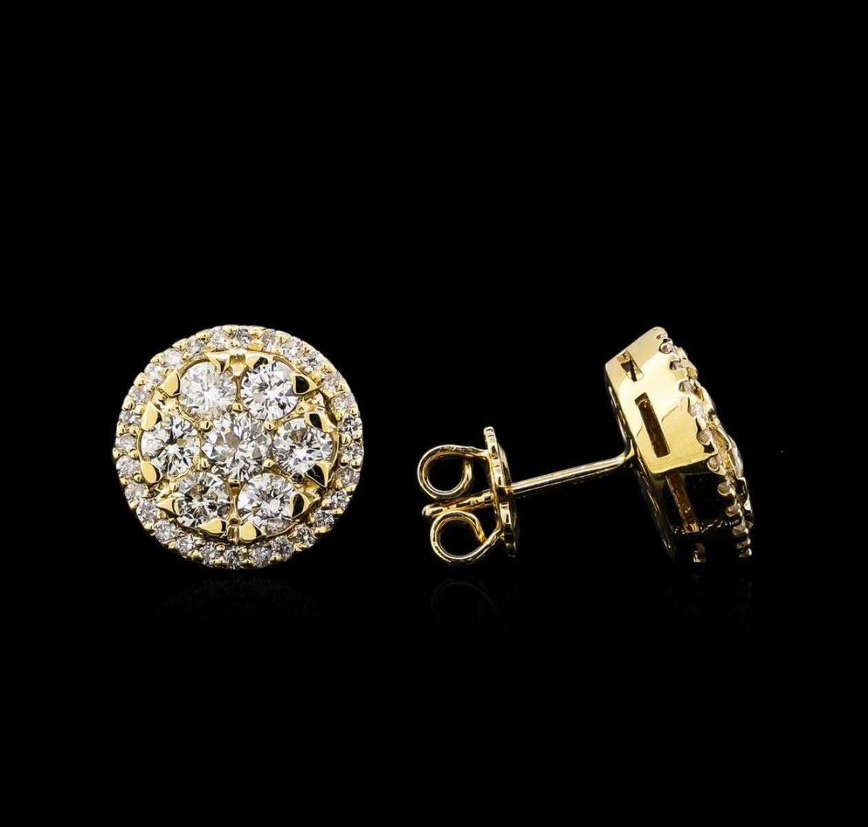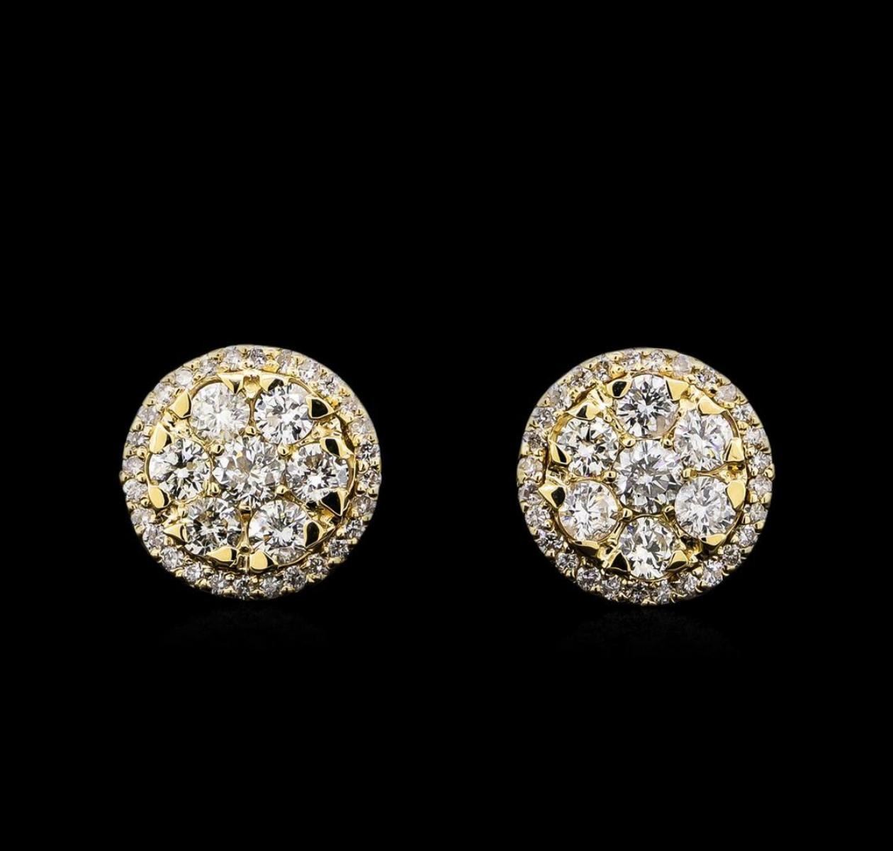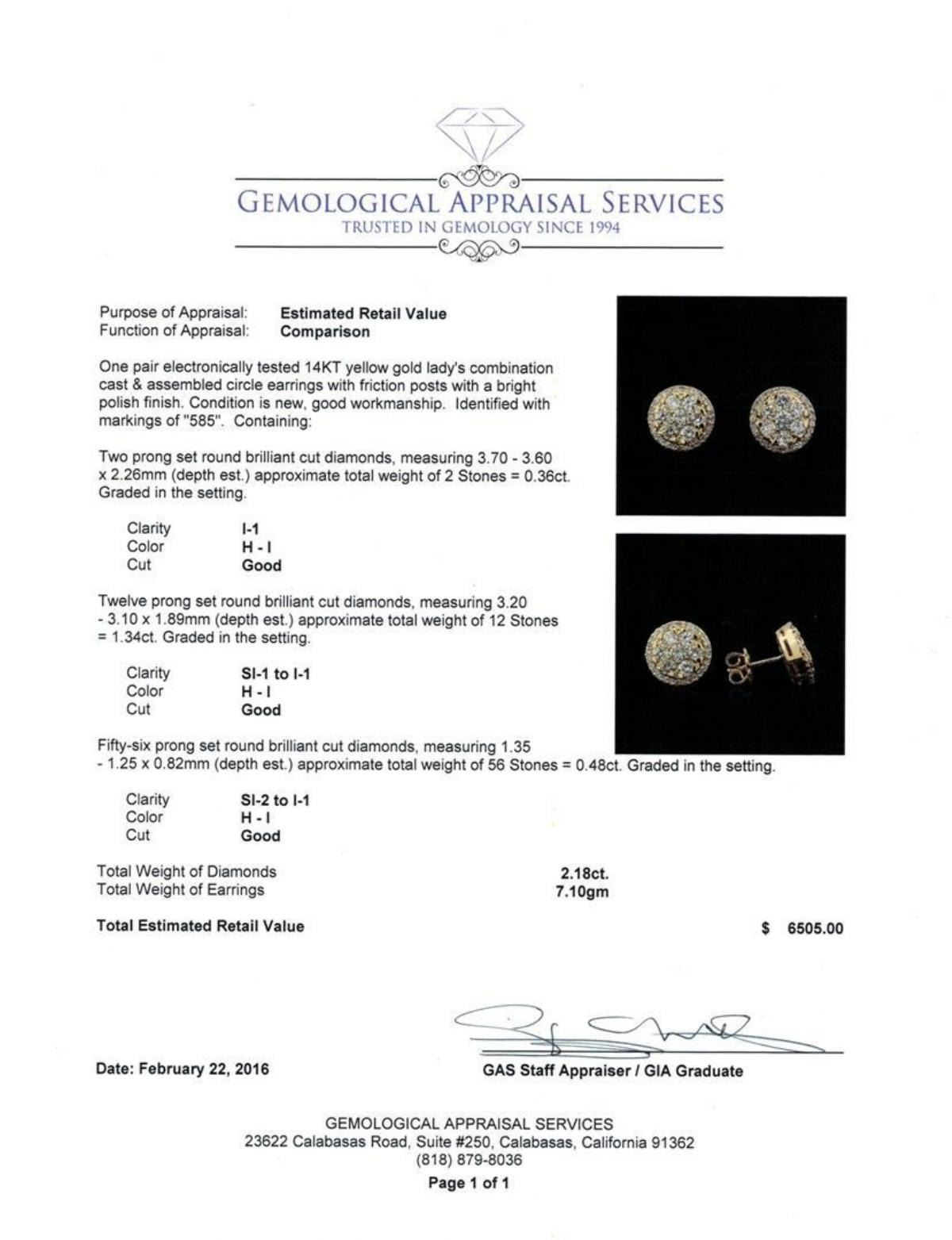 One pair electronically tested 14KT yellow gold lady's combination cast & assembled circle earrings with friction posts with a bright polish finish. Identified with markings of "585". Condition is new, good workmanship. Containing: Two prong set round brilliant cut diamonds, measuring 3.70 - 3.60 x 2.26mm (depth est.) approximate total weight of 2 Stones = 0.36ct. Graded in the setting. Clarity: I-1. Color: H - I. Cut Good Twelve prong set round brilliant cut diamonds, measuring 3.20 - 3.10 x 1.89mm (depth est.) approximate total weight of 12 Stones = 1.34ct. Graded in the setting. Clarity: SI-1 to I-1. Color: H - I. Cut Good Fifty-Six prong set round brilliant cut diamonds, measuring 1.35 - 1.25 x 0.82mm (depth est.) approximate total weight of 56 Stones = 0.48ct. Graded in the setting. Clarity: SI-2 to I-1. Color: H - I. Cut Good. Total Weight of Diamonds 2.18ct. Total Weight of Earrings 7.10gm. GAS Appraised.