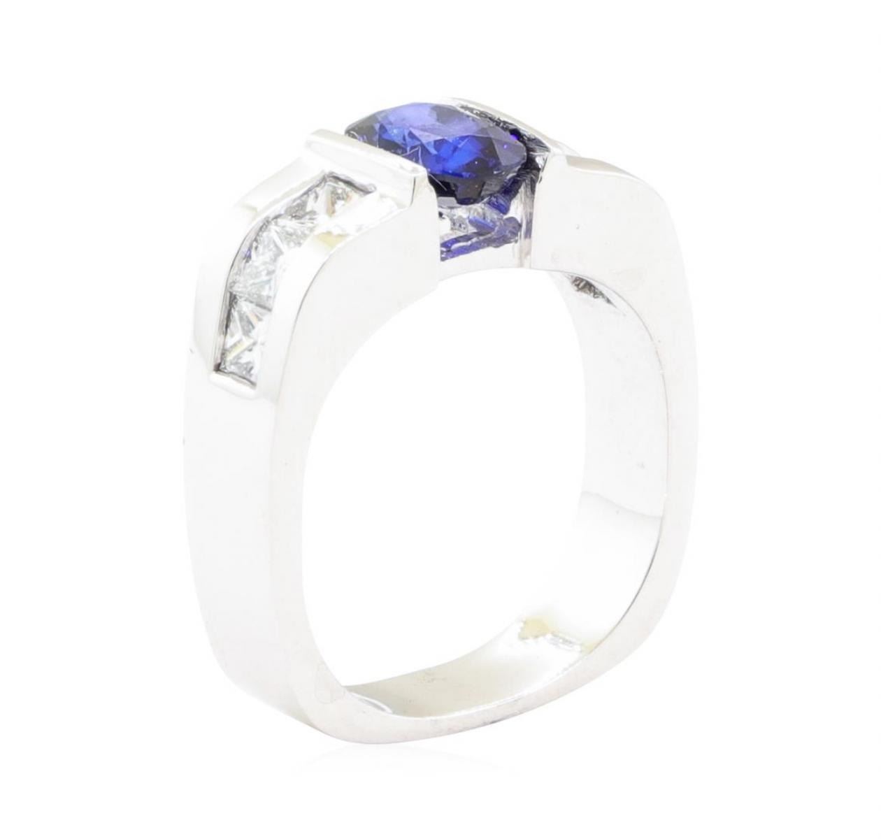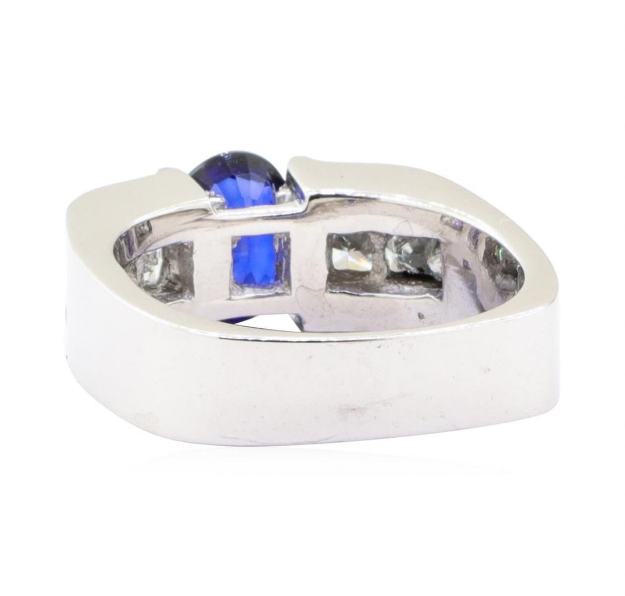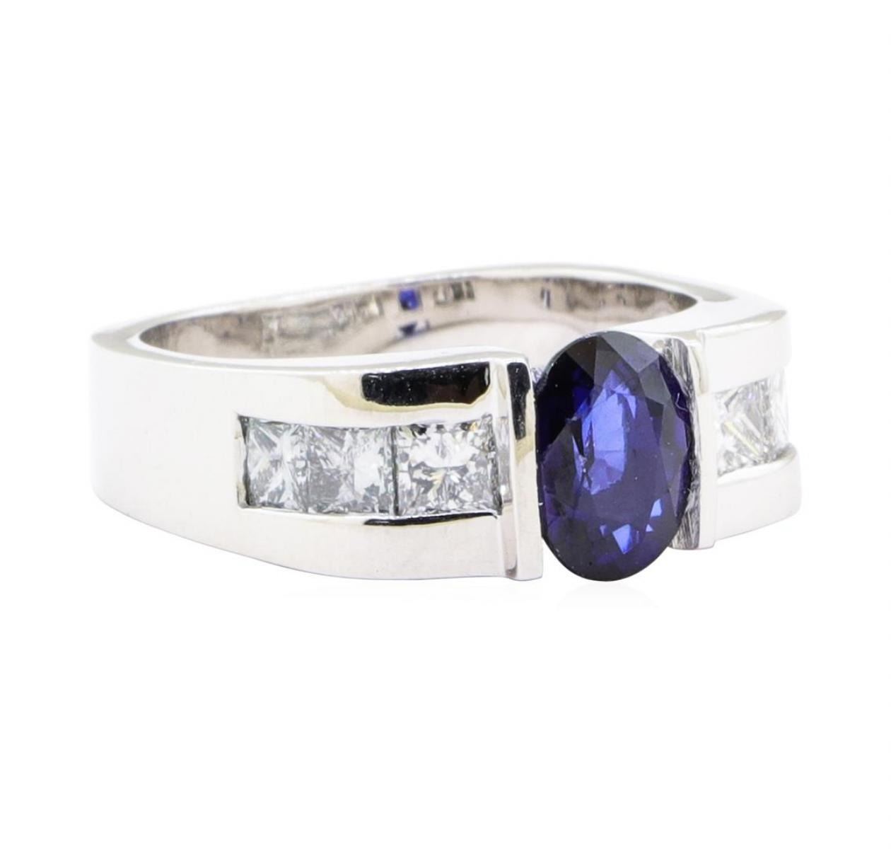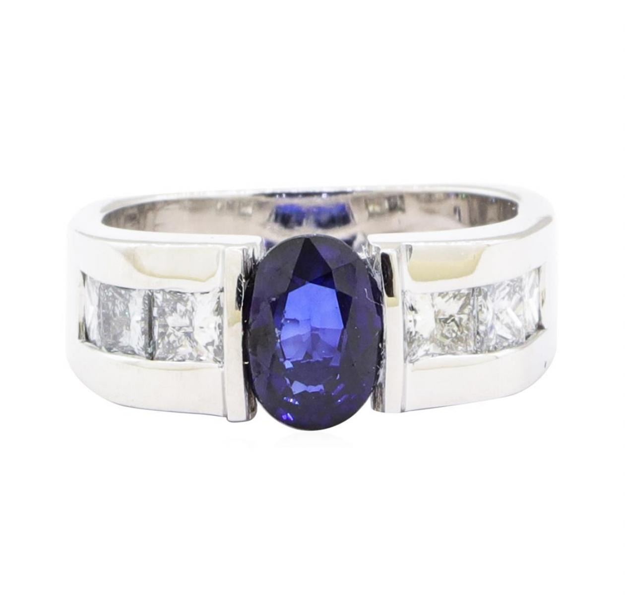 One electronically tested 18KT white gold lady's cast fashion ring with a European shank with a bright polish finish. The featured lady's ring has a shank measuring 4.60 millimeters wide. Identified with markings of '18K'. Condition is Good. Containing: One channel set oval modified mixed cut natural blue sapphire, measuring 7.76 x 5.90 x 3.30mm, (depth est.) approximate weight of 1.33ct., clarity is slightly included, medium dark, moderately strong, blue color, (GIA B 6/4), cut is good. Transmitting light with a minimum of distortion, transparent. Colored gemstones are presumed to have been subjected to commonly used enhancement processes. Graded in the setting. Six channel set princess cut diamonds, measuring 2.90 x 2.85 x 2.14mm (depth est.) approximate total weight of 6 Stones = 0.85ct. Graded in the setting. Color H - I Clarity VS-2 to SI-1 Cut Very Good. Total Weight of Colored Stones 1.33ct.. Total Weight of Diamonds 0.85ct.. Total Weight of Ring 9.40gm GAS Appraised at $5345.00. GAS Appraised.