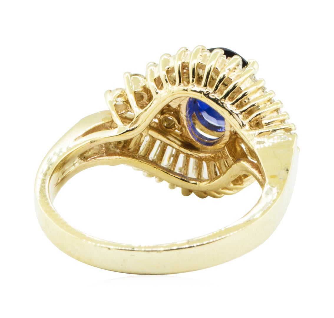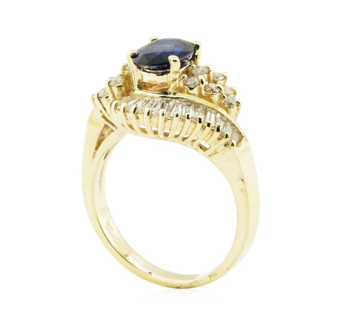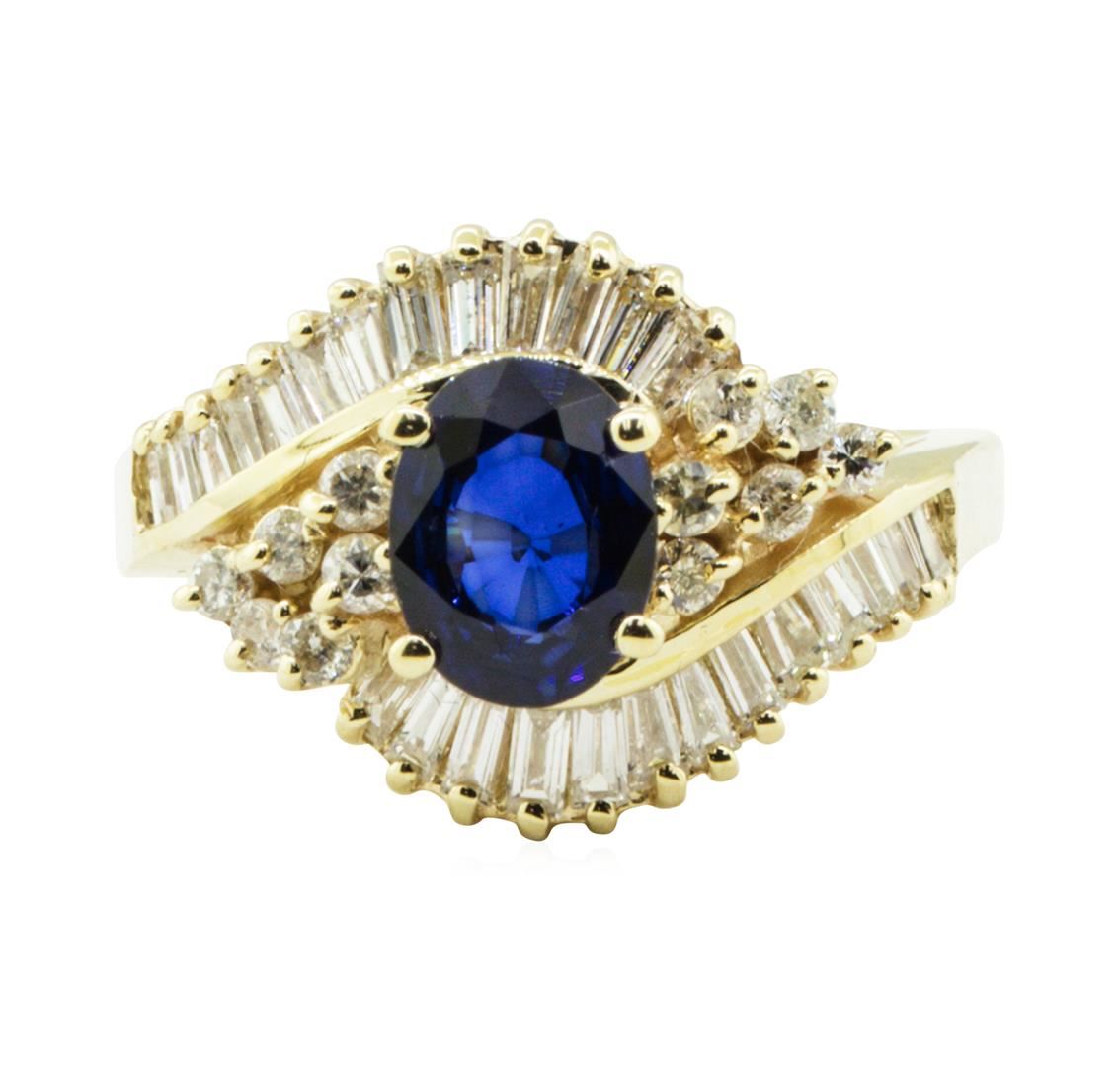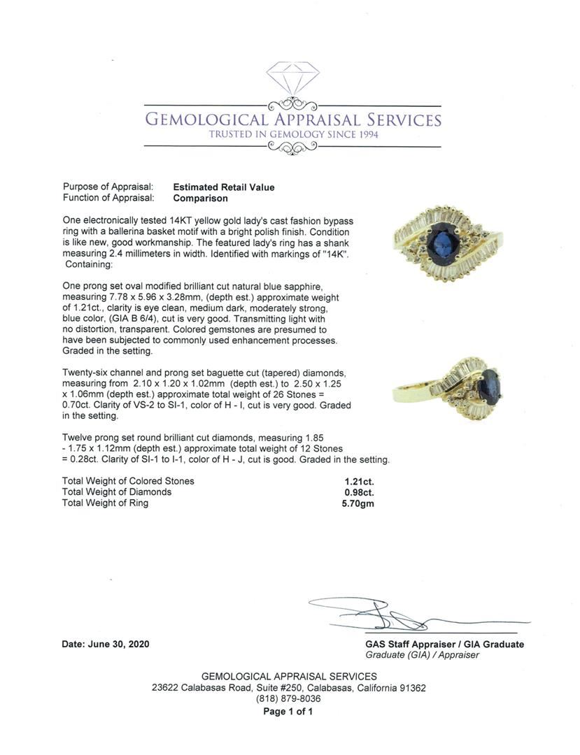 One electronically tested 14KT yellow gold lady's cast fashion bypass ring with a ballerina basket motif with a bright polish finish. The featured lady's ring has a shank measuring 2.4 millimeters in width. Identified with markings of '14K'. Condition is like new, good workmanship. Containing: One prong set oval modified brilliant cut natural blue sapphire, measuring 7.78 x 5.96 x 3.28mm, (depth est.) approximate weight of 1.21ct., clarity is eye clean, medium dark, moderately strong, blue color, (GIA B 6/4), cut is very good. Transmitting light with no distortion, transparent. Colored gemstones are presumed to have been subjected to commonly used enhancement processes. Graded in the setting. Twenty-Six channel and prong set baguette cut (tapered) diamonds, measuring from 2.10 x 1.20 x 1.02mm (depth est.) to 2.50 x 1.25 x 1.06mm (depth est.) approximate total weight of 26 Stones = 0.70ct. Graded in the setting. Color H - I Clarity VS-2 to SI-1 Cut Very Good Twelve prong set round brilliant cut diamonds, measuring 1.85 - 1.75 x 1.12mm (depth est.) approximate total weight of 12 Stones = 0.28ct. Graded in the setting. Color H - J Clarity SI-1 to I-1 Cut Good. Total Weight of Colored Stones 1.21ct.. Total Weight of Diamonds 0.98ct.. Total Weight of Ring 5.70gm GAS Appraised at $4235.00. GAS Appraised.