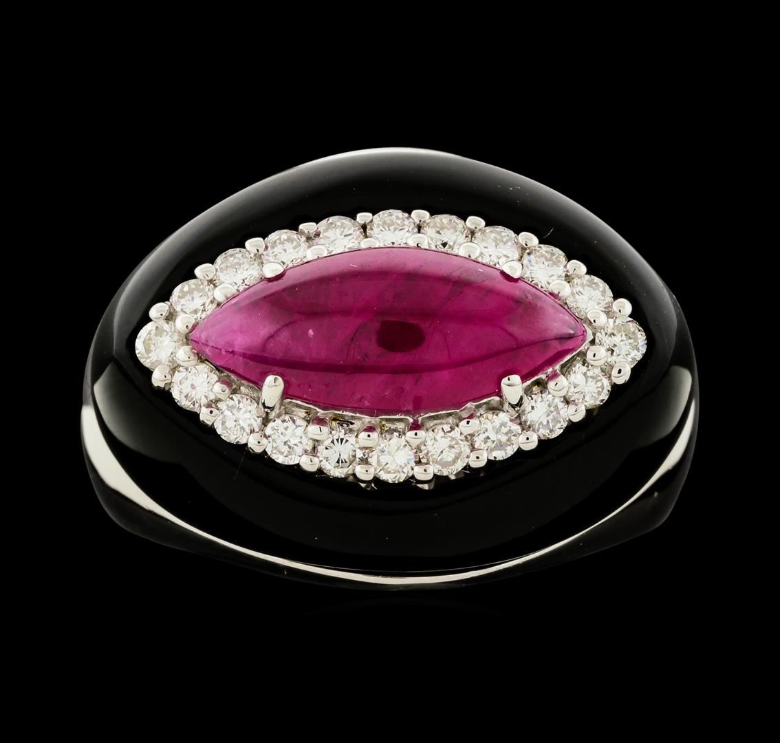 One electronically tested 18KT yellow gold with rhodium plating lady's combination cast & assembled fashion ring with a tapered wide band with a bright polish finish. The featured lady's ring has an inlaid oval onyx that has been shaped to fit flush against the shank and center halo. The ring has a shank measuring 5.45 millimeters wide. Condition is new, good workmanship. Containing: One prong set marquise cabochon cut natural ruby, measuring 14.50 x 6.20 x 3.62mm, (depth est.) approximate weight of 2.20ct., clarity is heavily included, medium light, moderately strong, slightly purplish red color, (GIA slpR 4/4), cut is very good. Transmitting light somewhat diffusely, semi-transparent to translucent. Colored gemstones are presumed to have been subjected to commonly used enhancement processes. Graded in the setting. Twenty prong set round brilliant cut diamonds, measuring 1.90 - 1.85 x 1.17mm (depth est.) approximate total weight of 20 Stones = 0.50ct. Graded in the setting. Clarity VS-1 to VS-2. Color: G - H Cut Good. Total Weight of Colored Stones 2.20ct.. Total Weight of Diamonds 0.50ct.. Total Weight of Ring 14.40gm. GAS Appraised.