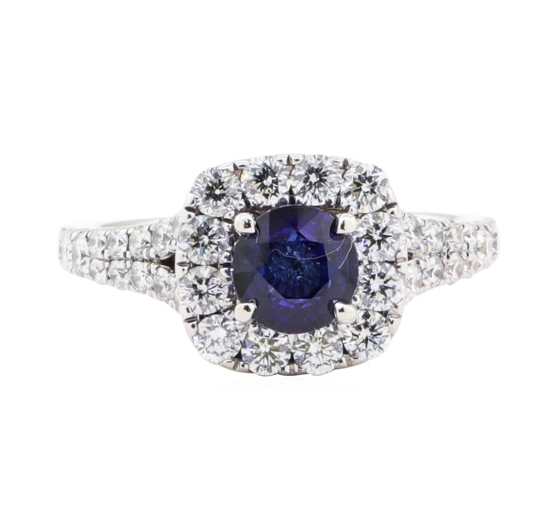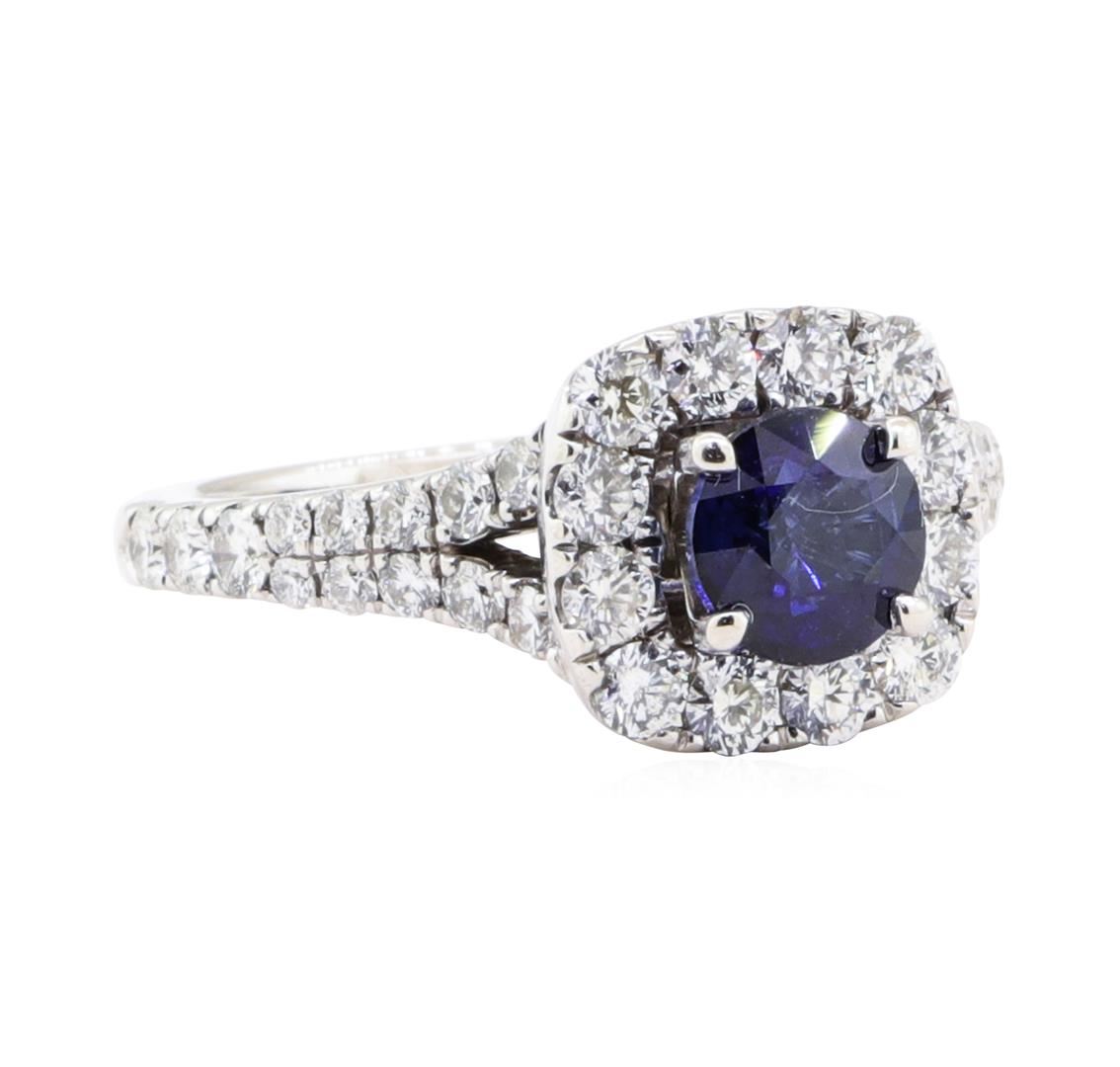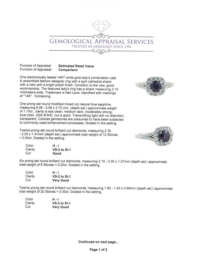 One electronically tested 14KT white gold lady's combination cast & assembled fashion designer ring with a split cathedral shank with a halo with a bright polish finish. The featured lady's ring has a shank measuring 2.10 millimeters wide. Trademark is Neil Lane. Identified with markings of '14K'. Condition is Good. Containing: One prong set round modified mixed cut natural blue sapphire, measuring 6.08 - 5.99 x 3.70 mm, (depth est.) approximate weight of 1.10ct., clarity is eye clean, medium dark, moderately strong, blue color, (GIA B 6/4), cut is good. Transmitting light with no distortion, transparent. Colored gemstones are presumed to have been subjected to commonly used enhancement processes. Graded in the setting. Twelve prong set round brilliant cut diamonds, measuring 2.30 - 2.25 x 1.41mm (depth est.) approximate total weight of 12 Stones = 0.54ct. Graded in the setting. Color H - I Clarity VS-2 to SI-1 Cut Good Six prong set round brilliant cut diamonds, measuring 2.10 - 2.00 x 1.27mm (depth est.) approximate total weight of 6 Stones = 0.20ct. Graded in the setting. Color H - I Clarity VS-2 to SI-1 Cut Very Good Twenty prong set round brilliant cut diamonds, measuring 1.80 - 1.40 x 0.99mm (depth est.) approximate total weight of 20 Stones = 0.30ct. Graded in the setting. Color H - I Clarity VS-2 to SI-1 Cut Very Good Sixteen prong set round brilliant cut diamonds, measuring 1.00 - 0.95 x 0.61mm (depth est.) approximate total weight of 16 Stones = 0.06ct. Graded in the setting. Color H - I Clarity VS-2 to SI-1 Cut Very Good. Total Weight of Colored Stones 1.10ct.. Total Weight of Diamonds 1.10ct.. Total Weight of Ring 6.20gm GAS Appraised at $5145.00. GAS Appraised.