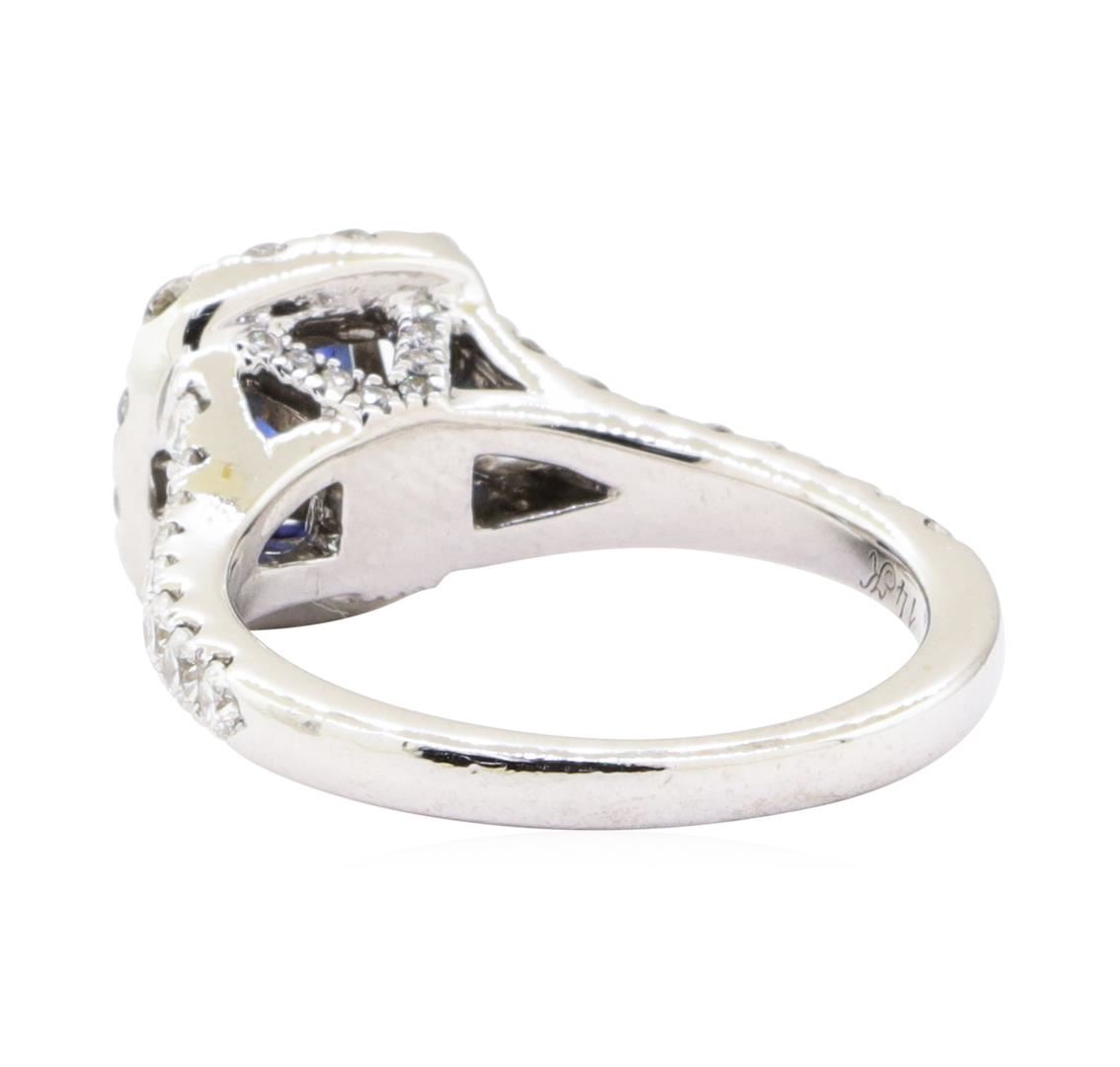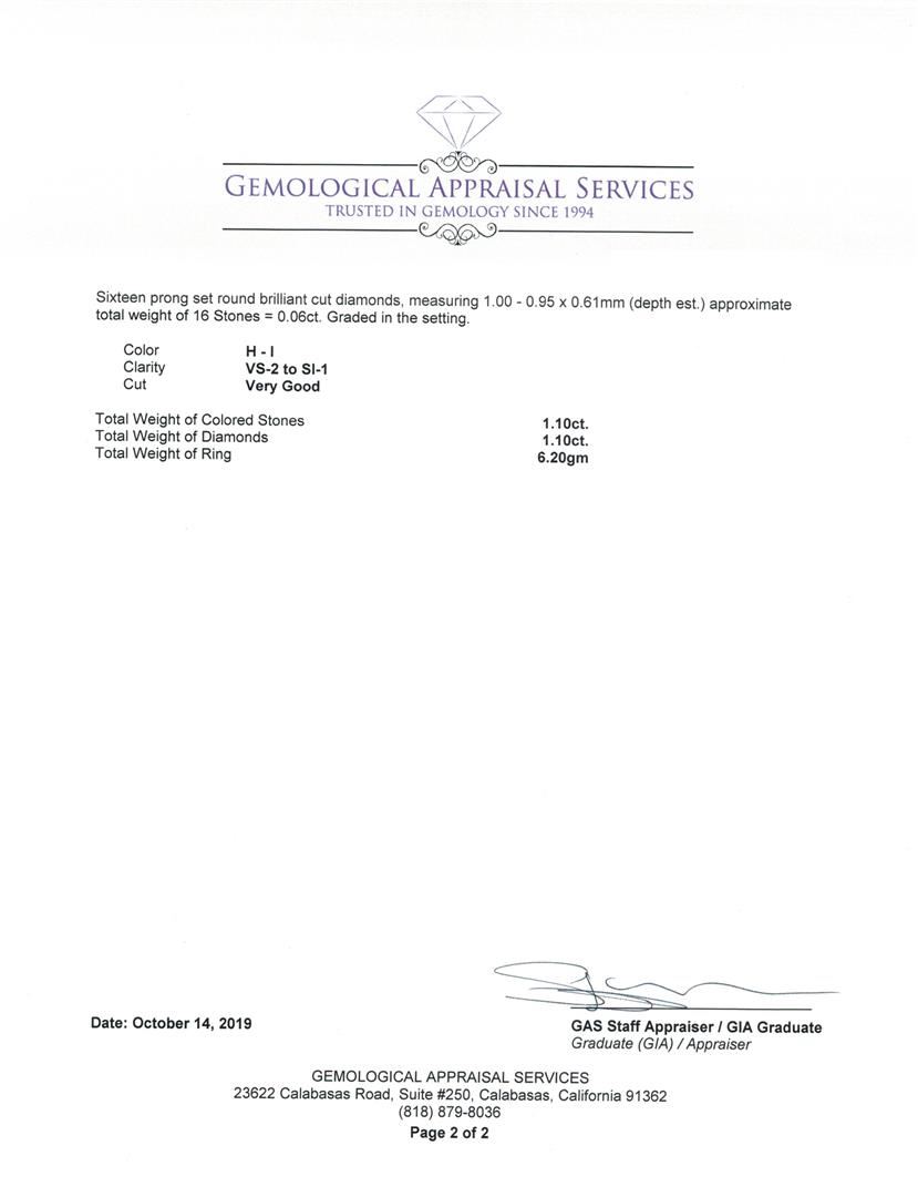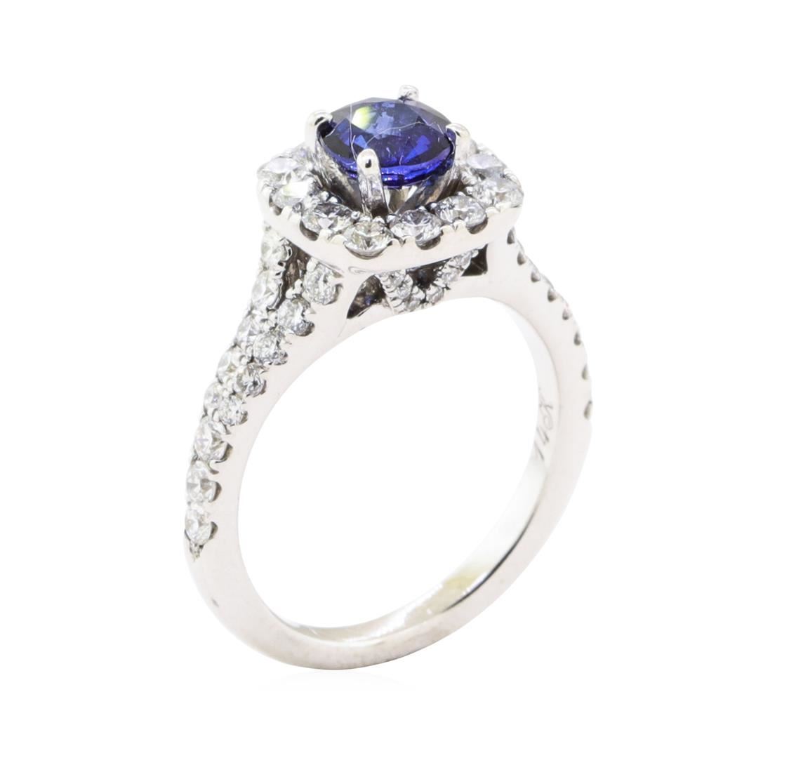 One electronically tested 14KT white gold lady's combination cast & assembled fashion designer ring with a split cathedral shank with a halo with a bright polish finish. The featured lady's ring has a shank measuring 2.10 millimeters wide. Trademark is Neil Lane. Identified with markings of '14K'. Condition is Good. Containing: One prong set round modified mixed cut natural blue sapphire, measuring 6.08 - 5.99 x 3.70 mm, (depth est.) approximate weight of 1.10ct., clarity is eye clean, medium dark, moderately strong, blue color, (GIA B 6/4), cut is good. Transmitting light with no distortion, transparent. Colored gemstones are presumed to have been subjected to commonly used enhancement processes. Graded in the setting. Twelve prong set round brilliant cut diamonds, measuring 2.30 - 2.25 x 1.41mm (depth est.) approximate total weight of 12 Stones = 0.54ct. Graded in the setting. Color H - I Clarity VS-2 to SI-1 Cut Good Six prong set round brilliant cut diamonds, measuring 2.10 - 2.00 x 1.27mm (depth est.) approximate total weight of 6 Stones = 0.20ct. Graded in the setting. Color H - I Clarity VS-2 to SI-1 Cut Very Good Twenty prong set round brilliant cut diamonds, measuring 1.80 - 1.40 x 0.99mm (depth est.) approximate total weight of 20 Stones = 0.30ct. Graded in the setting. Color H - I Clarity VS-2 to SI-1 Cut Very Good Sixteen prong set round brilliant cut diamonds, measuring 1.00 - 0.95 x 0.61mm (depth est.) approximate total weight of 16 Stones = 0.06ct. Graded in the setting. Color H - I Clarity VS-2 to SI-1 Cut Very Good. Total Weight of Colored Stones 1.10ct.. Total Weight of Diamonds 1.10ct.. Total Weight of Ring 6.20gm GAS Appraised at $5145.00. GAS Appraised.
