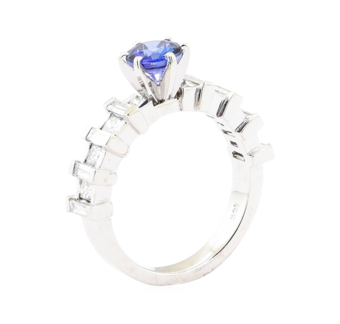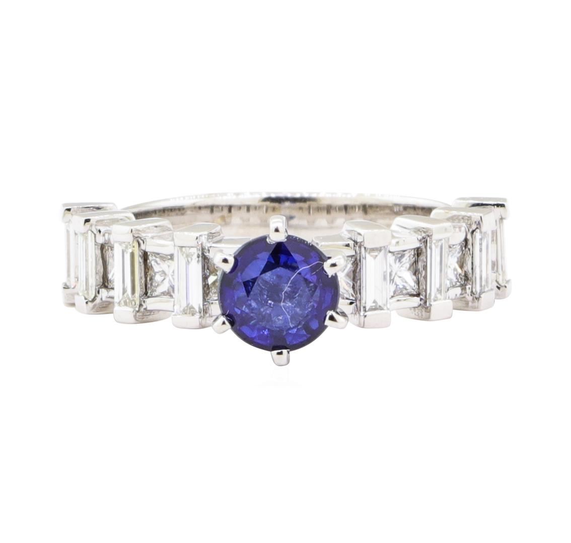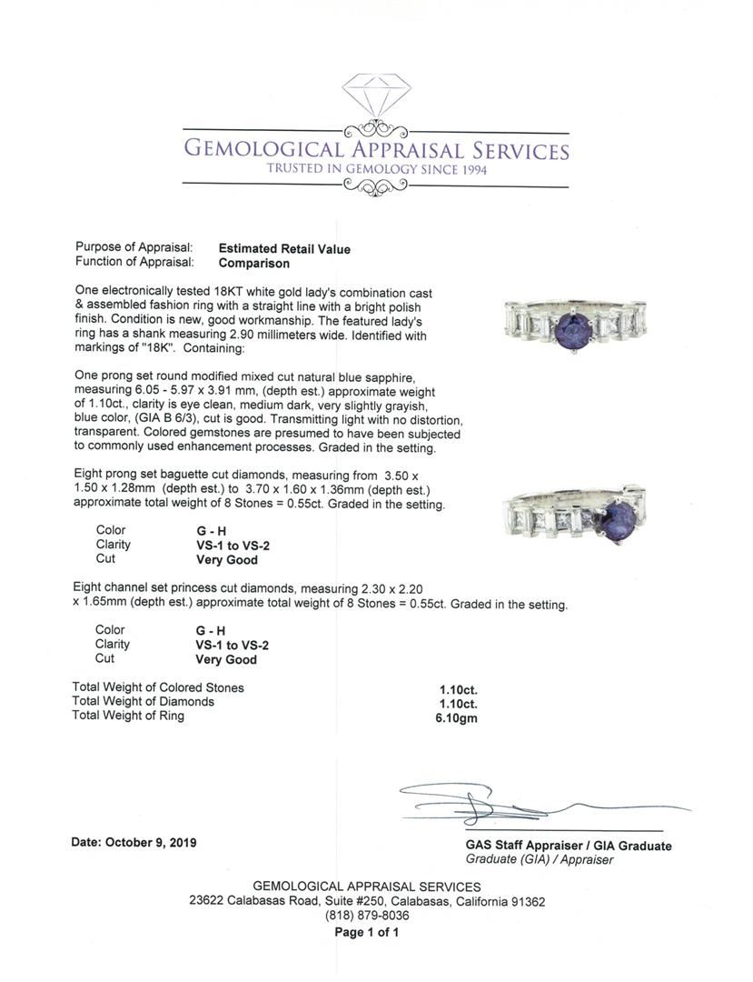 One electronically tested 18KT white gold lady's combination cast & assembled fashion ring with a straight line with a bright polish finish. The featured lady's ring has a shank measuring 2.90 millimeters wide. Identified with markings of '18K'. Condition is new, good workmanship. Containing: One prong set round modified mixed cut natural blue sapphire, measuring 6.05 - 5.97 x 3.91 mm, (depth est.) approximate weight of 1.10ct., clarity is eye clean, medium dark, very slightly grayish, blue color, (GIA B 6/3), cut is good. Transmitting light with no distortion, transparent. Colored gemstones are presumed to have been subjected to commonly used enhancement processes. Graded in the setting. Eight prong set baguette cut diamonds, measuring from 3.50 x 1.50 x 1.28mm (depth est.) to 3.70 x 1.60 x 1.36mm (depth est.) approximate total weight of 8 Stones = 0.55ct. Graded in the setting. Color G - H Clarity VS-1 to VS-2 Cut Very Good Eight channel set princess cut diamonds, measuring 2.30 x 2.20 x 1.65mm (depth est.) approximate total weight of 8 Stones = 0.55ct. Graded in the setting. Color G - H Clarity VS-1 to VS-2 Cut Very Good. Total Weight of Colored Stones 1.10ct.. Total Weight of Diamonds 1.10ct.. Total Weight of Ring 6.10gm GAS Appraised at $5555.00. GAS Appraised.