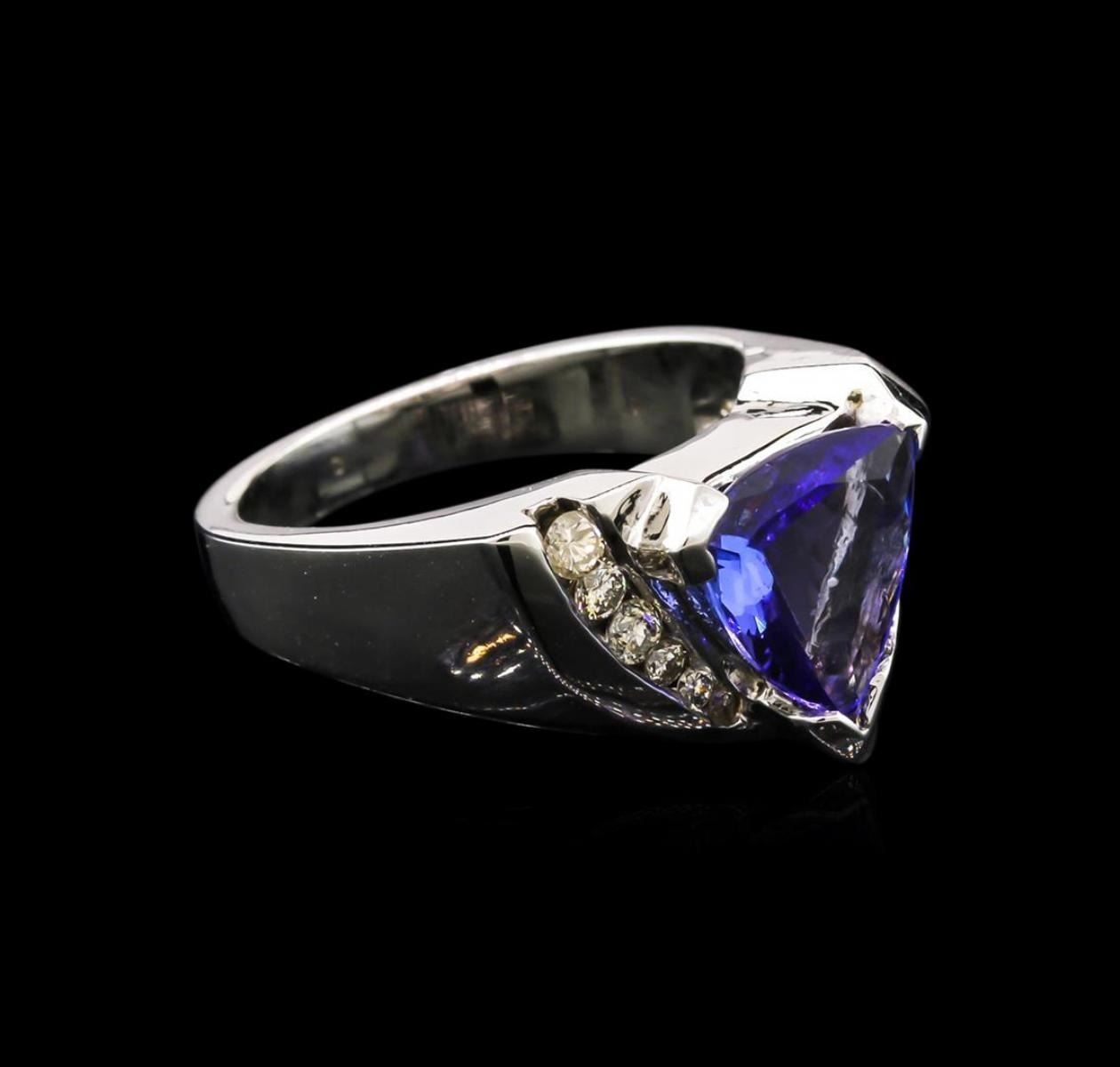 One electronically tested 14KT white gold lady's cast fashion ring with a tapered shank with a bright polish finish. The featured lady's ring has a shank measuring 3.23 millimeters wide. Identified with markings of "14K". Condition is new, good workmanship. Containing: One prong set triangle modified brilliant cut natural tanzanite, measuring 9.55 x 9.05 x 4.25mm, approximate weight of 2.20 ct., clarity is eye clean, type I, medium, very slightly grayish, bluish violet color, (GIA bV 5/3), cut is good. Transmitting light with no distortion, transparent. Colored gemstones are presumed to have been subjected to commonly used enhancement processes. Graded in the setting. Three channel set round brilliant cut diamonds, measuring 2.10 - 2.05 x 1.35mm (depth est.) approximate total weight of 3 Stones = 0.11ct. Graded in the setting. Clarity: SI-2 to I-1. Color: H - I. Cut Good Three channel set round brilliant cut diamonds, measuring 1.55 - 1.50 x 0.99mm (depth est.) approximate total weight of 3 Stones = 0.04ct. Graded in the setting. Clarity: SI-2 to I-1. Color: H - I. Cut Good. Total Weight of Colored Stones 2.20 ct. Total Weight of Diamonds 0.15ct. Total Weight of Ring 7.90gm. GAS Appraised.