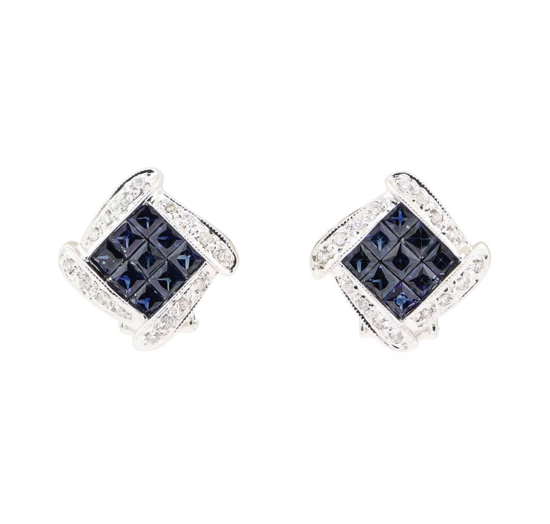 One pair electronically tested 14KT white gold lady's combination cast & assembled fashion earrings with Omega clip backs with posts with a bright polish with milgrain detailing finish. The featured lady's earrings have a drop of approxiamtely 16 millimeters. Identified with markings of '14K'. Condition is new, good workmanship. Containing: Eighteen invisible set princess modified mixed cut natural blue sapphires, measuring 2.60 x 2.55 x 1.66mm, (depth est.) approximate total weight of 2.00 ct., clarity is eye clean, medium, strong, blue color, (GIA B 5/5), cut is very good. Transmitting light with no distortion, transparent. Colored gemstones are presumed to have been subjected to commonly used enhancement processes. Graded in the setting. Thirty-Two prong set round brilliant cut diamonds, measuring 1.20 - 1.20 x 0.74mm (depth est.) approximate total weight of 32 Stones = 0.21ct. Graded in the setting. Color H - I Clarity SI-2 to I-1 Cut Good. Total Weight of Colored Stones 2.00 ct.. Total Weight of Diamonds 0.21ct.. Total Weight of Earrings 5.80gm GAS Appraised at $3460.00. GAS Appraised.