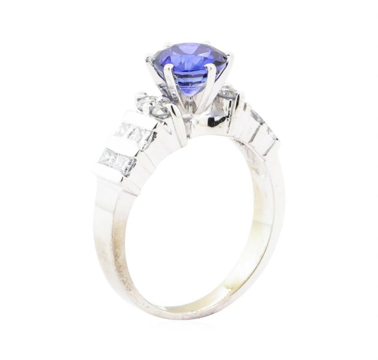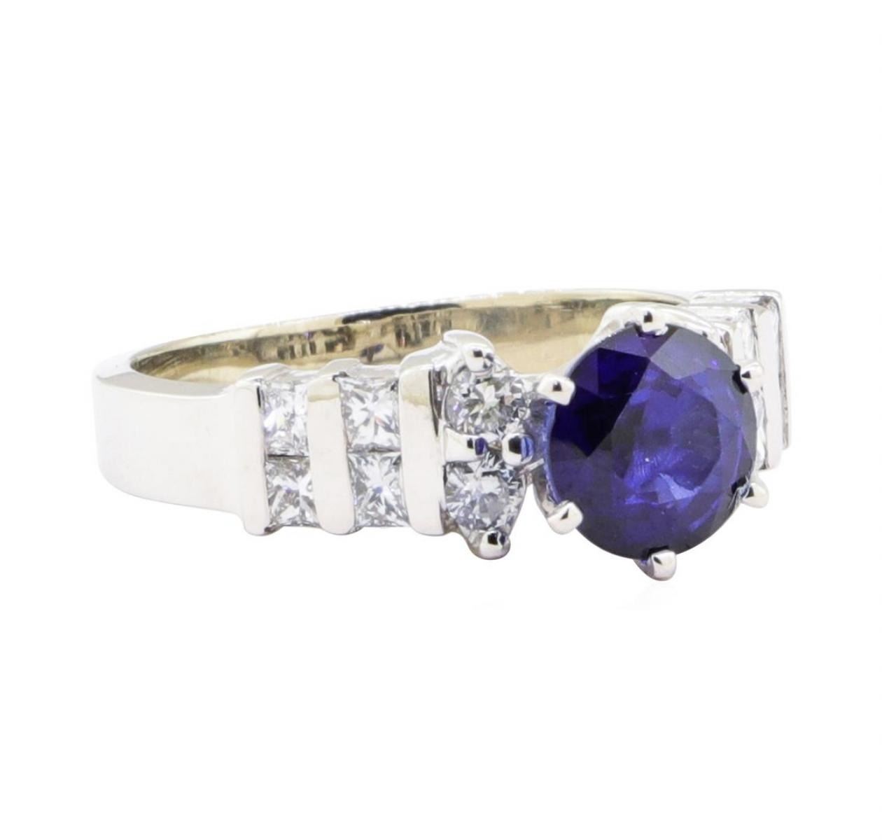 One electronically tested 14KT white gold lady's combination cast & assembled fashion straight line ring with a cathedral shank with a bright polish finish. The featured lady's ring has a shank measuring 2.40 millimeters in width. Identified with markings of '14K'. Condition is new, good workmanship. Containing: One prong set round modified brilliant cut natural blue sapphire, measuring 6.85 - 6.82 x 4.45 mm, (depth est.) approximate weight of 1.66ct., clarity is eye clean, medium dark, moderately strong, blue color, (GIA B 6/4), cut is very good. Transmitting light with no distortion, transparent. Colored gemstones are presumed to have been subjected to commonly used enhancement processes. Graded in the setting. Four prong set round brilliant cut diamonds, measuring 2.40 - 2.35 x 1.46mm (depth est.) approximate total weight of 4 Stones = 0.20ct. Graded in the setting. Color G - H Clarity SI-1 to SI-2 Cut Very Good Eight channel set princess cut diamonds, measuring 2.10 x 1.90 x 1.43mm (depth est.) approximate total weight of 8 Stones = 0.35ct. Graded in the setting. Color G - I Clarity VS-1 to VS-2 Cut Very Good. Total Weight of Colored Stones 1.66ct.. Total Weight of Diamonds 0.55ct.. Total Weight of Ring 4.70gm GAS Appraised at $3450.00. GAS Appraised.