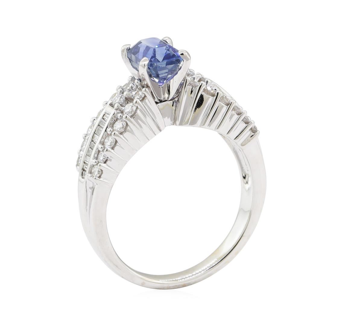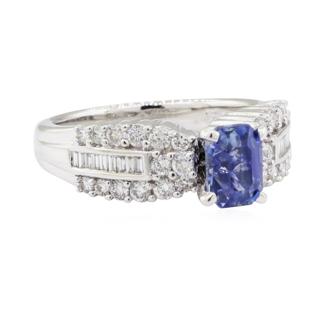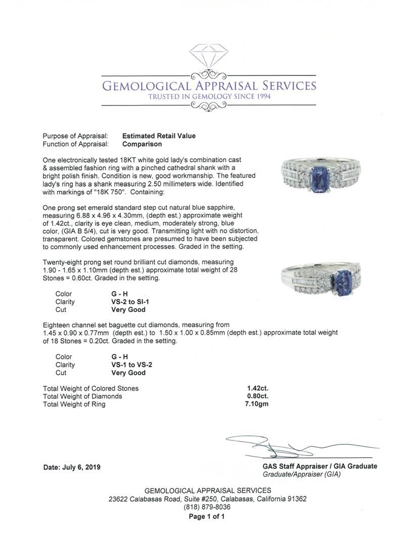One electronically tested 18KT white gold lady's combination cast & assembled fashion ring with a pinched cathedral shank with a bright polish finish. The featured lady's ring has a shank measuring 2.50 millimeters wide. Identified with markings of '18K 750'. Condition is new, good workmanship. Containing: One prong set emerald standard step cut natural blue sapphire, measuring 6.88 x 4.96 x 4.30mm, (depth est.) approximate weight of 1.42ct., clarity is eye clean, medium, moderately strong, blue color, (GIA B 5/4), cut is very good. Transmitting light with no distortion, transparent. Colored gemstones are presumed to have been subjected to commonly used enhancement processes. Graded in the setting. Twenty-Eight prong set round brilliant cut diamonds, measuring 1.90 - 1.65 x 1.10mm (depth est.) approximate total weight of 28 Stones = 0.60ct. Graded in the setting. Color G - H Clarity VS-2 to SI-1 Cut Very Good Eighteen channel set baguette cut diamonds, measuring from 1.45 x 0.90 x 0.77mm (depth est.) to 1.50 x 1.00 x 0.85mm (depth est.) approximate total weight of 18 Stones = 0.20ct. Graded in the setting. Color G - H Clarity VS-1 to VS-2 Cut Very Good. Total Weight of Colored Stones 1.42ct.. Total Weight of Diamonds 0.80ct.. Total Weight of Ring 7.10gm GAS Appraised at $6775.00. GAS Appraised.