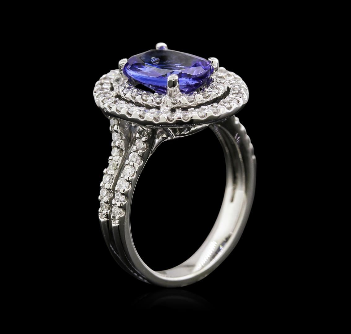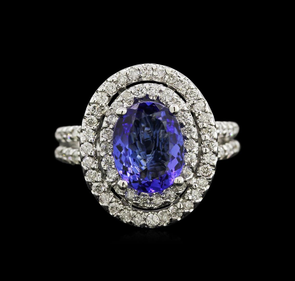 One electronically tested 14KT white gold lady's cast fashion ring with a split shank with a bright polish finish. The featured lady's ring has a double halo motif with a shank measuring 3.20 millimeters in width. Identified with markings of "14K". Condition is new, good workmanship. Containing: One prong set oval modified brilliant cut natural tanzanite, measuring 9.60 x 7.46 x 4.50mm, approximate weight of 2.22ct., clarity is eye clean, type I, medium, very slightly grayish, violetish blue color, (GIA vB 5/3), cut is good. Transmitting light with no distortion, transparent. Colored gemstones are presumed to have been subjected to commonly used enhancement processes. Graded in the setting. Eighty-Two shared prong set round brilliant cut diamonds, measuring 1.30 - 1.25 x 0.83mm (depth est.) approximate total weight of 82 Stones = 0.72ct. Graded in the setting. Clarity: SI-2 to I-1. Color: H - I. Cut Good. Total Weight of Colored Stones 2.22ct. Total Weight of Diamonds 0.72ct. Total Weight of Ring 7.10gm.