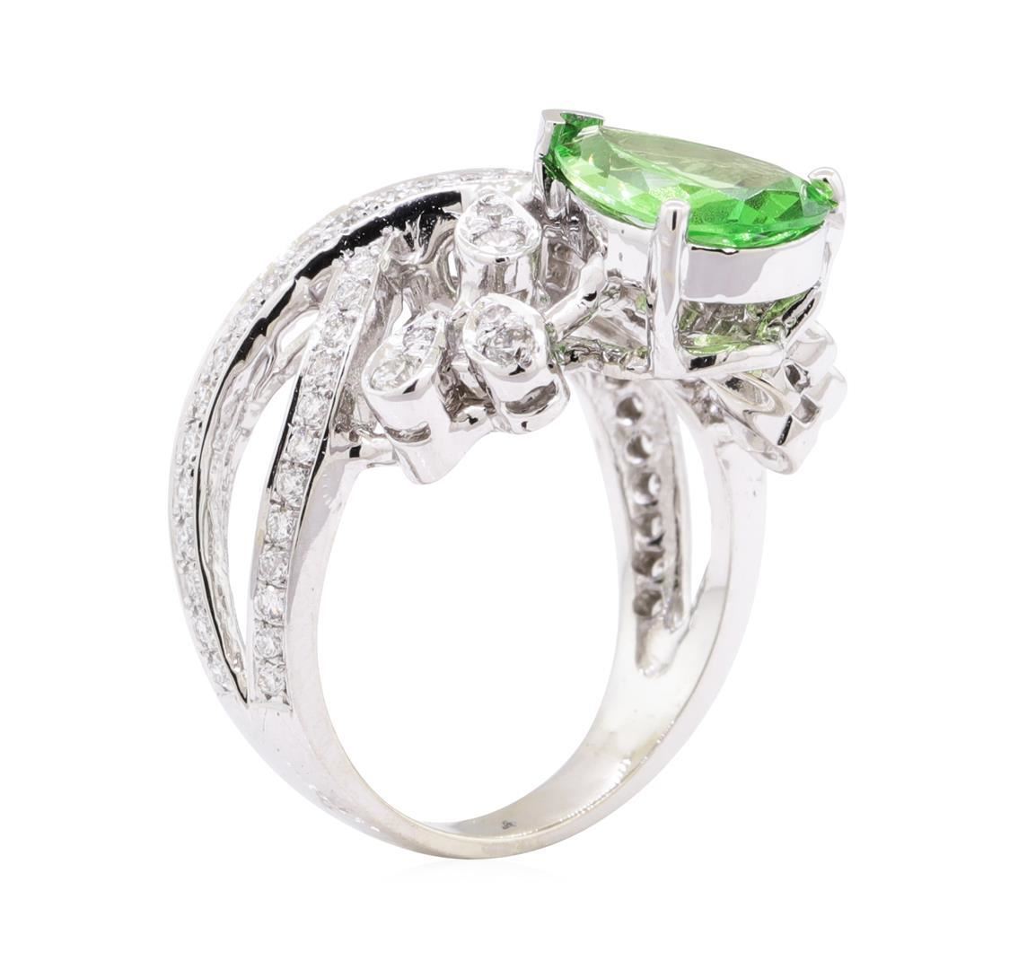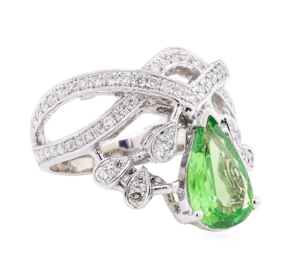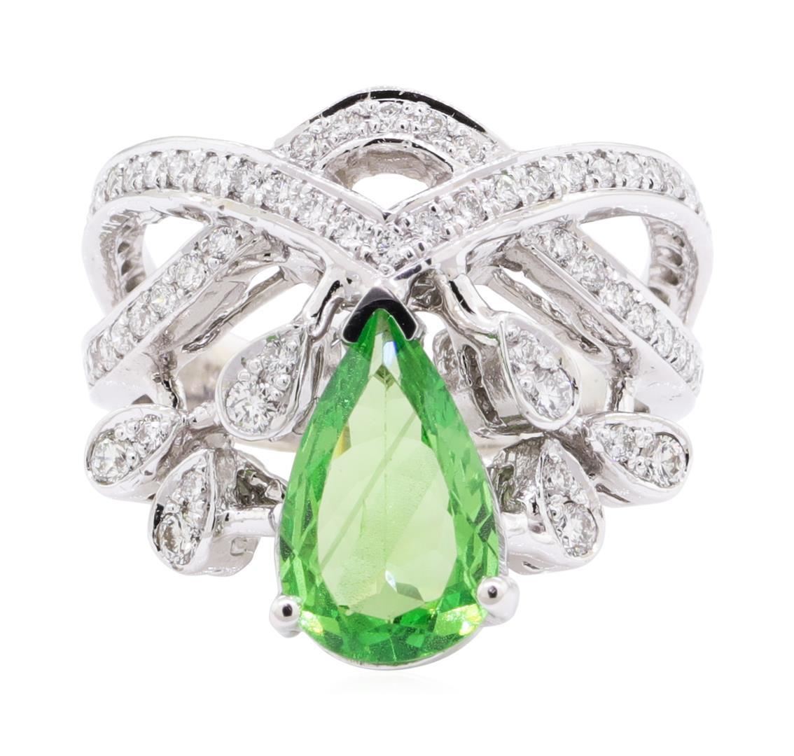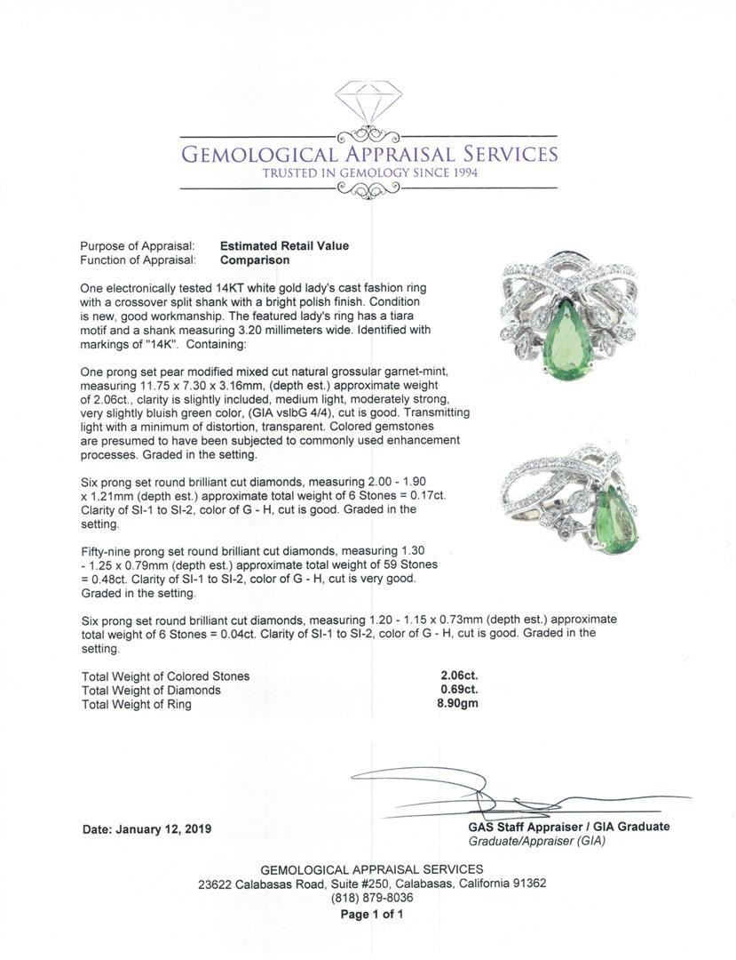 One electronically tested 14KT white gold lady's cast fashion ring with a crossover split shank with a bright polish finish. The featured lady's ring has a tiara motif and a shank measuring 3.20 millimeters wide. Identified with markings of '14K'. Condition is new, good workmanship. Containing: One prong set pear modified mixed cut natural grossular garnet-mint, measuring 11.75 x 7.30 x 3.16mm, (depth est.) approximate weight of 2.06ct., clarity is slightly included, medium light, moderately strong, very slightly bluish green color, (GIA vslbG 4/4), cut is good. Transmitting light with a minimum of distortion, transparent. Colored gemstones are presumed to have been subjected to commonly used enhancement processes. Graded in the setting. Six prong set round brilliant cut diamonds, measuring 2.00 - 1.90 x 1.21mm (depth est.) approximate total weight of 6 Stones = 0.17ct. Graded in the setting. Color G - H Clarity SI-1 to SI-2 Cut Good Fifty-Nine prong set round brilliant cut diamonds, measuring 1.30 - 1.25 x 0.79mm (depth est.) approximate total weight of 59 Stones = 0.48ct. Graded in the setting. Color G - H Clarity SI-1 to SI-2 Cut Very Good Six prong set round brilliant cut diamonds, measuring 1.20 - 1.15 x 0.73mm (depth est.) approximate total weight of 6 Stones = 0.04ct. Graded in the setting. Color G - H Clarity SI-1 to SI-2 Cut Good. Total Weight of Colored Stones 2.06ct.. Total Weight of Diamonds 0.69ct.. Total Weight of Ring 8.90gm GAS Appraised at $5050.00. GAS Appraised.