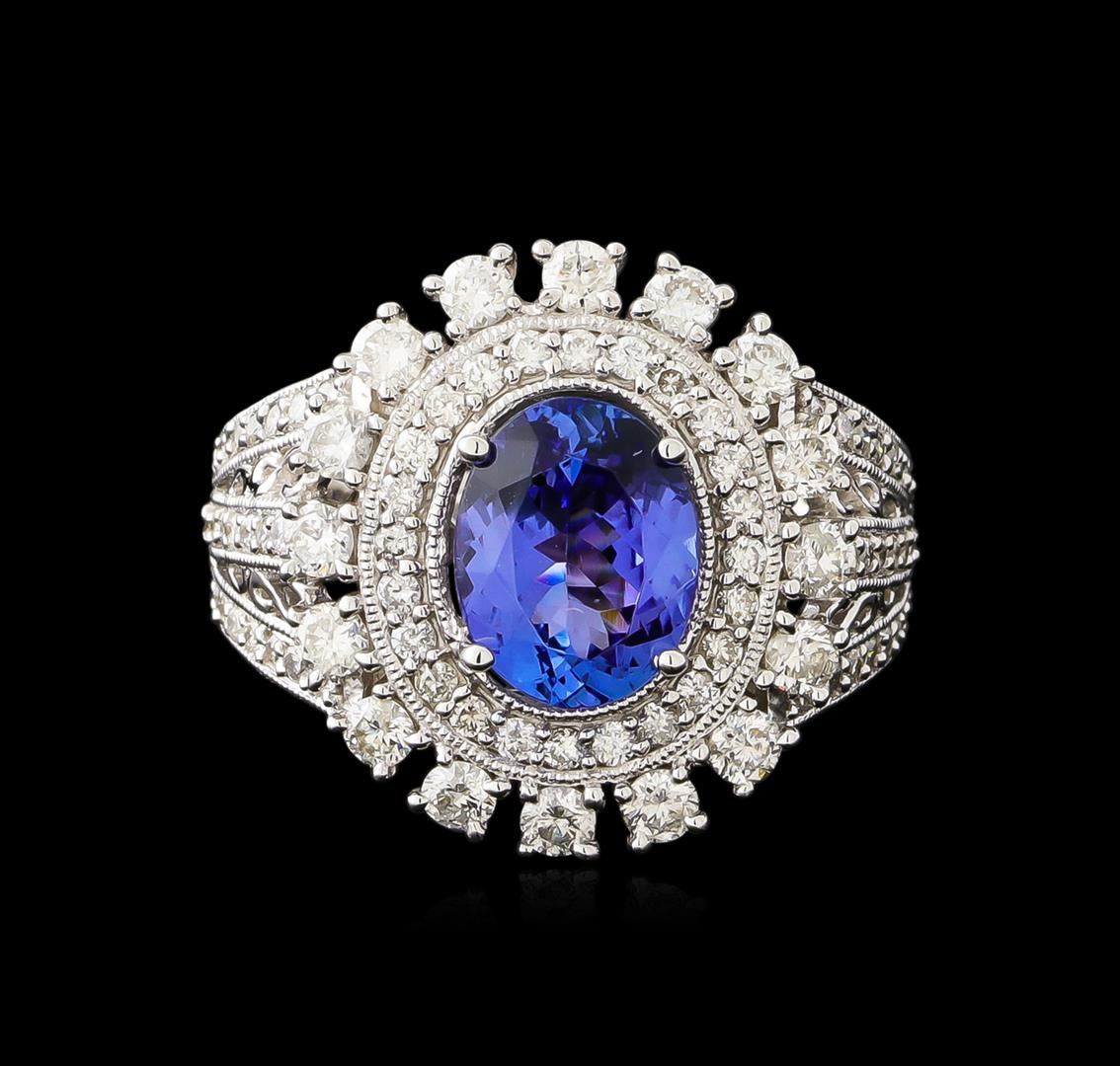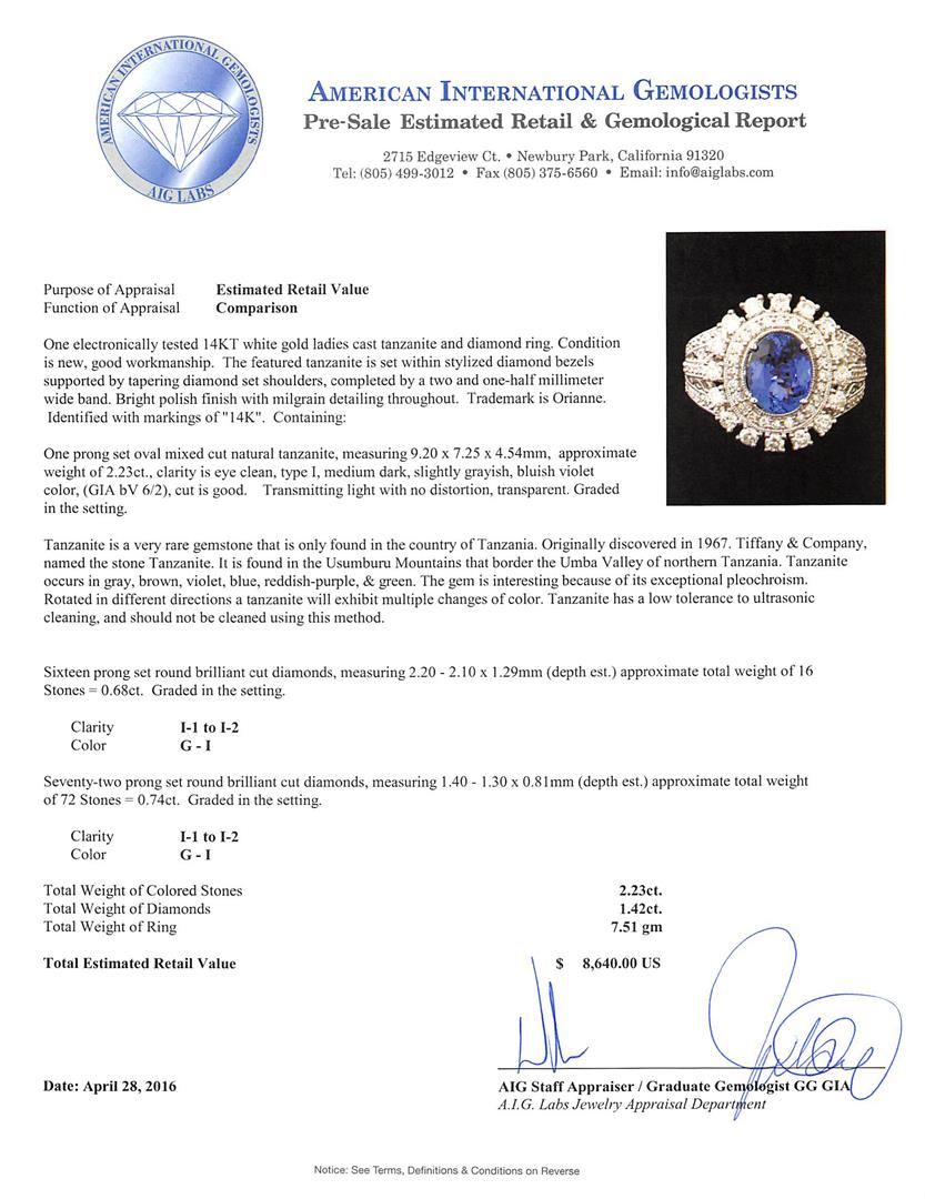 One electronically tested 14KT white gold ladies cast tanzanite and diamond ring. The featured tanzanite is set within stylized diamond bezels supported by tapering diamond set shoulders, completed by a two and one-half millimeter wide band. Bright polish finish with milgrain detailing throughout. Trademark is Orianne. Identified with markings of "14K". Condition is new, good workmanship. Containing: One prong set oval mixed cut natural tanzanite, measuring 9.20 x 7.25 x 4.54mm, approximate weight of 2.23ct., clarity is eye clean, type I, medium dark, slightly grayish, bluish violet color, (GIA bV 6/2), cut is good. Transmitting light with no distortion, transparent. Graded in the setting. Tanzanite is a very rare gemstone that is only found in the country of Tanzania. Originally discovered in 1967. Tiffany & Company, named the stone Tanzanite. It is found in the Usumburu Mountains that border the Umba Valley of northern Tanzania. Tanzanite occurs in gray, brown, violet, blue, reddish-purple, & green. The gem is interesting because of its exceptional pleochroism. Rotated in different directions a tanzanite will exhibit multiple changes of color. Tanzanite has a low tolerance to ultrasonic cleaning, and should not be cleaned using this method. Sixteen prong set round brilliant cut diamonds, measuring 2.20 - 2.10 x 1.29mm (depth est.) approximate total weight of 16 Stones = 0.68ct. Graded in the setting. Clarity: I-1 to I-2. Color: G - I Seventy-Two prong set round brilliant cut diamonds, measuring 1.40 - 1.30 x 0.81mm (depth est.) approximate total weight of 72 Stones = 0.74ct. Graded in the setting. Clarity: I-1 to I-2. Color: G - I. Total Weight of Colored Stones 2.23ct. Total Weight of Diamonds 1.42ct. Total Weight of Ring 7.51gm. AIG Appraised at $8,640.00.