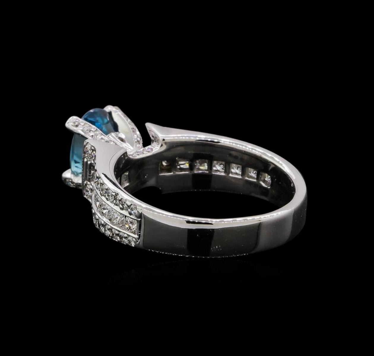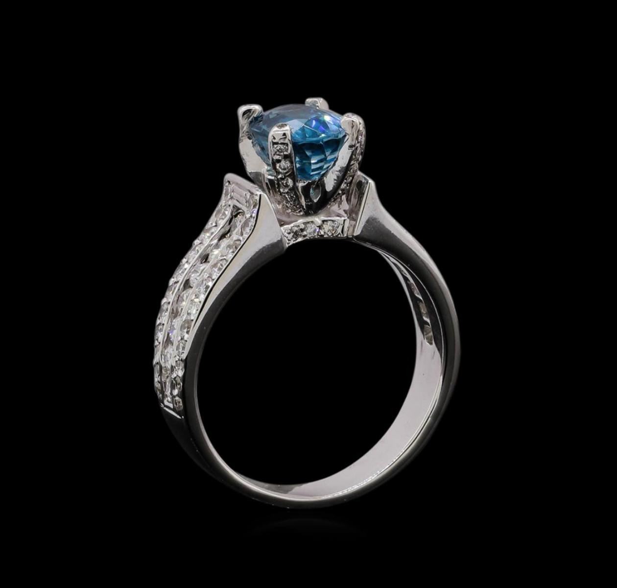 One electronically tested 18KT white gold ladies cast & assembled blue zircon and diamond ring. The featured blue zircon is set within a diamond set basket supported by diamond set tapering shoulders, completed by a three millimeter wide band. Bright and patterned finish. Condition is new, good workmanship. Containing: One prong set oval mixed cut natural blue zircon, measuring 7.70 x 5.70 x 4.80mm, 8%. bulge factor, approximate weight of 2.25ct., clarity is eye clean, type I, medium, moderately strong, very strongly greenish blue color, (GIA vstgB 5/4), cut is good. Transmitting light with no distortion, transparent. Graded in the setting. Fourteen prong set round brilliant cut diamonds, measuring 2.00 - 1.70 x 1.11mm (depth est.) approximate total weight of 14 Stones = 0.35ct. Graded in the setting. Clarity SI-1 to SI-2. Color: F - H Thirty-Two prong set round brilliant cut diamonds, measuring 1.50 - 1.10 x 0.78mm (depth est.) approximate total weight of 32 Stones = 0.28ct. Graded in the setting. Clarity SI-1 to SI-2. Color: F - H Thirty-Four prong set round brilliant cut diamonds, measuring 1.00 - 1.00 x 0.60mm (depth est.) approximate total weight of 34 Stones = 0.15ct. Graded in the setting. Clarity SI-1 to I-1. Color: F - H. Total Weight of Colored Stones 2.25ct.. Total Weight of Diamonds 0.78ct.. Total Weight of Ring 6.05gm. AIG Appraised.