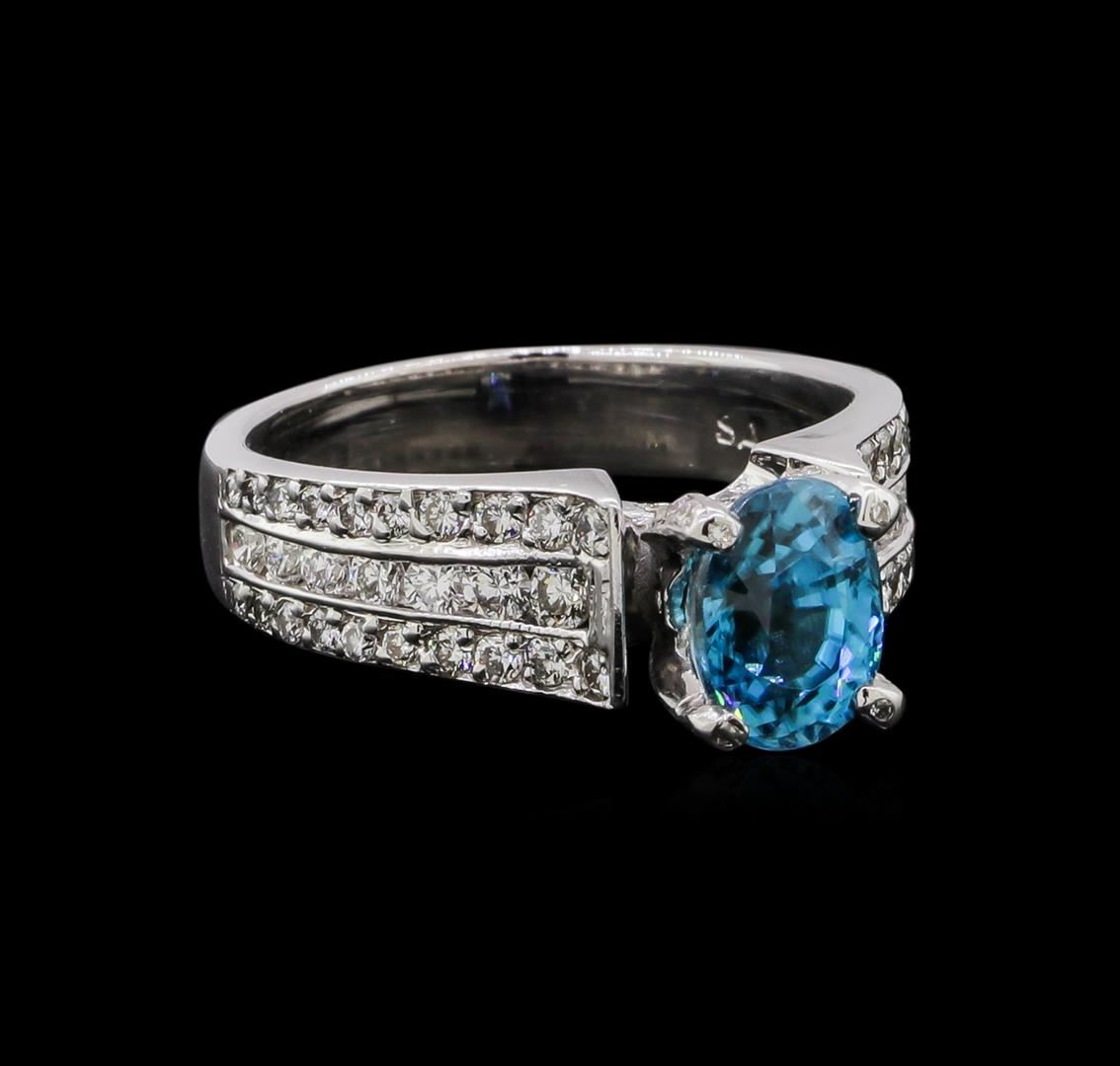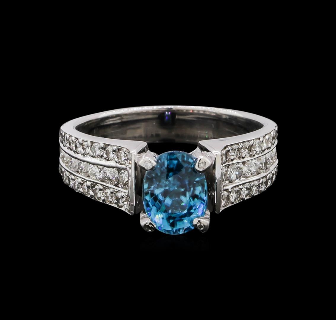 One electronically tested 18KT white gold ladies cast & assembled blue zircon and diamond ring. The featured blue zircon is set within a diamond set basket supported by diamond set tapering shoulders, completed by a three millimeter wide band. Bright and patterned finish. Condition is new, good workmanship. Containing: One prong set oval mixed cut natural blue zircon, measuring 7.70 x 5.70 x 4.80mm, 8%. bulge factor, approximate weight of 2.25ct., clarity is eye clean, type I, medium, moderately strong, very strongly greenish blue color, (GIA vstgB 5/4), cut is good. Transmitting light with no distortion, transparent. Graded in the setting. Fourteen prong set round brilliant cut diamonds, measuring 2.00 - 1.70 x 1.11mm (depth est.) approximate total weight of 14 Stones = 0.35ct. Graded in the setting. Clarity SI-1 to SI-2. Color: F - H Thirty-Two prong set round brilliant cut diamonds, measuring 1.50 - 1.10 x 0.78mm (depth est.) approximate total weight of 32 Stones = 0.28ct. Graded in the setting. Clarity SI-1 to SI-2. Color: F - H Thirty-Four prong set round brilliant cut diamonds, measuring 1.00 - 1.00 x 0.60mm (depth est.) approximate total weight of 34 Stones = 0.15ct. Graded in the setting. Clarity SI-1 to I-1. Color: F - H. Total Weight of Colored Stones 2.25ct.. Total Weight of Diamonds 0.78ct.. Total Weight of Ring 6.05gm. AIG Appraised.