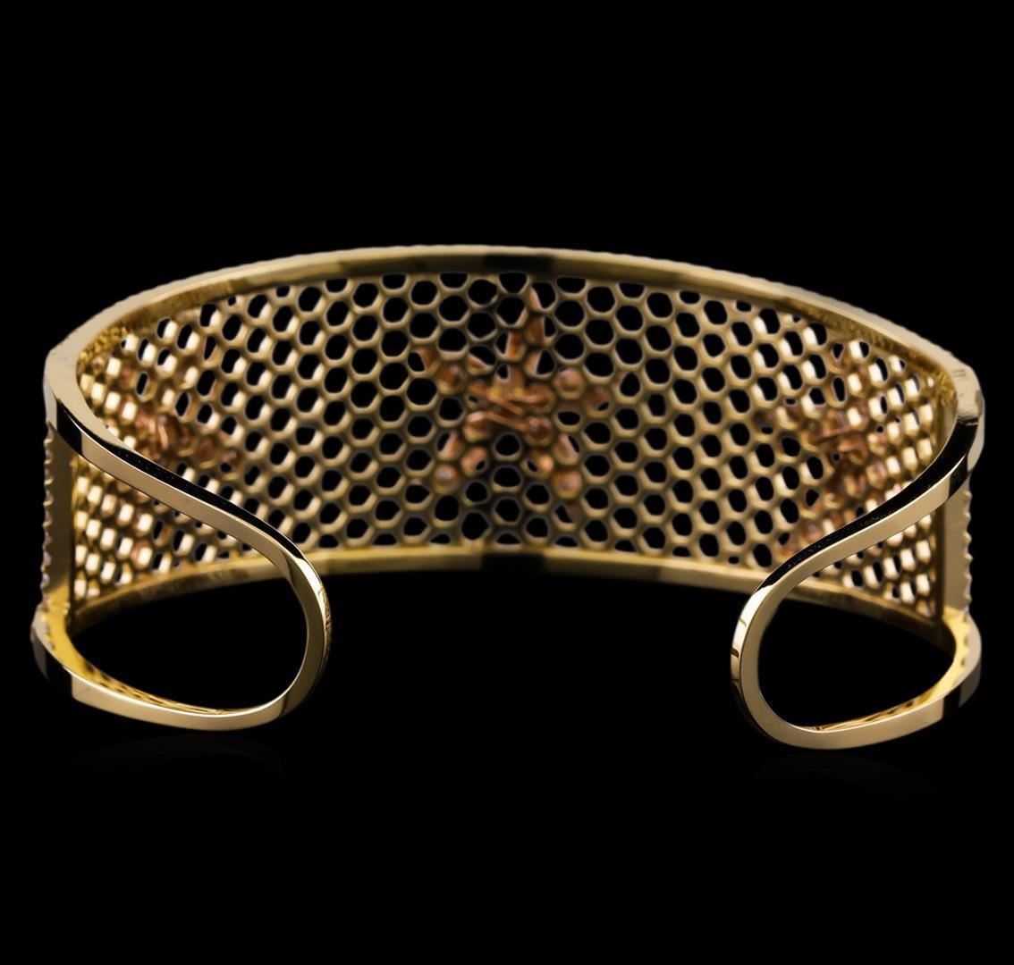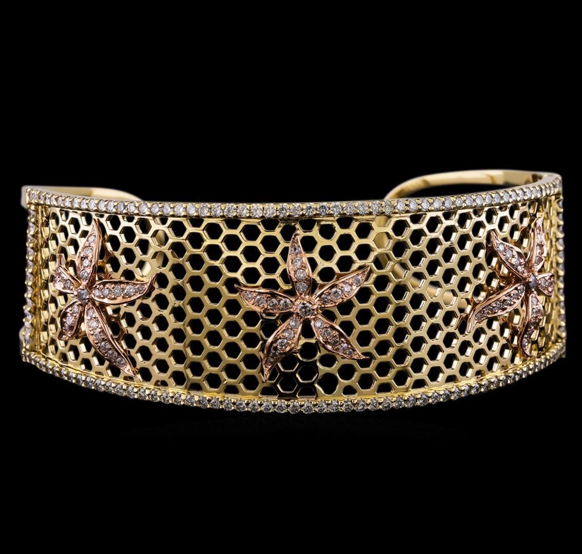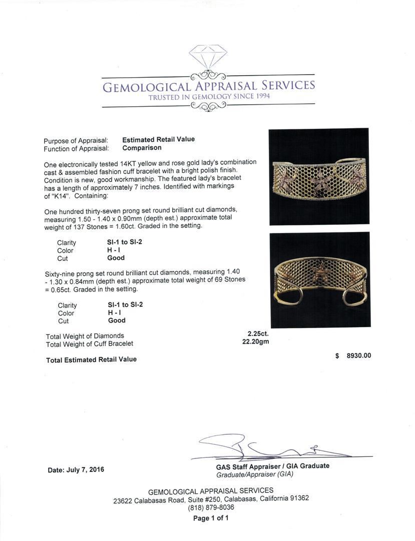 One electronically tested 14KT yellow and rose gold lady's combination cast & assembled fashion cuff bracelet with a bright polish finish. The featured lady's bracelet has a length of approximately 7 inches. Identified with markings of "K14". Condition is new, good workmanship. Containing: One Hundred Thirty-Seven prong set round brilliant cut diamonds, measuring 1.50 - 1.40 x 0.90mm (depth est.) approximate total weight of 137 Stones = 1.60ct. Graded in the setting. Clarity: SI-1 to SI-2. Color: H - I. Cut Good Sixty-Nine prong set round brilliant cut diamonds, measuring 1.40 - 1.30 x 0.84mm (depth est.) approximate total weight of 69 Stones = 0.65ct. Graded in the setting. Clarity: SI-1 to SI-2. Color: H - I. Cut Good. Total Weight of Diamonds 2.25ct. Total Weight of Cuff Bracelet 22.20gm. GAS Appraised.