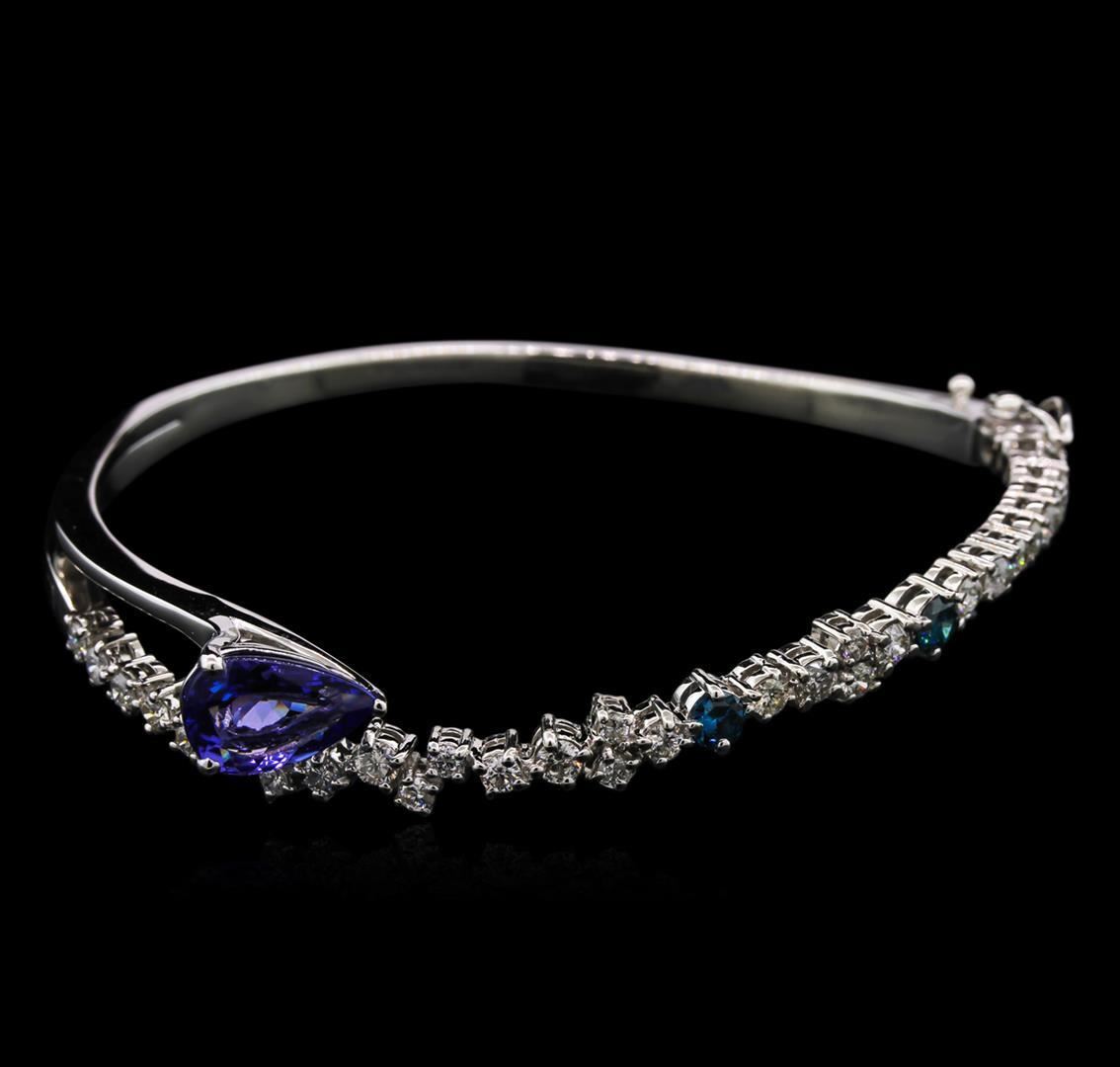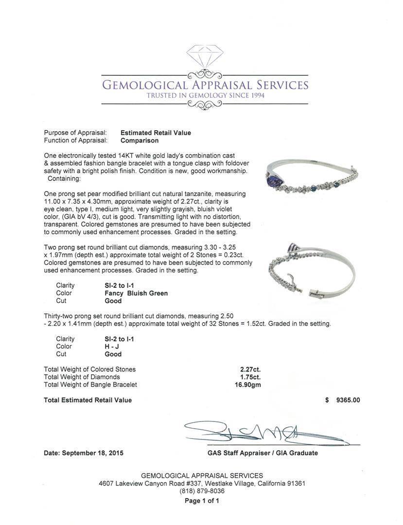 One electronically tested 14KT white gold lady's combination cast & assembled fashion bangle bracelet with a tongue clasp with foldover safety with a bright polish finish. Condition is new, good workmanship. Containing: One prong set pear modified brilliant cut natural tanzanite, measuring 11.00 x 7.35 x 4.30mm, approximate weight of 2.27ct., clarity is eye clean, type I, medium light, very slightly grayish, bluish violet color, (GIA bV 4/3), cut is good. Transmitting light with no distortion, transparent. Colored gemstones are presumed to have been subjected to commonly used enhancement processes. Graded in the setting. Two prong set round brilliant cut diamonds, measuring 3.30 - 3.25 x 1.97mm (depth est.) approximate total weight of 2 Stones = 0.23ct. Colored gemstones are presumed to have been subjected to commonly used enhancement processes. Graded in the setting. Clarity: SI-2 to I-1 Cut Good Thirty-Two prong set round brilliant cut diamonds, measuring 2.50 - 2.20 x 1.41mm (depth est.) approximate total weight of 32 Stones = 1.52ct. Graded in the setting. Clarity: SI-2 to I-1. Color: H - Good. Total Weight of Colored Stones 2.27ct. Total Weight of Diamonds 1.75ct. Total Weight of Bangle Bracelet 16.90gm.