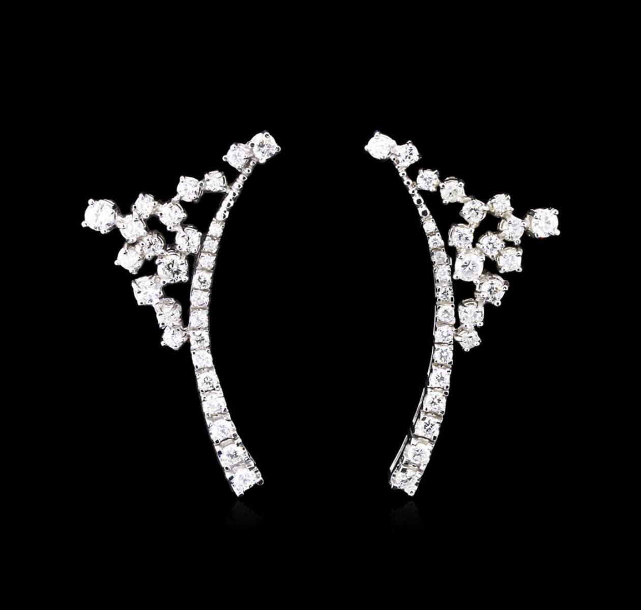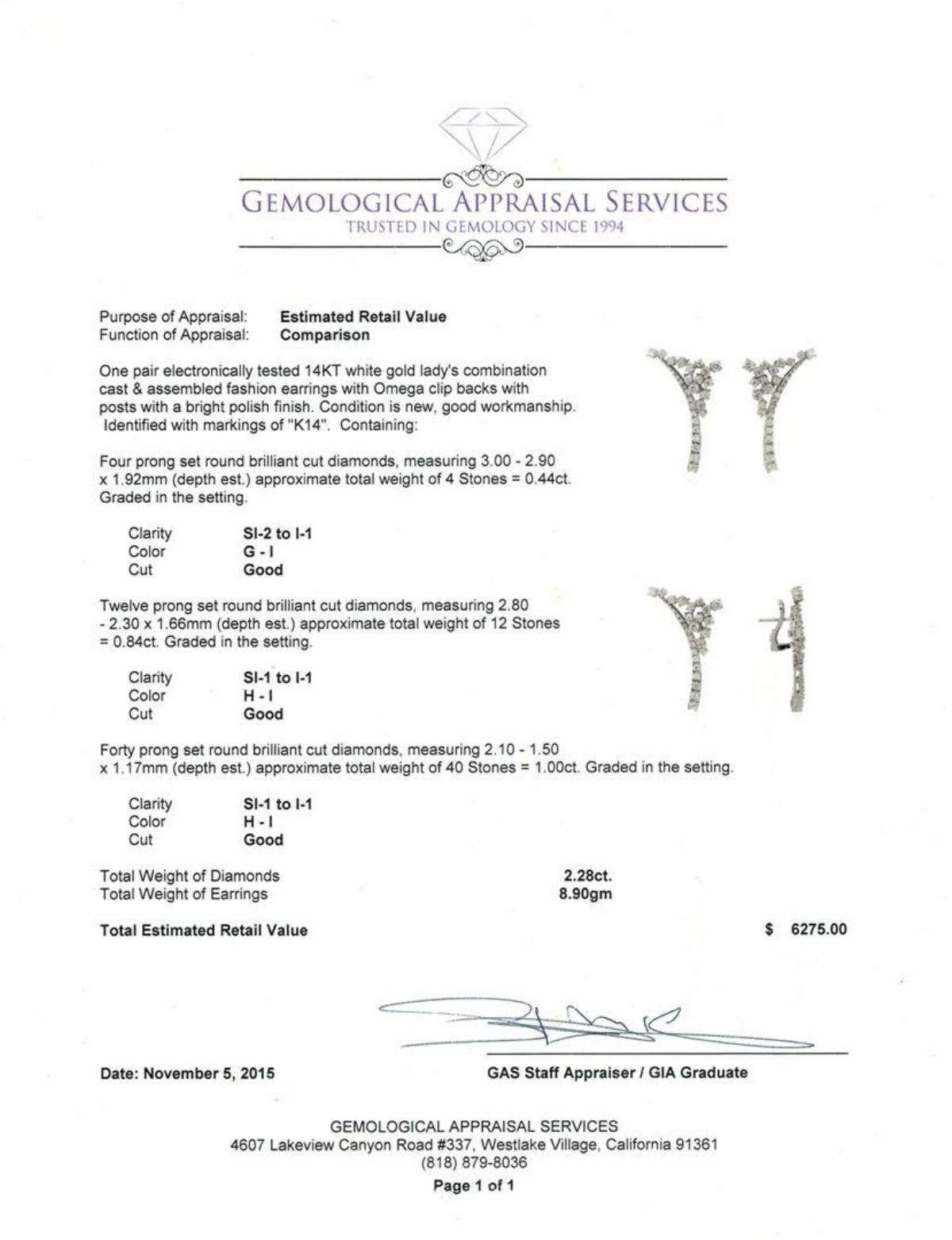 One pair electronically tested 14KT white gold lady's combination cast & assembled fashion earrings with Omega clip backs with posts with a bright polish finish. Identified with markings of "K14". Condition is new, good workmanship. Containing: Four prong set round brilliant cut diamonds, measuring 3.00 - 2.90 x 1.92mm (depth est.) approximate total weight of 4 Stones = 0.44ct. Graded in the setting. Clarity: SI-2 to I-1. Color: G - I. Cut Good Twelve prong set round brilliant cut diamonds, measuring 2.80 - 2.30 x 1.66mm (depth est.) approximate total weight of 12 Stones = 0.84ct. Graded in the setting. Clarity: SI-1 to I-1. Color: H - I. Cut Good Forty prong set round brilliant cut diamonds, measuring 2.10 - 1.50 x 1.17mm (depth est.) approximate total weight of 40 Stones = 1.00ct. Graded in the setting. Clarity: SI-1 to I-1. Color: H - I. Cut Good. Total Weight of Diamonds 2.28ct. Total Weight of Earrings 8.90gm. GAS Appraised.