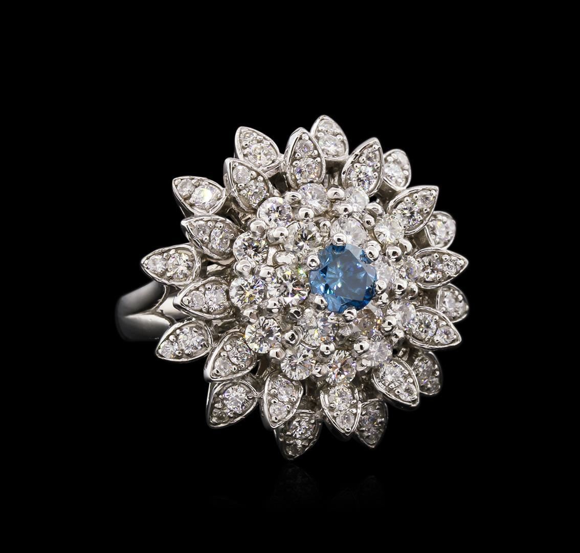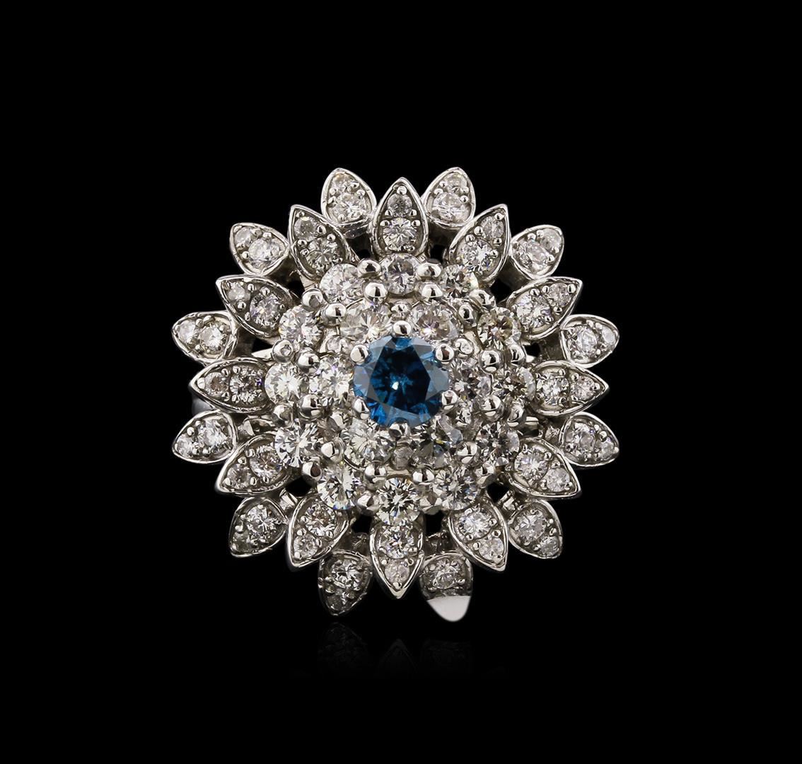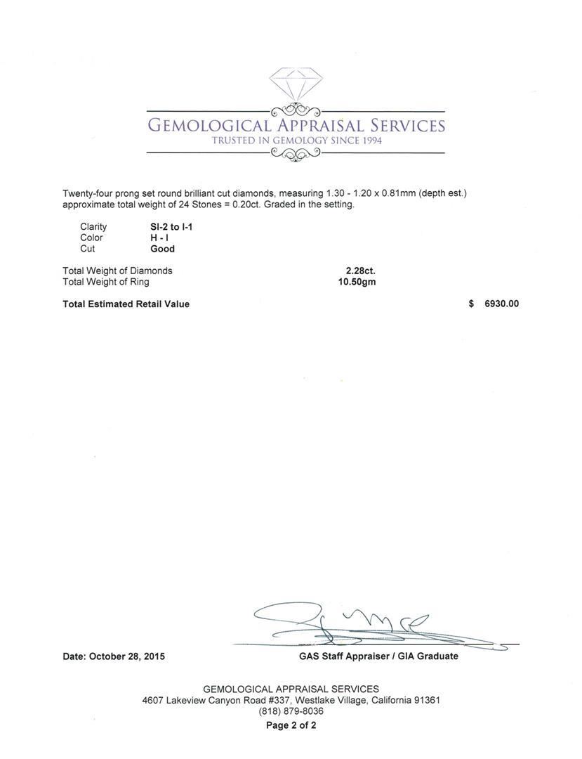 One electronically tested 14KT white gold lady's cast fashion ring with a bright polish finish. The featured ring has a shank measuring 2.70 millimeters in width. Identified with markings of "K14". Condition is new, good workmanship. Containing: One prong set round brilliant cut diamond, measuring 4.99 - 4.90 x 3.02mm (depth est.) approximate weight of 0.45ct. Graded in the setting. Clarity: SI-1 Cut Good Six prong set round brilliant cut diamonds, measuring 2.90 - 2.80 x 1.80mm (depth est.) approximate total weight of 6 Stones = 0.53ct. Graded in the setting. Clarity: SI-2 to I-1. Color: H - I. Cut Good Twelve prong set round brilliant cut diamonds, measuring 2.20 - 2.10 x 1.40mm (depth est.) approximate total weight of 12 Stones = 0.50ct. Graded in the setting. Clarity: SI-1 to I-1. Color: H - I. Cut Good Twenty-Four prong set round brilliant cut diamonds, measuring 1.90 - 1.80 x 1.20mm (depth est.) approximate total weight of 24 Stones = 0.60ct. Graded in the setting. Clarity: SI-1 to I-1. Color: H - I. Cut Good Twenty-Four prong set round brilliant cut diamonds, measuring 1.30 - 1.20 x 0.81mm (depth est.) approximate total weight of 24 Stones = 0.20ct. Graded in the setting. Clarity: SI-2 to I-1. Color: H - I. Cut Good. Total Weight of Diamonds 2.28ct. Total Weight of Ring 10.50gm. GAS Appraised.