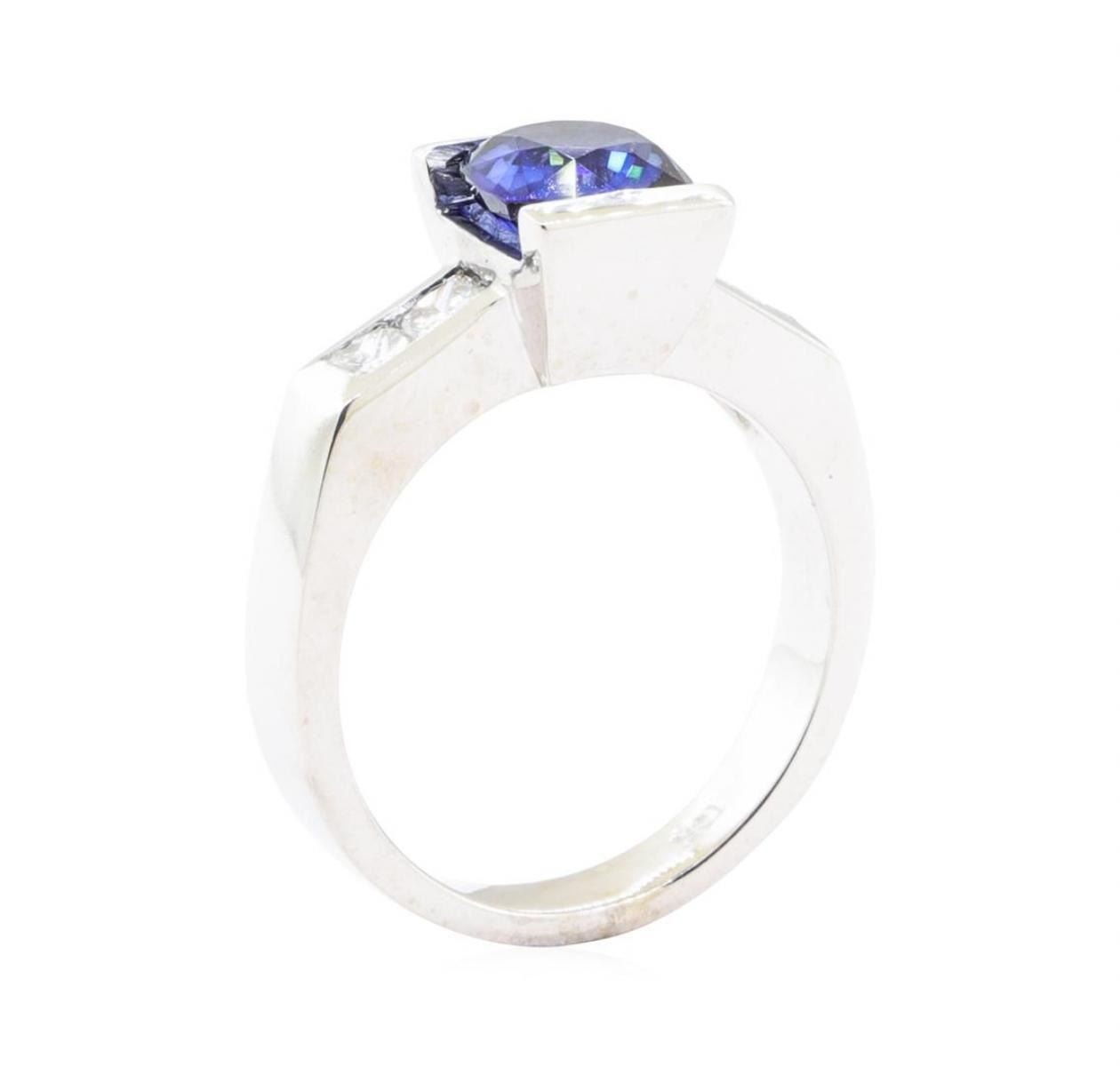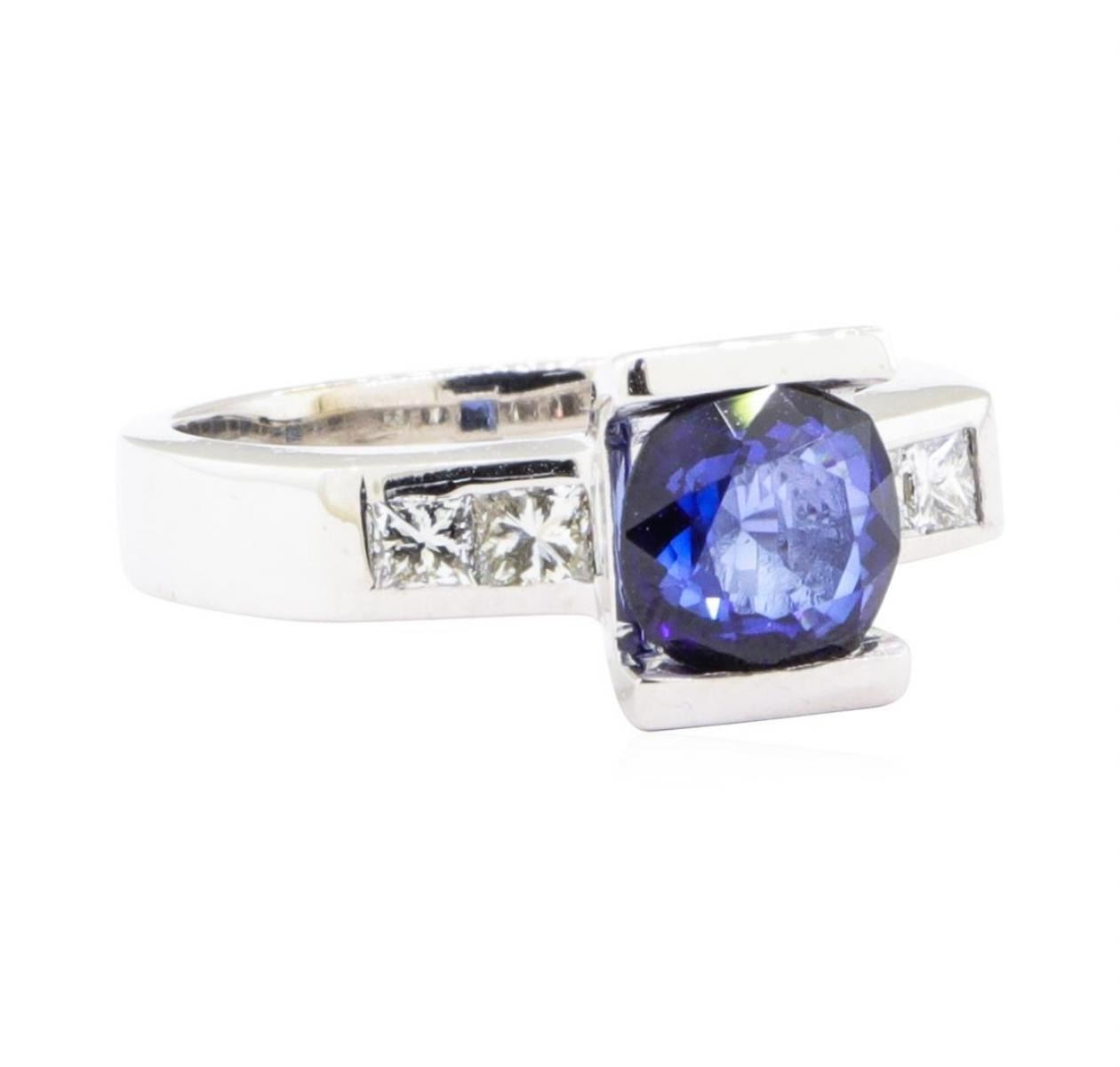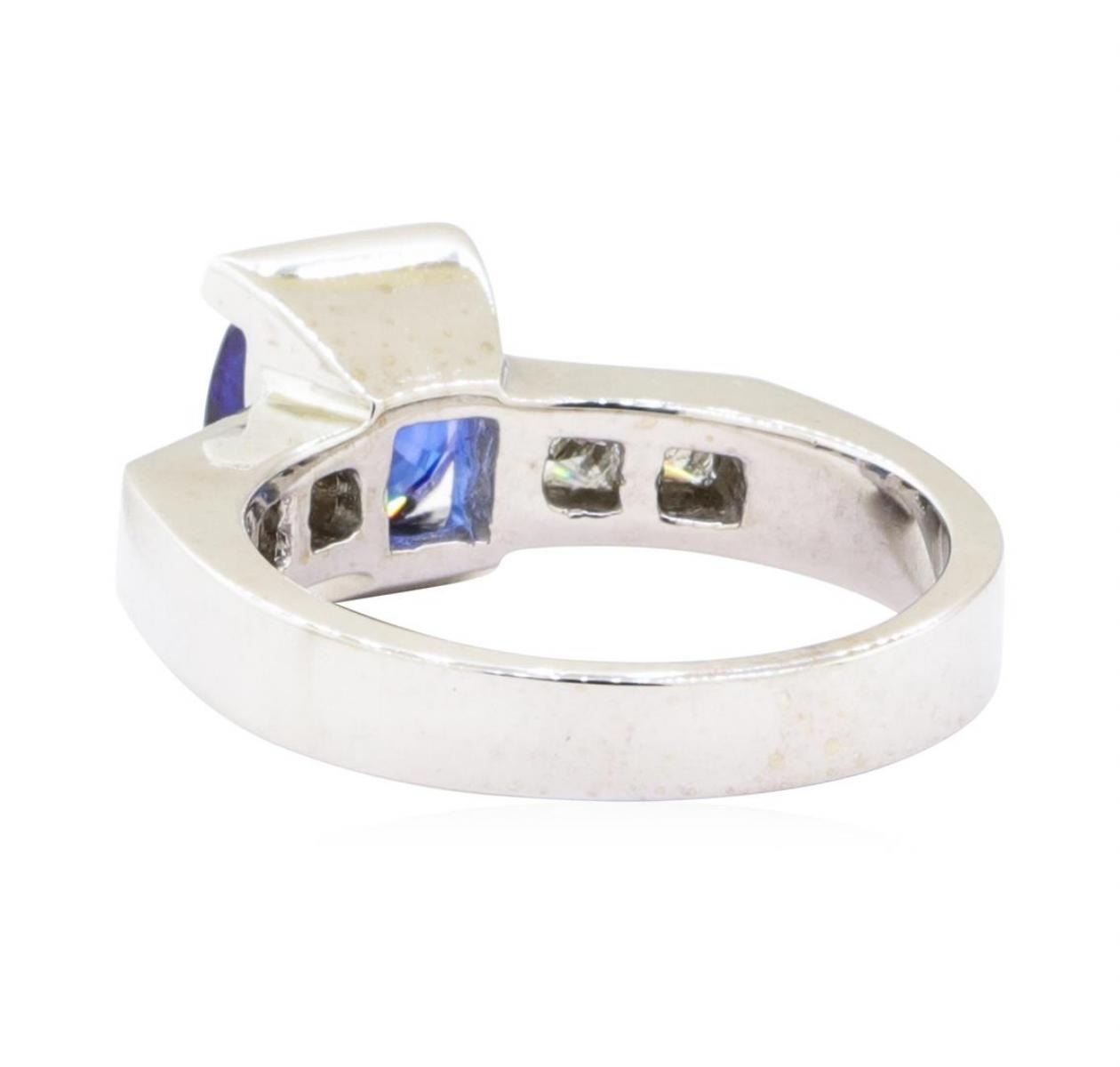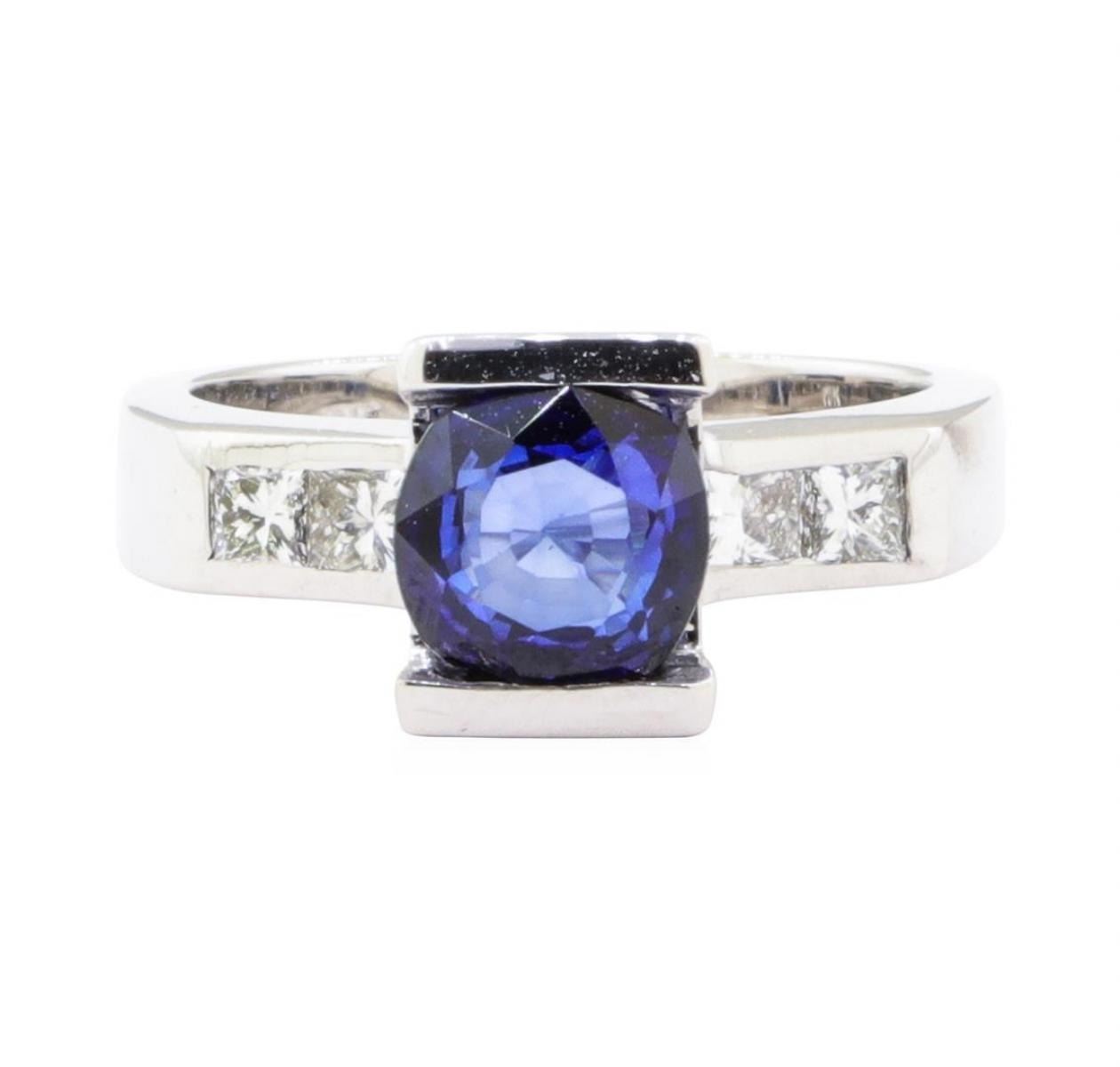 One electronically tested 18KT white gold lady's cast fashion ring with a raised shoulders with a bright polish finish. The featured lady's ring has a shank measuring 3.35 millimeters wide. Identified with markings of '18K'. Condition is new, good workmanship. Containing: One channel set square cushion modified mixed cut natural blue sapphire, measuring 7.16 x 7.10 x 3.87mm, (depth est.) approximate weight of 1.83ct., clarity is eye clean, medium dark, moderately strong, blue color, (GIA B 6/4), cut is good. Transmitting light with no distortion, transparent. Colored gemstones are presumed to have been subjected to commonly used enhancement processes. Graded in the setting. Four channel set princess cut diamonds, measuring 2.70 x 2.60 x 1.96mm (depth est.) approximate total weight of 4 Stones = 0.45ct. Graded in the setting. Color H - I Clarity VS-1 to VS-2 Cut Very Good. Total Weight of Colored Stones 1.83ct.. Total Weight of Diamonds 0.45ct.. Total Weight of Ring 7.50gm GAS Appraised at $4630.00. GAS Appraised.