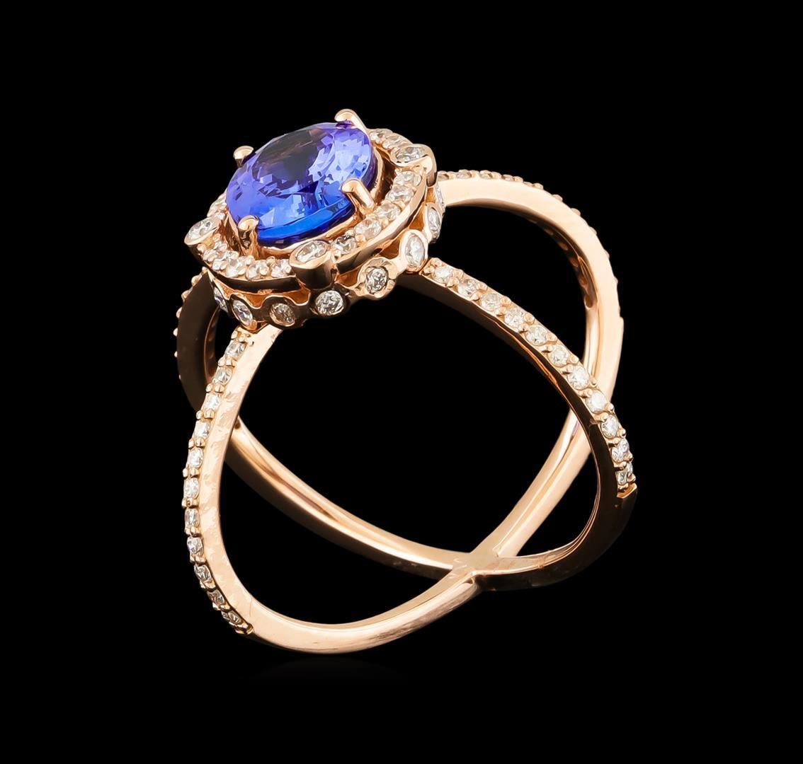One electronically tested 14KT rose gold lady's combination cast & assembled fashion ring with a crossover halo with a bright polish finish. The featured lady's ring has a shank measuring 2.70 millimeters wide. Identified with markings of "K14". Condition is new, good workmanship. Containing: One prong set oval modified brilliant cut natural tanzanite, measuring 9.52 x 7.47 x 4.36mm, 5%. bulge factor, approximate weight of 2.28ct., clarity is eye clean, type I, medium, moderately strong, violetish blue color, (GIA vB 5/4), cut is very good. Transmitting light with no distortion, transparent. Colored gemstones are presumed to have been subjected to commonly used enhancement processes. Graded in the setting. Twenty bezel set round brilliant cut diamonds, measuring 1.50 - 1.40 x 0.90mm (depth est.) approximate total weight of 20 Stones = 0.24ct. Graded in the setting. Clarity: SI-1 to SI-2. Color: G - Good Twenty prong set round brilliant cut diamonds, measuring 1.40 - 1.35 x 0.86mm (depth est.) approximate total weight of 20 Stones = 0.20ct. Graded in the setting. Clarity: SI-1 to I-1. Color: H - I. Cut Good Forty-Four prong set round brilliant cut diamonds, measuring 1.20 - 1.10 x 0.71mm (depth est.) approximate total weight of 44 Stones = 0.26ct. Graded in the setting. Clarity: SI-1 to I-1. Color: H - I. Cut Good. Total Weight of Colored Stones 2.28ct. Total Weight of Diamonds 0.70ct. Total Weight of Ring 5.10gm. GAS Appraised.