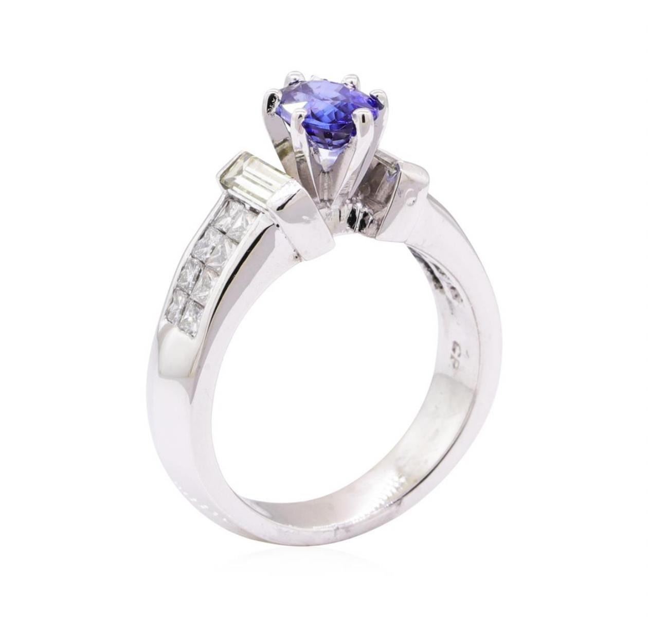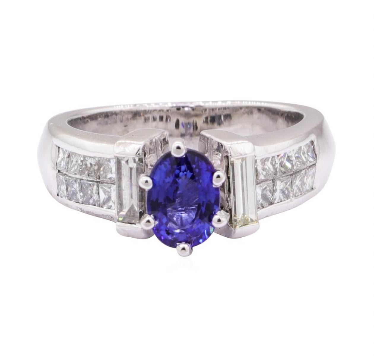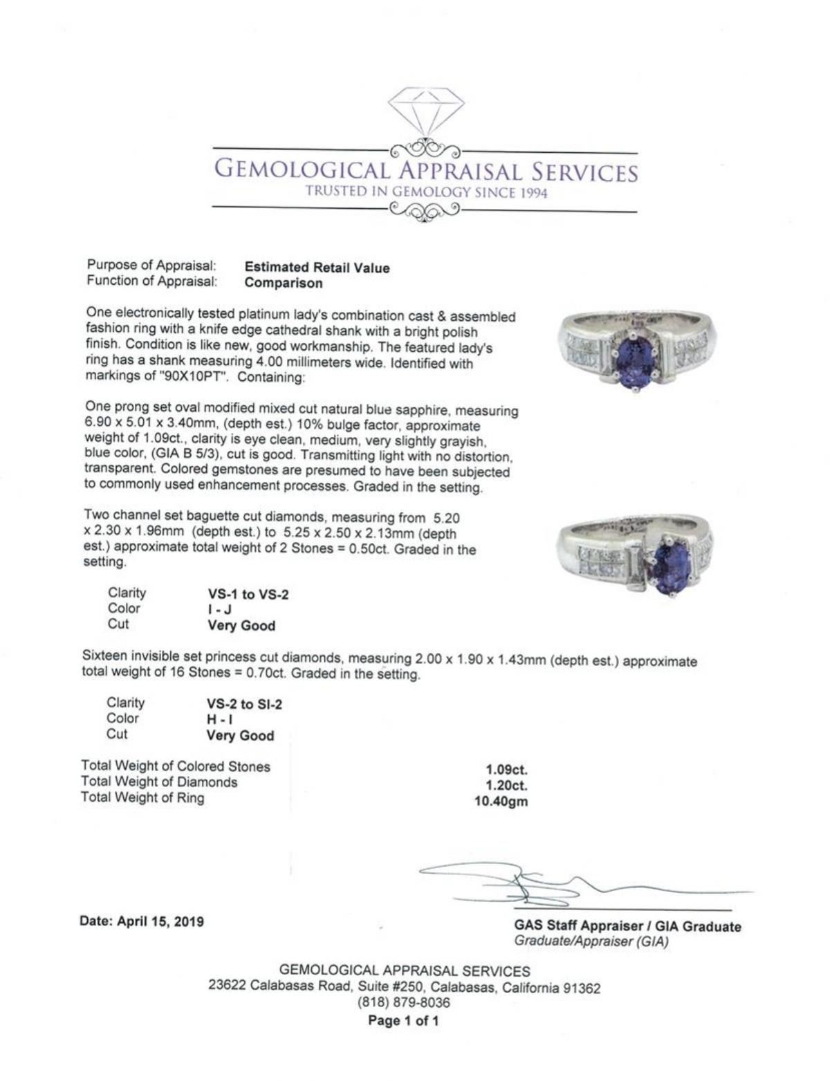 One electronically tested platinum lady's combination cast & assembled fashion ring with a knife edge cathedral shank with a bright polish finish. The featured lady's ring has a shank measuring 4.00 millimeters wide. Identified with markings of '90X10PT'. Condition is like new, good workmanship. Containing: One prong set oval modified mixed cut natural blue sapphire, measuring 6.90 x 5.01 x 3.40mm, (depth est.) 10%. bulge factor, approximate weight of 1.09ct., clarity is eye clean, medium, very slightly grayish, blue color, (GIA B 5/3), cut is good. Transmitting light with no distortion, transparent. Colored gemstones are presumed to have been subjected to commonly used enhancement processes. Graded in the setting. Two channel set baguette cut diamonds, measuring from 5.20 x 2.30 x 1.96mm (depth est.) to 5.25 x 2.50 x 2.13mm (depth est.) approximate total weight of 2 Stones = 0.50ct. Graded in the setting. Color I - J Clarity VS-1 to VS-2 Cut Very Good Sixteen invisible set princess cut diamonds, measuring 2.00 x 1.90 x 1.43mm (depth est.) approximate total weight of 16 Stones = 0.70ct. Graded in the setting. Color H - I Clarity VS-2 to SI-2 Cut Very Good. Total Weight of Colored Stones 1.09ct.. Total Weight of Diamonds 1.20ct.. Total Weight of Ring 10.40gm GAS Appraised at $6010.00. GAS Appraised.