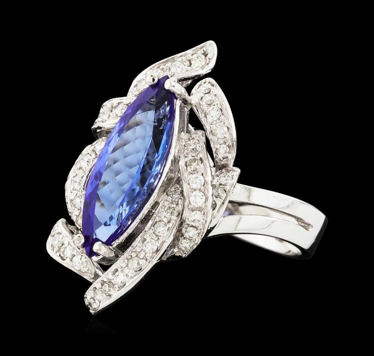 One electronically tested 14KT white gold lady's cast fashion ring with a swirled basket halo with a bright polish finish. The featured lady's ring has a shank measuring 3.48 millimeters wide. Identified with markings of 'K14'. Condition is new, good workmanship. Containing: One prong set marquise modified brilliant cut natural tanzanite, measuring 16.92 x 6.00 x 4.11mm, (depth est.) approximate weight of 2.29ct., clarity is eye clean, medium, very slightly grayish, violetish blue color, (GIA vB 5/3), cut is very good. Transmitting light with no distortion, transparent. Colored gemstones are presumed to have been subjected to commonly used enhancement processes. Graded in the setting. Twenty-Six prong set round brilliant cut diamonds, measuring 1.40 - 1.35 x 0.86mm (depth est.) approximate total weight of 26 Stones = 0.26ct. Graded in the setting. Clarity SI-1 to I-1. Color: G - H Cut Good Eighteen prong set round brilliant cut diamonds, measuring 1.25 - 1.15 x 0.74mm (depth est.) approximate total weight of 18 Stones = 0.12ct. Graded in the setting. Clarity SI-1 to I-1. Color: G - H Cut Good. Total Weight of Colored Stones 2.29ct.. Total Weight of Diamonds 0.38ct.. Total Weight of Ring 6.50gm.