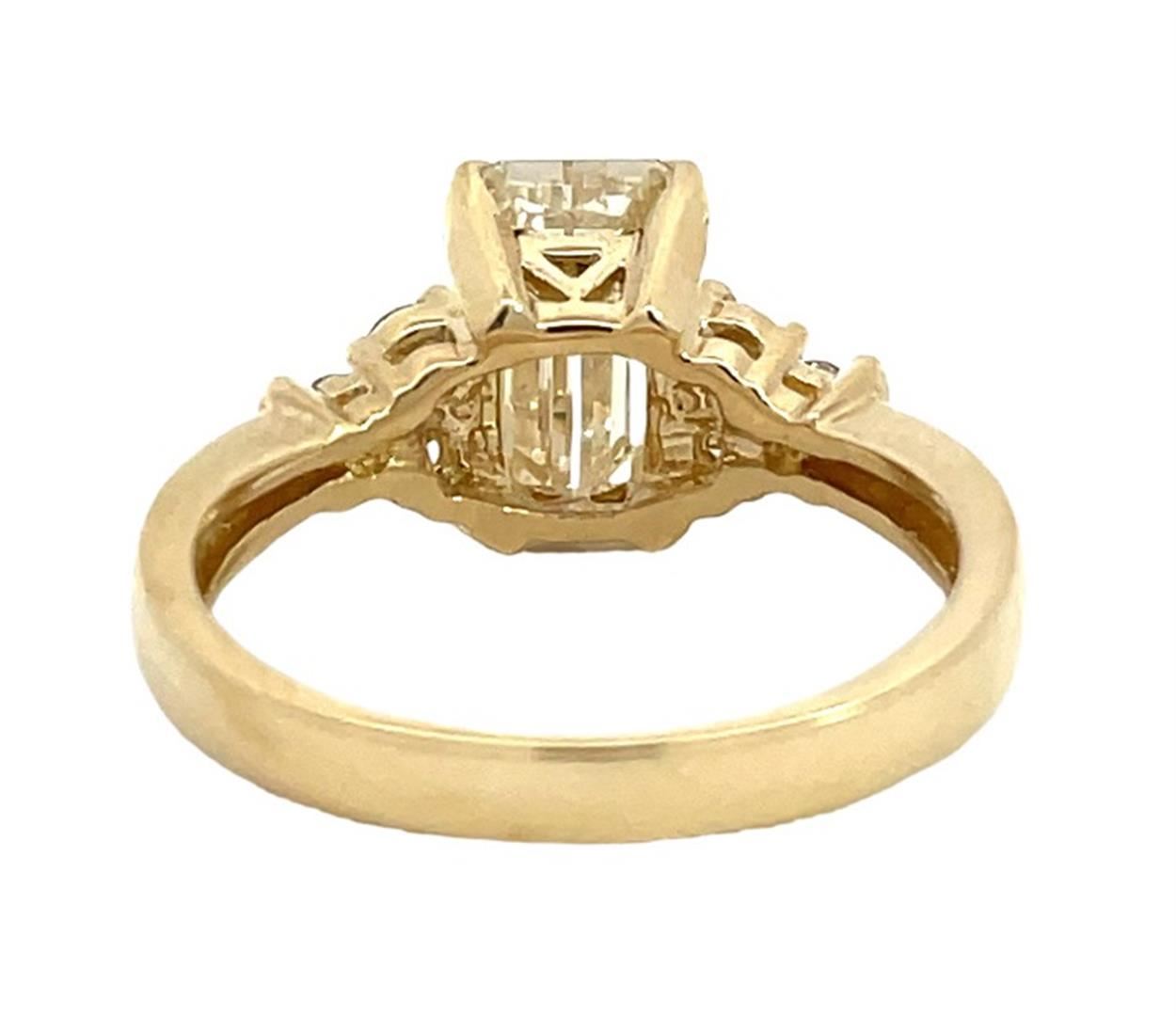 One electronically tested 14KT yellow gold lady's cast fashion wedding ring with a cathedral tapered shank with a bright polish finish. The featured lady's ring has a shank measuring 2.60 millimeters wide. Identified with markings of "14K". Condition is new, good workmanship. Containing: One prong set emerald cut diamond, measuring 9.85 x 5.25 x 3.60mm (depth est.), 5.00% GTCF approximate weight of 2.00ct. Graded in the setting. Color I Clarity VS-1 Cut Very Good Six prong set round brilliant cut diamonds, measuring 2.40 - 2.30 x 1.46mm (depth est.) approximate total weight of 6 Stones = 0.30ct. Graded in the setting. Color G - H Clarity VS-2 to SI-1 Cut Very Good Total Weight of Diamonds 2.30ct. Total Weight of Wedding Ring 4.50gm
