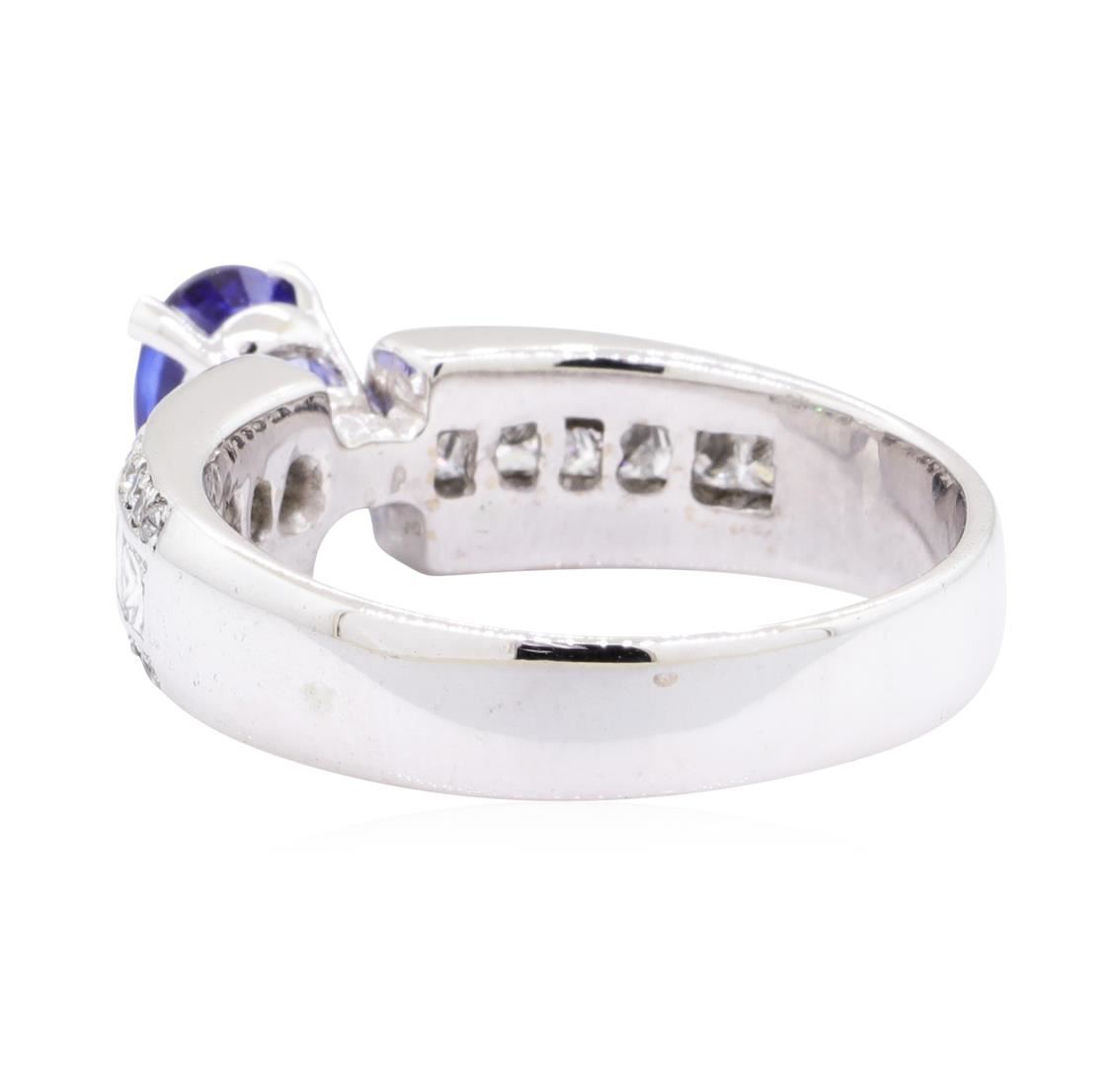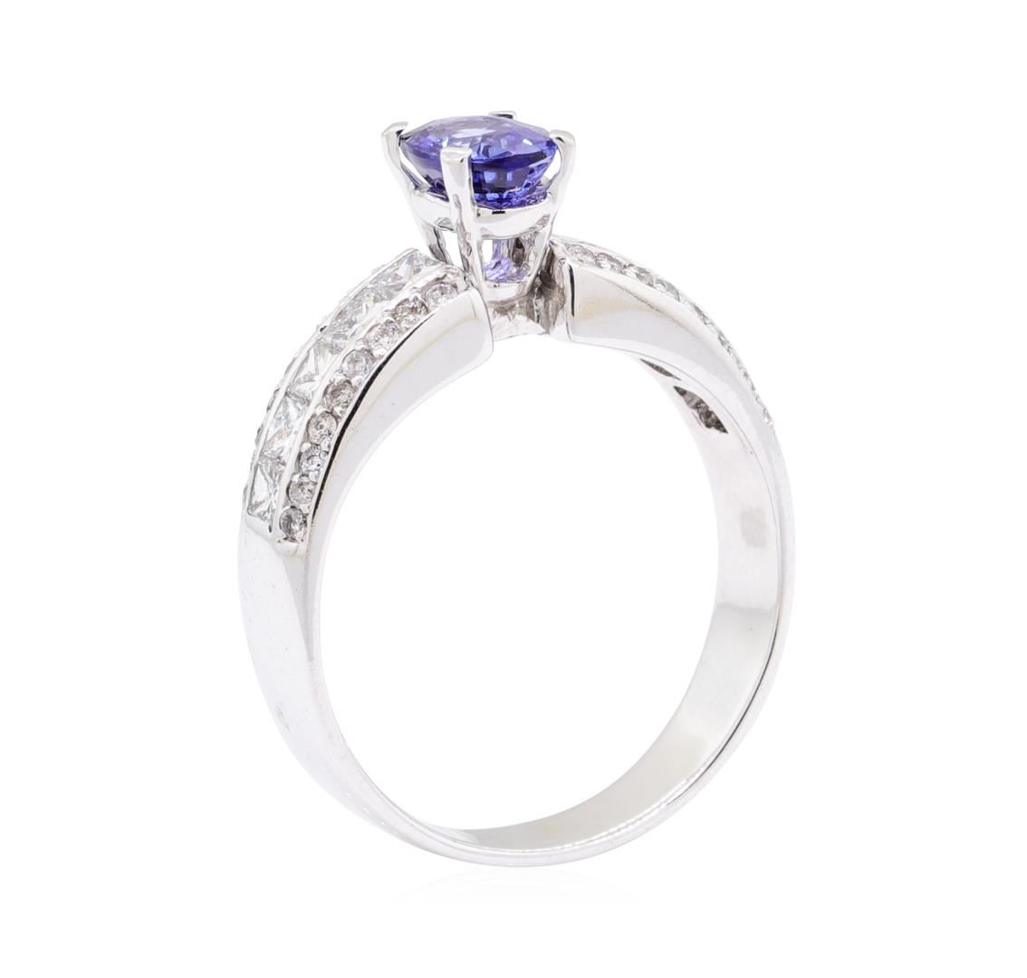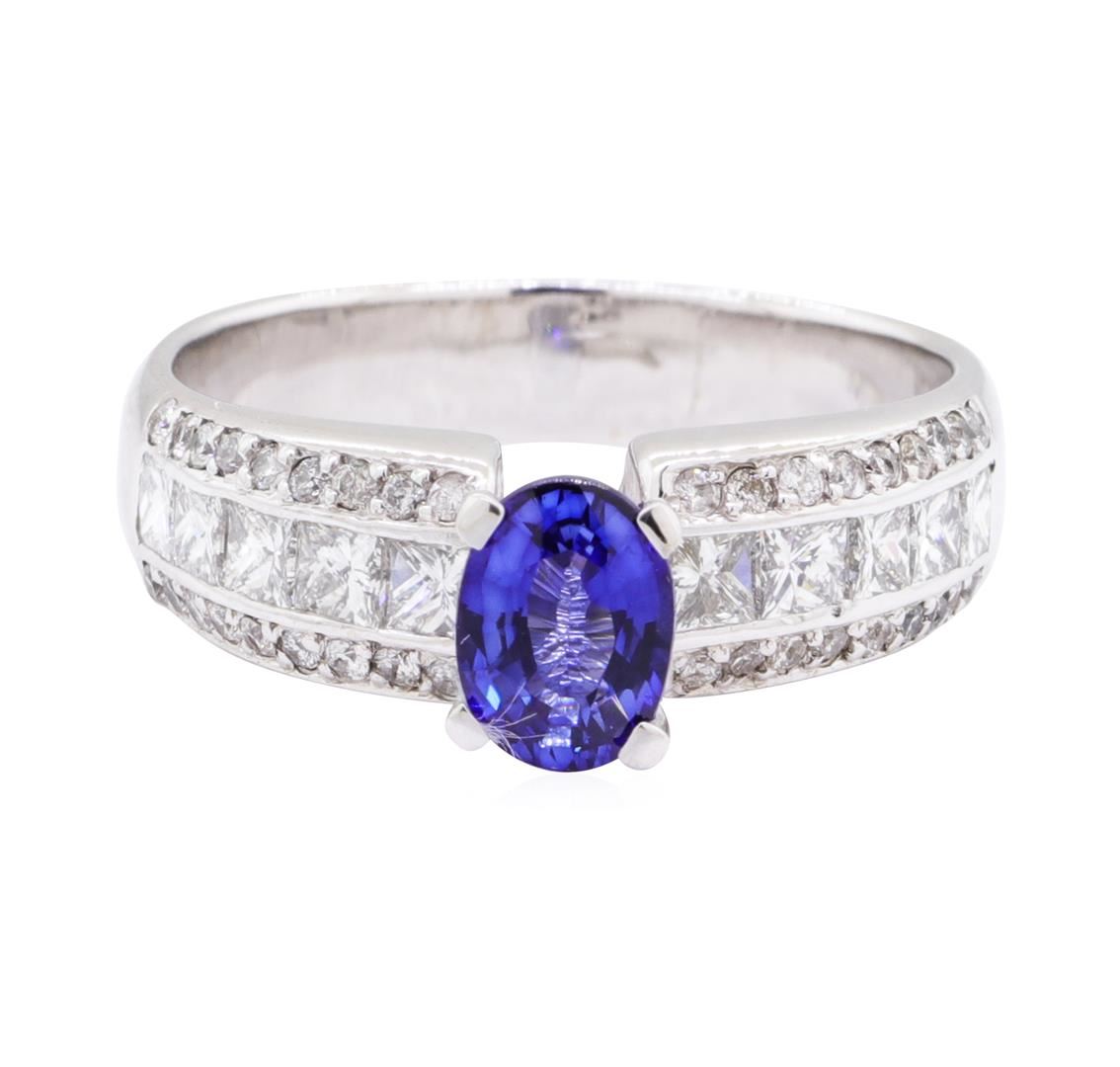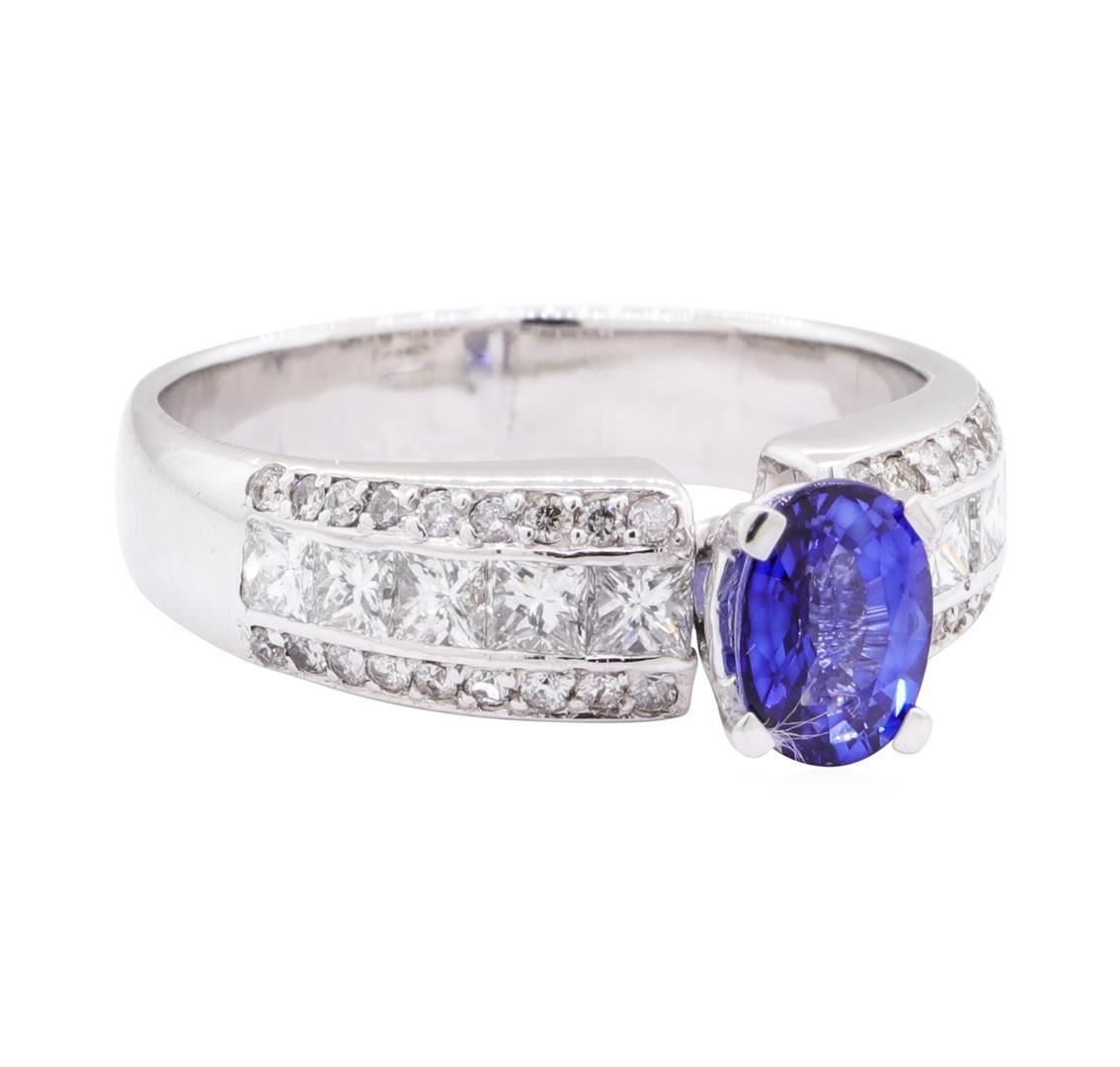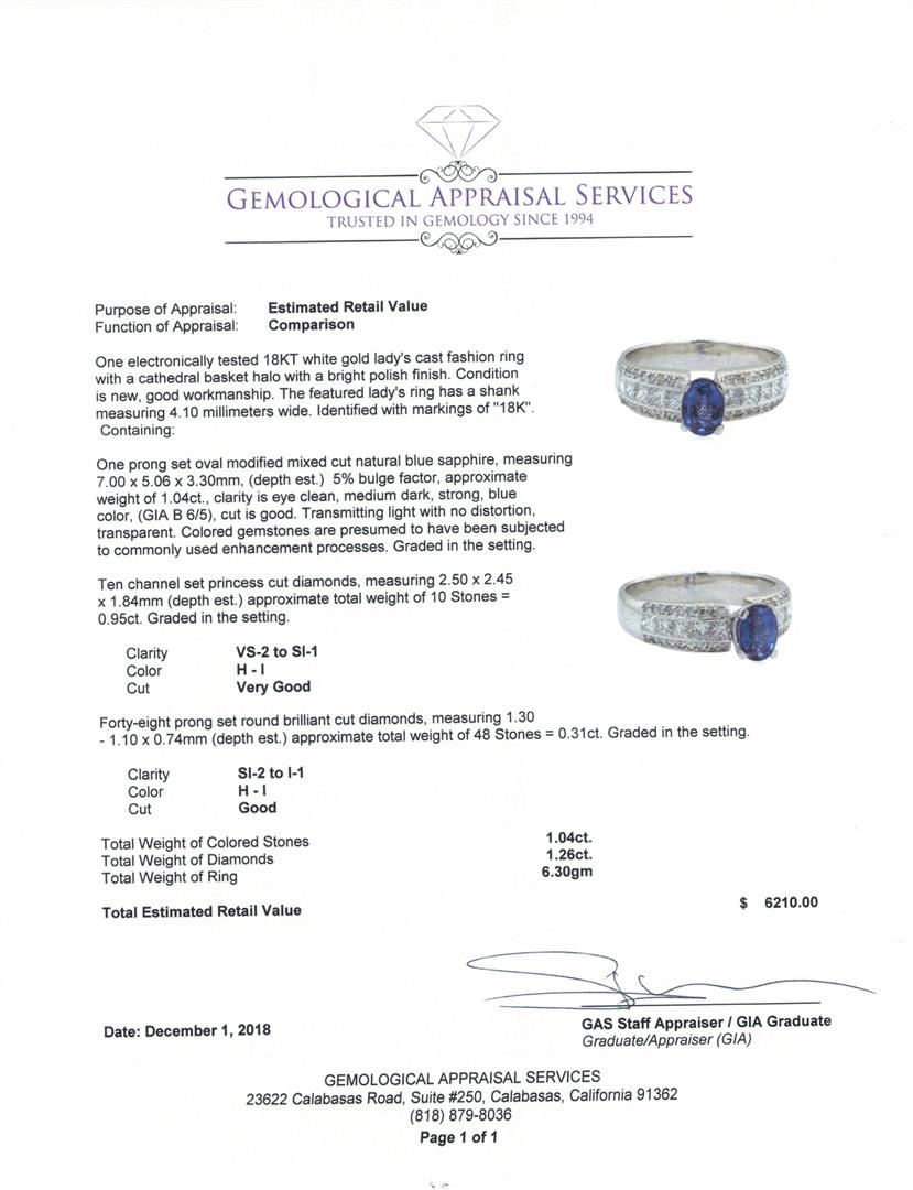 One electronically tested 18KT white gold lady's cast fashion ring with a cathedral basket halo with a bright polish finish. The featured lady's ring has a shank measuring 4.10 millimeters wide. Identified with markings of '18K'. Condition is new, good workmanship. Containing: One prong set oval modified mixed cut natural blue sapphire, measuring 7.00 x 5.06 x 3.30mm, (depth est.) 5%. bulge factor, approximate weight of 1.04ct., clarity is eye clean, medium dark, strong, blue color, (GIA B 6/5), cut is good. Transmitting light with no distortion, transparent. Colored gemstones are presumed to have been subjected to commonly used enhancement processes. Graded in the setting. Ten channel set princess cut diamonds, measuring 2.50 x 2.45 x 1.84mm (depth est.) approximate total weight of 10 Stones = 0.95ct. Graded in the setting. Color H - I Clarity VS-2 to SI-1 Cut Very Good Forty-Eight prong set round brilliant cut diamonds, measuring 1.30 - 1.10 x 0.74mm (depth est.) approximate total weight of 48 Stones = 0.31ct. Graded in the setting. Color H - I Clarity SI-2 to I-1 Cut Good. Total Weight of Colored Stones 1.04ct.. Total Weight of Diamonds 1.26ct.. Total Weight of Ring 6.30gm GAS Appraised at $6210.00. GAS Appraised.