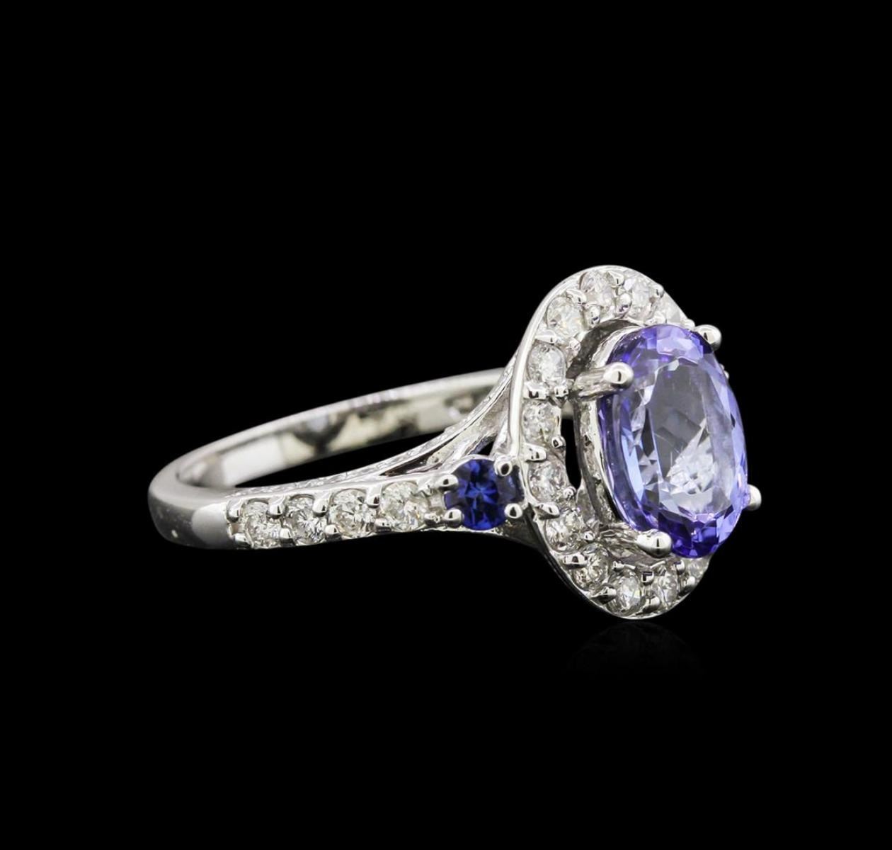One electronically tested 14KT white gold lady's cast halo ring with a cathedral shank with a bright polish finish. The featured lady's ring has a shank measuring 2.11 millimeters wide. Identified with markings of "K14". Condition is new, good workmanship. Containing: One prong set oval modified brilliant cut natural tanzanite, measuring 9.18 x 7.15 x 4.44mm, 10% bulge factor, approximate weight of 2.31ct., clarity is eye clean, type I, medium, very slightly grayish, violetish blue color, (GIA vB 5/3), cut is good. Transmitting light with no distortion, transparent. Colored gemstones are presumed to have been subjected to commonly used enhancement processes. Graded in the setting. Two prong set round modified brilliant cut natural blue sapphires, measuring 2.77 - 2.75 x 1.79 mm, approximate total weight of 0.20ct., clarity is slightly included, type II, medium dark, moderately strong, violetish blue color, (GIA vB 6/4), cut is very good. Colored gemstones are presumed to have been subjected to commonly used enhancement processes. Indications of laboratory high temperature heat treatment. Graded in the setting. Twenty-Four prong set round brilliant cut diamonds, measuring 2.00 - 1.90 x 1.17mm (depth est.) approximate total weight of 24 Stones = 0.62ct. Graded in the setting. Clarity: SI-2 to I-1. Color: H - I. Cut Very Good Forty-Eight prong set round brilliant cut diamonds, measuring 1.20 - 1.15 x 0.77mm (depth est.) approximate total weight of 48 Stones = 0.32ct. Graded in the setting. Clarity: SI-2 to I-1. Color: H - I. Cut Good. Total Weight of Colored Stones 2.51ct. Total Weight of Diamonds 0.94ct. Total Weight of Ring 5.00gm. GAS Appraised at $6,615.00.