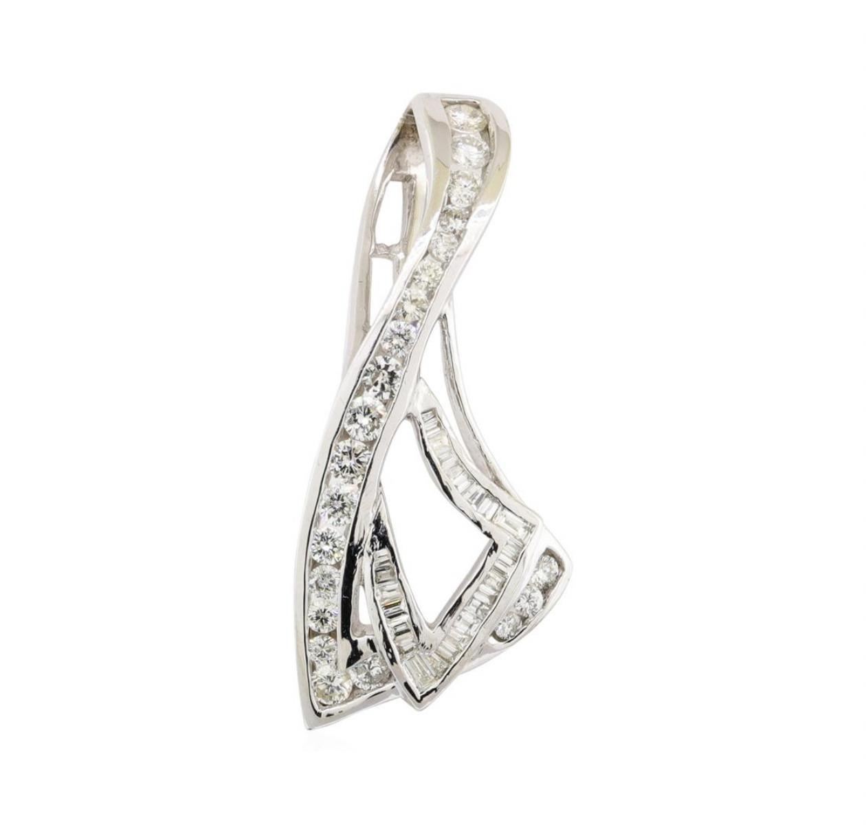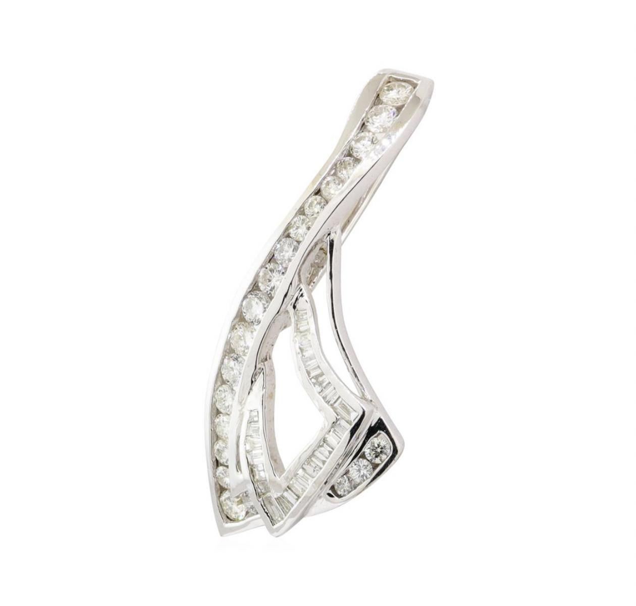 One electronically tested 14KT white gold lady's cast fashion pendant with a bright polish finish. The featured lady's pendant has a drop measuring 47.5 millimeters. Identified with markings of '14K'. Condition is like new, good workmanship. Containing: Twenty-One channel set round brilliant cut diamonds, measuring 3.35 - 2.25 x 1.74mm (depth est.) approximate total weight of 21 Stones = 1.75ct. Graded in the setting. Color H - J Clarity SI-2 to I-1 Cut Good Two channel set baguette cut diamonds, measuring from 3.00 x 1.70 x 1.45mm (depth est.) to 3.10 x 1.80 x 1.53mm (depth est.) approximate total weight of 2 Stones = 0.15ct. Graded in the setting. Color H - I Clarity VS-2 to SI-1 Cut Good Twenty-Three channel set baguette cut diamonds, measuring from 1.50 x 1.00 x 0.85mm (depth est.) to 2.10 x 1.30 x 1.11mm (depth est.) approximate total weight of 23 Stones = 0.45ct. Graded in the setting. Color H - J Clarity VS-2 to I-1 Cut Good. Total Weight of Diamonds 2.35ct.. Total Weight of Pendant 9.30gm GAS Appraised at $6935.00. GAS Appraised at $6,935.00.