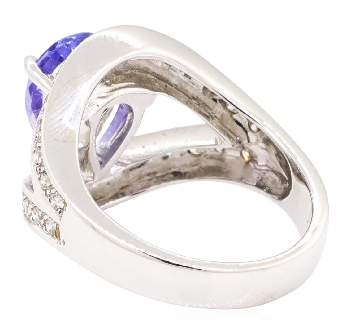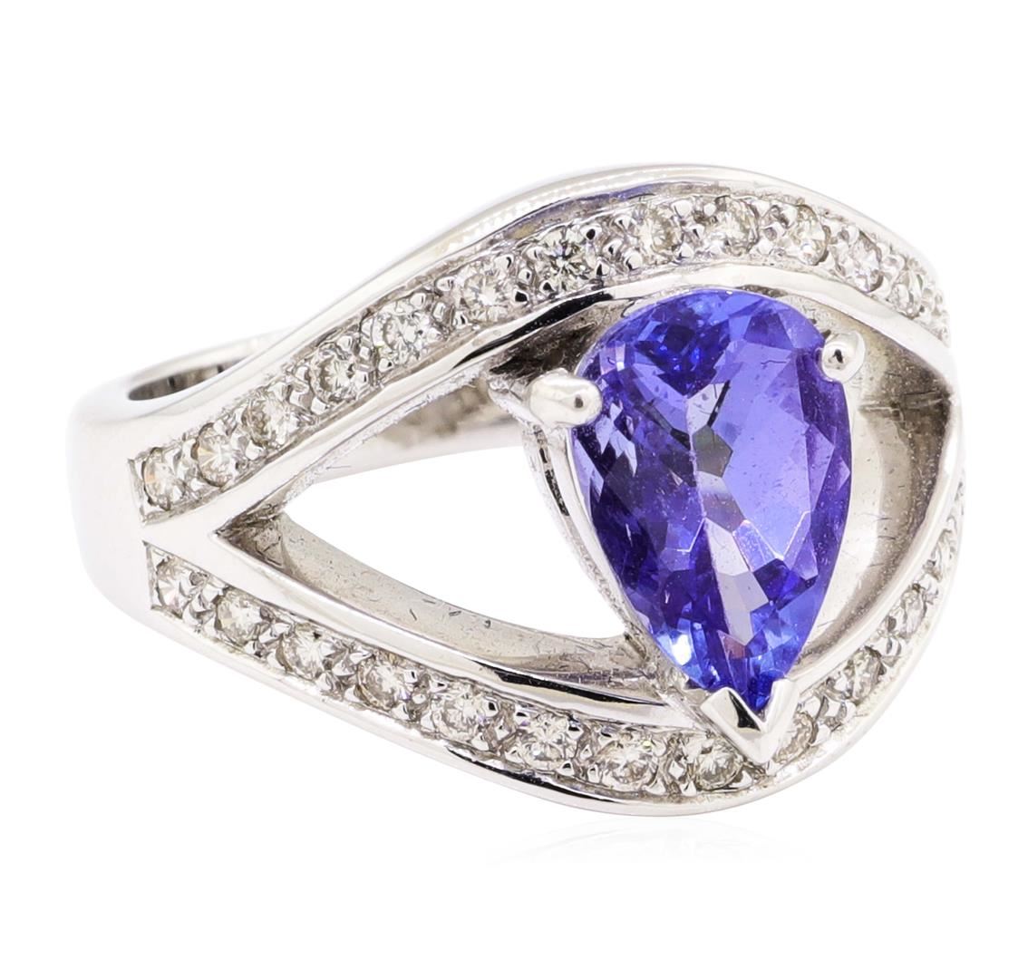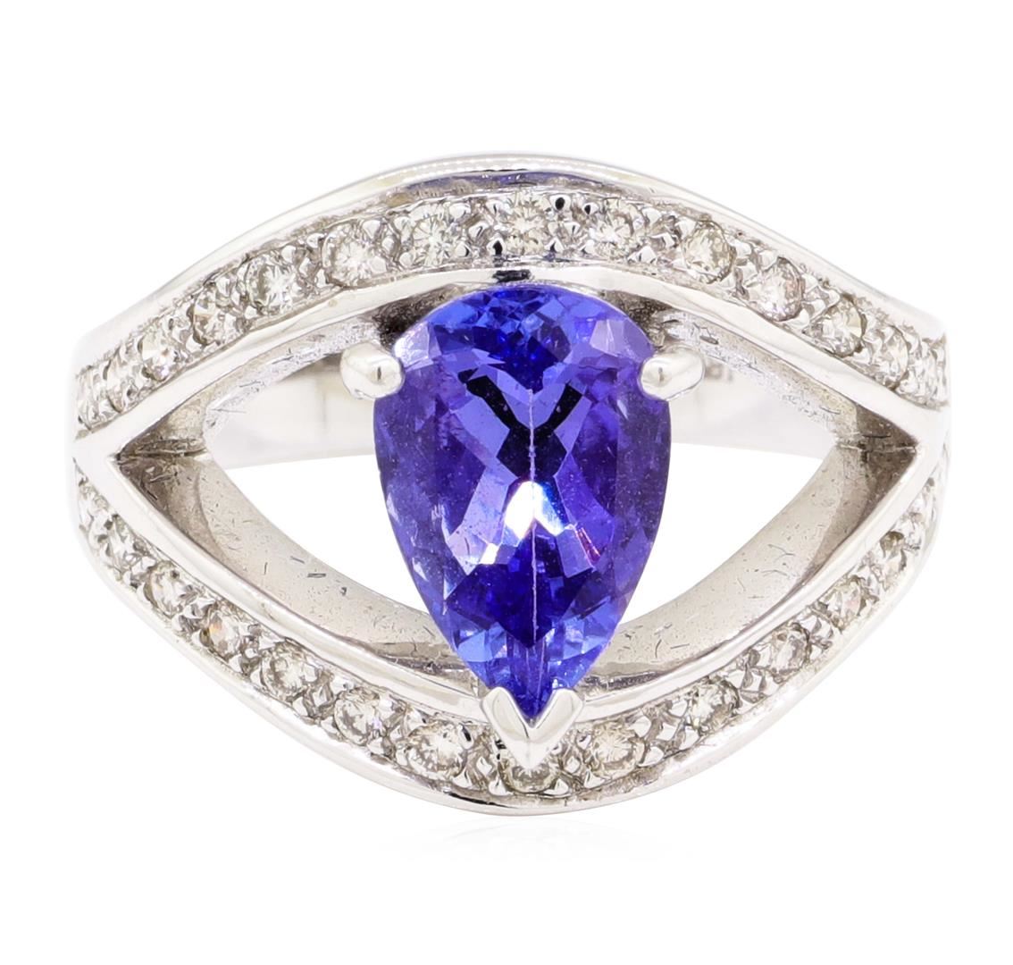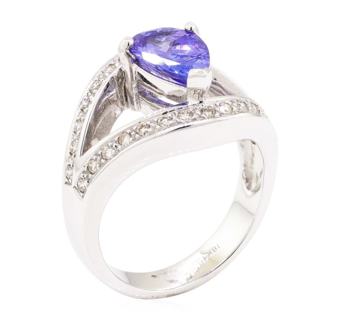 One electronically tested 18KT white gold lady's combination cast & assembled fashion ring with a split bypass shank with a bright polish finish. The featured lady's ring has a shank measuring 3.90 millimeters wide. Identified with markings of '18K'. Condition is new, good workmanship. Containing: One prong set pear modified mixed cut natural tanzanite, measuring 10.00 x 6.75 x 4.44mm, (depth est.) approximate weight of 1.91ct., clarity is eye clean, medium, slightly grayish, bluish violet color, (GIA bV 5/2), cut is good. Transmitting light with no distortion, transparent. Colored gemstones are presumed to have been subjected to commonly used enhancement processes. Graded in the setting. Thirty bead set round brilliant cut diamonds, measuring 1.60 - 1.50 x 0.96mm (depth est.) approximate total weight of 30 Stones = 0.44ct. Graded in the setting. Color H - I Clarity VS-2 to SI-2 Cut Good. Total Weight of Colored Stones 1.91ct.. Total Weight of Diamonds 0.44ct.. Total Weight of Ring 9.10gm GAS Appraised at $4400.00. GAS Appraised.