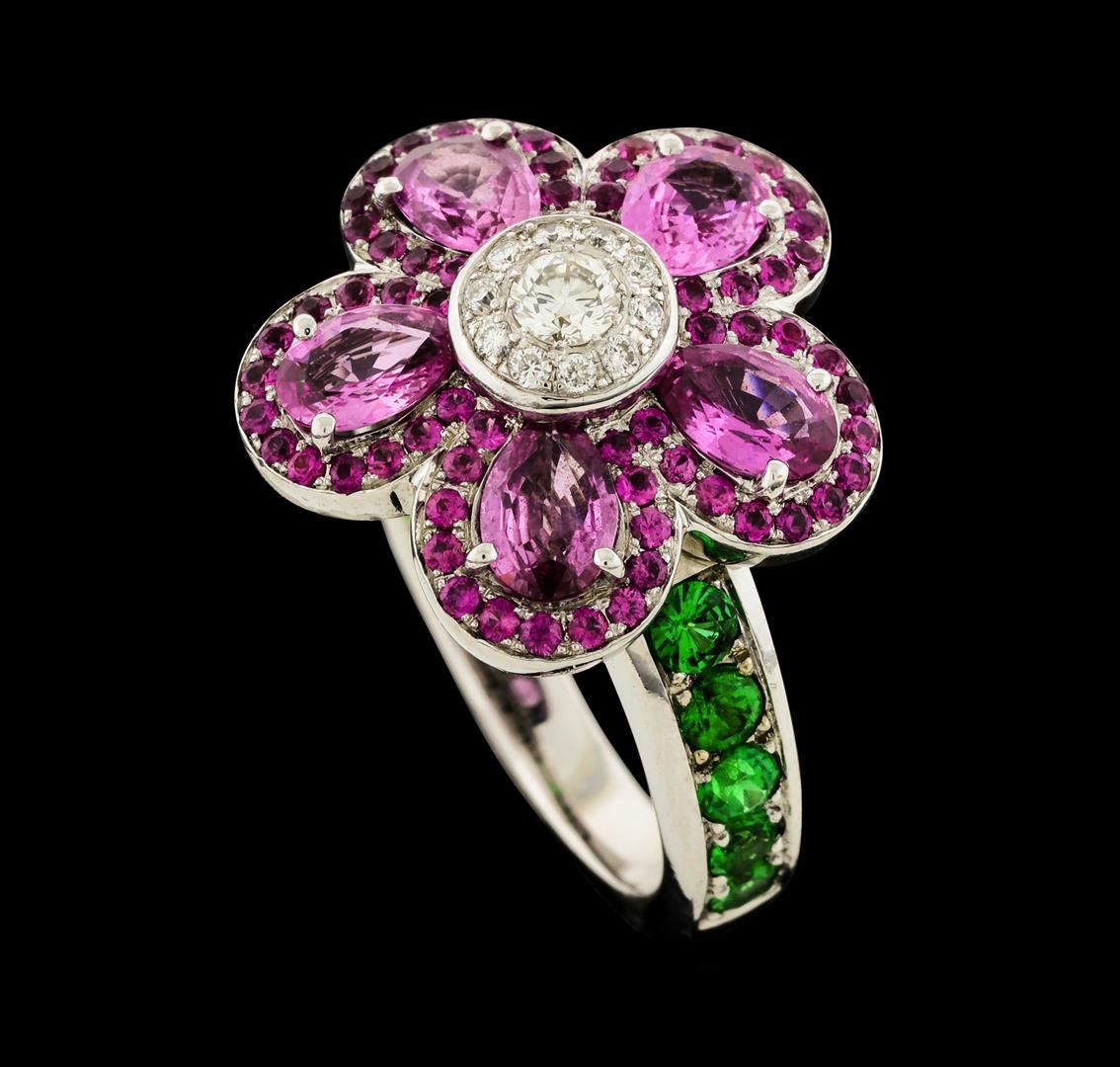 One electronically tested 18KT white gold lady's combination cast & assembled flower design ring with a bright polish finish. The featured lady's ring has a shank measuring 3.02 millimeters wide. Trademark is Cellini. Condition is used, good workmanship. Containing: Five prong set pear modified mixed cut natural pink sapphires, measuring 5.60 x 3.90 x 2.54mm, (depth est.) approximate total weight of 2.20ct., clarity is slightly included, medium, moderately strong, strongly purplish red color, (GIA stpR 5/4), cut is very good. Transmitting light with a minimum of distortion, transparent. Colored gemstones are presumed to have been subjected to commonly used enhancement processes. Graded in the setting. Sixty-five prong set round modified mixed cut natural pink sapphires, measuring 1.45 - 1.30 x 0.90 mm, (depth est.) approximate total weight of 1.10ct., clarity is slightly included, medium, strong, strongly purplish red color, (GIA stpR 5/5), cut is very good. Transmitting light with a minimum of distortion, transparent. Colored gemstones are presumed to have been subjected to commonly used enhancement processes. Graded in the setting. Nine prong set round modified brilliant cut natural tsavorite garnets, measuring 2.90 - 2.40 x 1.72 mm, (depth est.) approximate total weight of 0.80ct., clarity is slightly included, medium dark, moderately strong, green color, (GIA G 6/4), cut is good. Transmitting light with a minimum of distortion, transparent. Colored gemstones are presumed to have been subjected to commonly used enhancement processes. Graded in the setting. One prong set round brilliant cut diamond, measuring 3.45 - 3.42 x 2.06mm (depth est.) approximate weight of 0.15ct. Graded in the setting. Clarity SI-1. Color: I Cut Very Good Ten prong set round brilliant cut diamonds, measuring 1.20 - 1.10 x 0.71mm (depth est.) approximate total weight of 10 Stones = 0.06ct. Graded in the setting. Clarity SI-1 to SI-2. Color: H - I Cut Good. Total Weight of Colored Stones 4.10ct.. Total Weight of Diamonds 0.21ct.. Total Weight of Ring 10.90gm. GAS Appraised.