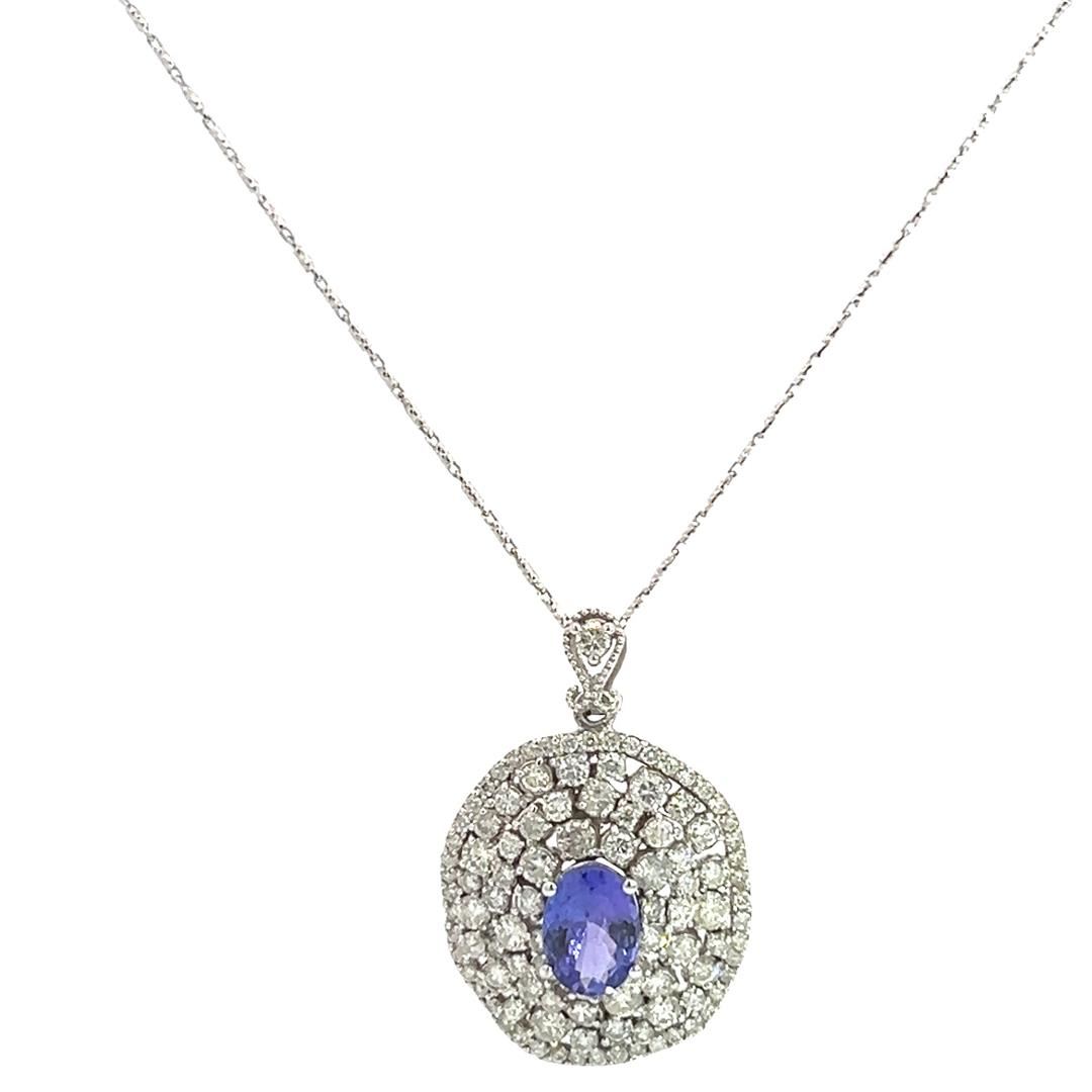 One electronically tested 14KT white gold lady's combination cast & assembled fashion freeform pendant and chain 18.0" long, 1mm fancy link with a lobster claw clasp with a oval motif with a bright polish finish. The featured lady's pendant has a drop of approximately 35 millimeters. Identified with markings of "14K". Condition is new, good workmanship. Containing: One prong set oval modified brilliant cut natural tanzanite, measuring 9.95 x 7.35 x 4.55mm, (depth est.) approximate weight of 2.35ct., clarity is eye clean, medium light, moderately strong, violet color, (GIA V 4/4), cut is good. Transmitting light with no distortion, transparent. Colored gemstones are presumed to have been subjected to commonly used enhancement processes. Graded in the setting. Forty-Eight prong set round brilliant cut diamonds, measuring 1.35 - 1.30 x 0.82mm (depth est.) approximate total weight of 48 Stones = 0.42ct. Graded in the setting. Color H - I Clarity SI-2 to I-1 Cut Good Fifty-Two prong set round brilliant cut diamonds, measuring 3.00 - 2.20 x 1.61mm (depth est.) approximate total weight of 52 Stones = 3.45ct. Graded in the setting. Color H - I Clarity SI-1 to I-1 Cut Good Total Weight of Colored Stones 2.35ct. Total Weight of Diamonds 3.87ct. Total Weight of Pendant And Chain 12.50gm Estimated Retail Value $ 12600.00