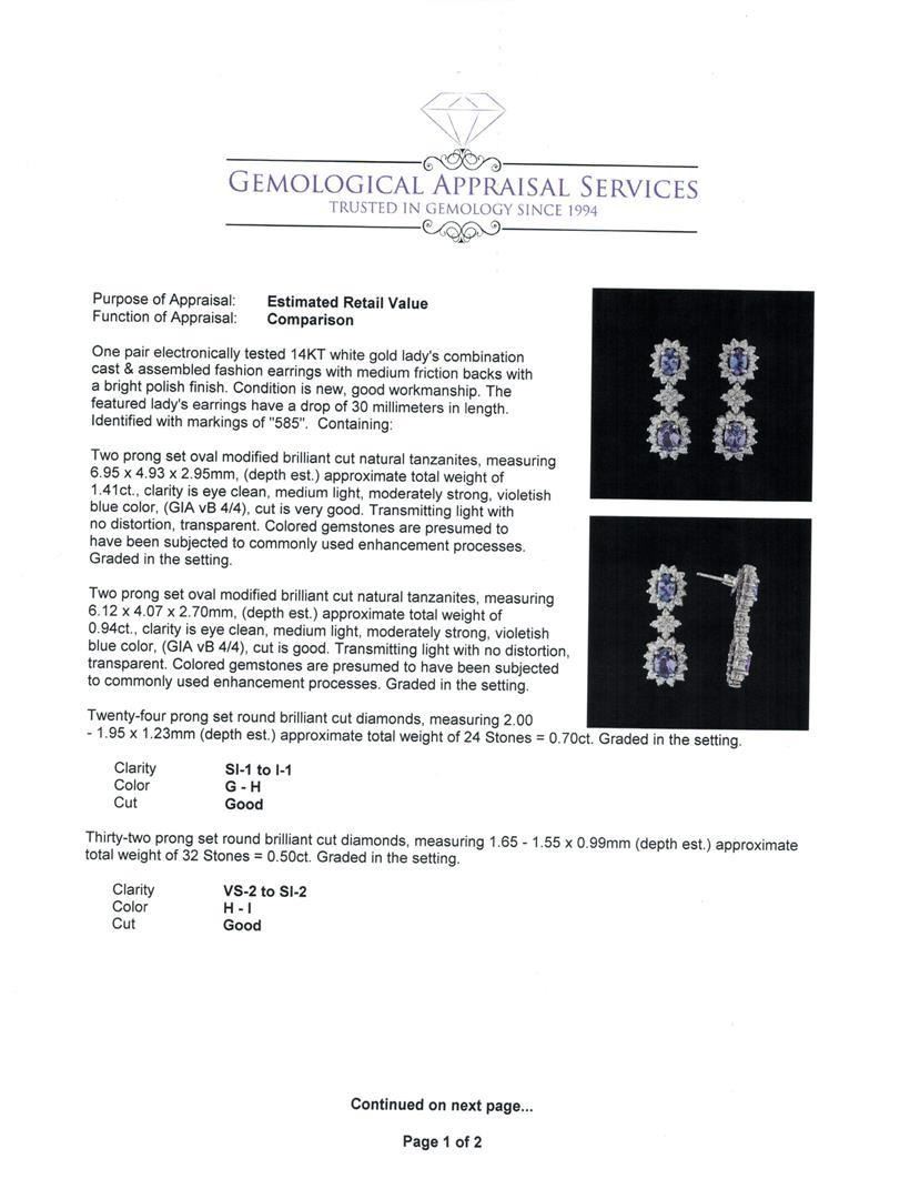 One pair electronically tested 14KT white gold lady's combination cast & assembled fashion earrings with medium friction backs with a bright polish finish. The featured lady's earrings have a drop of 30 millimeters in length. Identified with markings of "585". Condition is new, good workmanship. Containing: Two prong set oval modified brilliant cut natural tanzanites, measuring 6.95 x 4.93 x 2.95mm, (depth est.) approximate total weight of 1.41ct., clarity is eye clean, medium light, moderately strong, violetish blue color, (GIA vB 4/4), cut is very good. Transmitting light with no distortion, transparent. Colored gemstones are presumed to have been subjected to commonly used enhancement processes. Graded in the setting. Two prong set oval modified brilliant cut natural tanzanites, measuring 6.12 x 4.07 x 2.70mm, (depth est.) approximate total weight of 0.94ct., clarity is eye clean, medium light, moderately strong, violetish blue color, (GIA vB 4/4), cut is good. Transmitting light with no distortion, transparent. Colored gemstones are presumed to have been subjected to commonly used enhancement processes. Graded in the setting. Twenty-Four prong set round brilliant cut diamonds, measuring 2.00 - 1.95 x 1.23mm (depth est.) approximate total weight of 24 Stones = 0.70 ct. Graded in the setting. Clarity: SI-1 to I-1. Color: G - H. Cut Good Thirty-Two prong set round brilliant cut diamonds, measuring 1.65 - 1.55 x 0.99mm (depth est.) approximate total weight of 32 Stones = 0.50 ct. Graded in the setting. Clarity: VS-2 to SI-2. Color: H - I. Cut Good Ten prong set round brilliant cut diamonds, measuring 1.45 - 1.35 x 0.87mm (depth est.) approximate total weight of 10 Stones = 0.11ct. Graded in the setting. Clarity: SI-1 to SI-2. Color: G - Good. Total Weight of Colored Stones 2.35ct. Total Weight of Diamonds 1.31ct. Total Weight of Earrings 7.70gm. GAS Appraised.