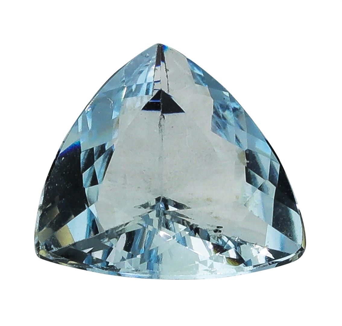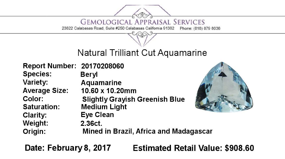 One natural trilliant cut aquamarine with an exact weight of 2.36ct., clarity is eye clean, slightly grayish greenish blue, medium light. Gemological Appraisals Services estimates the retail value at $908.6 GAS Appraised.