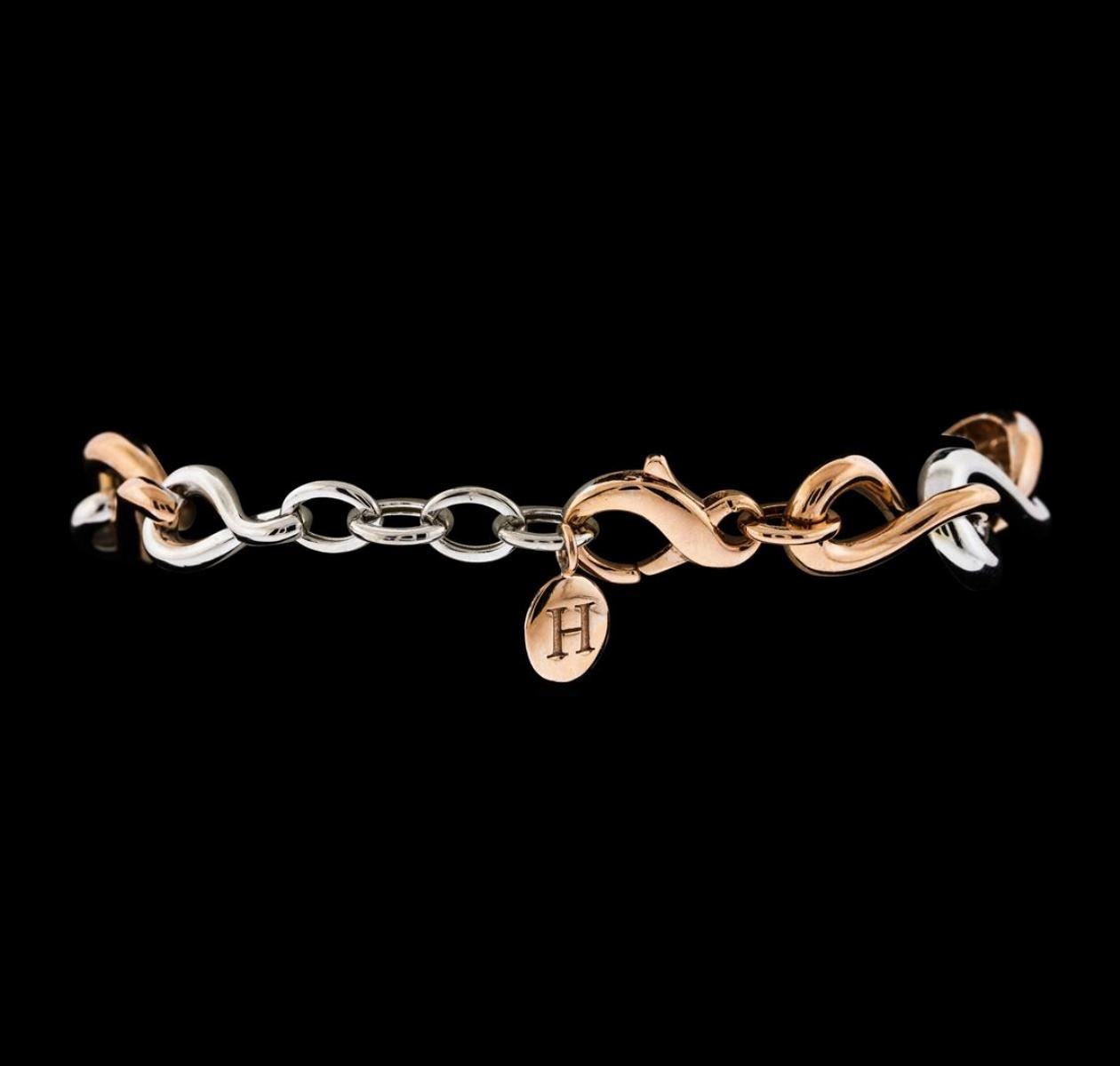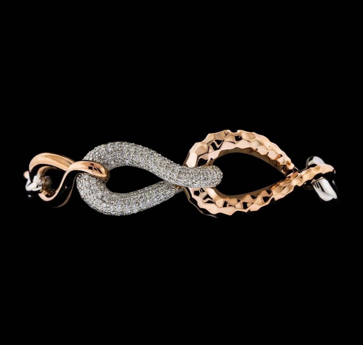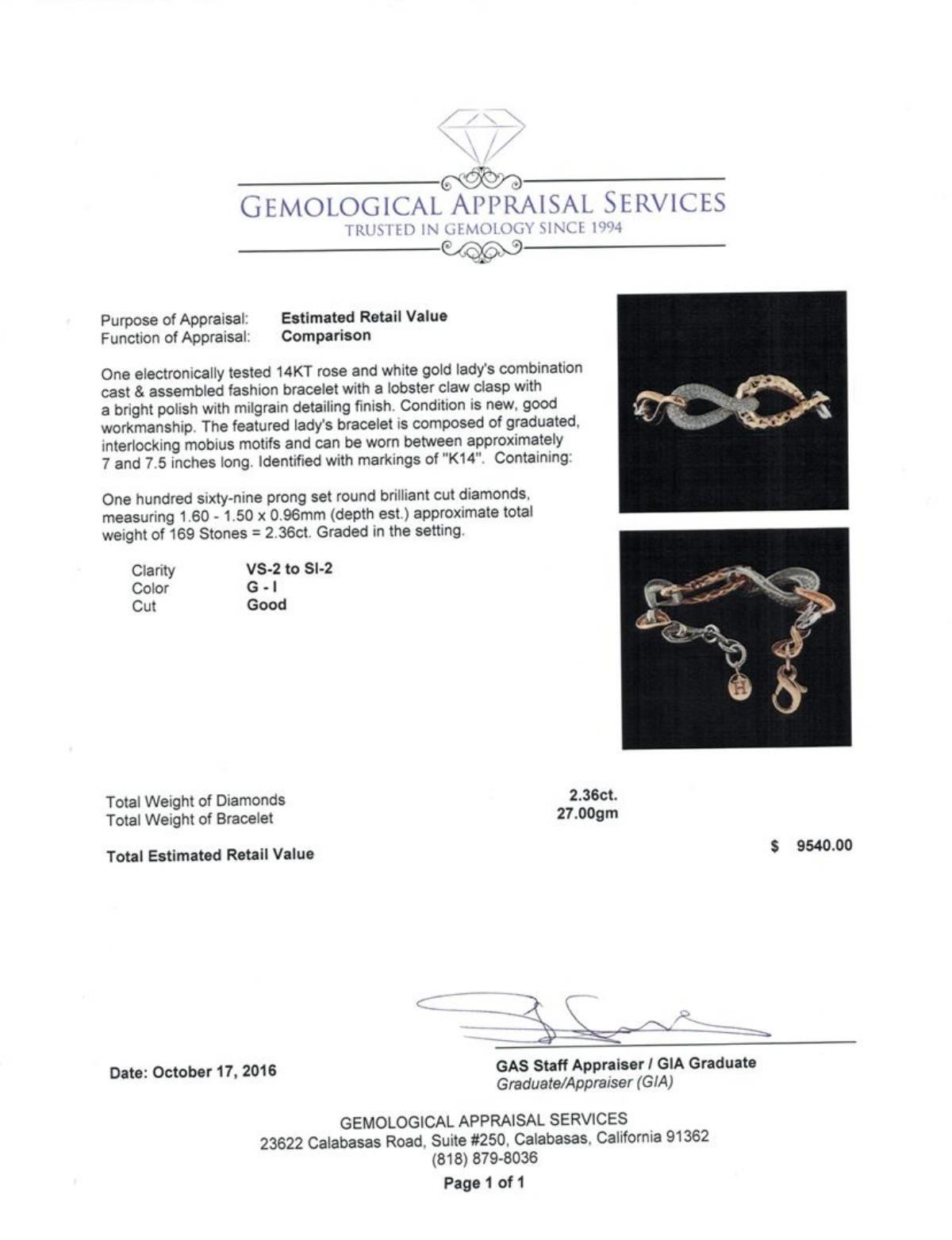 One electronically tested 14KT rose and white gold lady's combination cast & assembled fashion bracelet with a lobster claw clasp with a bright polish with milgrain detailing finish. The featured lady's bracelet is composed of graduated, interlocking mobius motifs and can be worn between approximately 7 and 7.5 inches long. Identified with markings of 'K14'. Condition is new, good workmanship. Containing: One Hundred Sixty-Nine prong set round brilliant cut diamonds, measuring 1.60 - 1.50 x 0.96mm (depth est.) approximate total weight of 169 Stones = 2.36ct. Graded in the setting. Clarity VS-2 to SI-2. Color: G - I Cut Good. Total Weight of Diamonds 2.36ct.. Total Weight of Bracelet 27.00gm. GAS Appraised at $9,540.00.