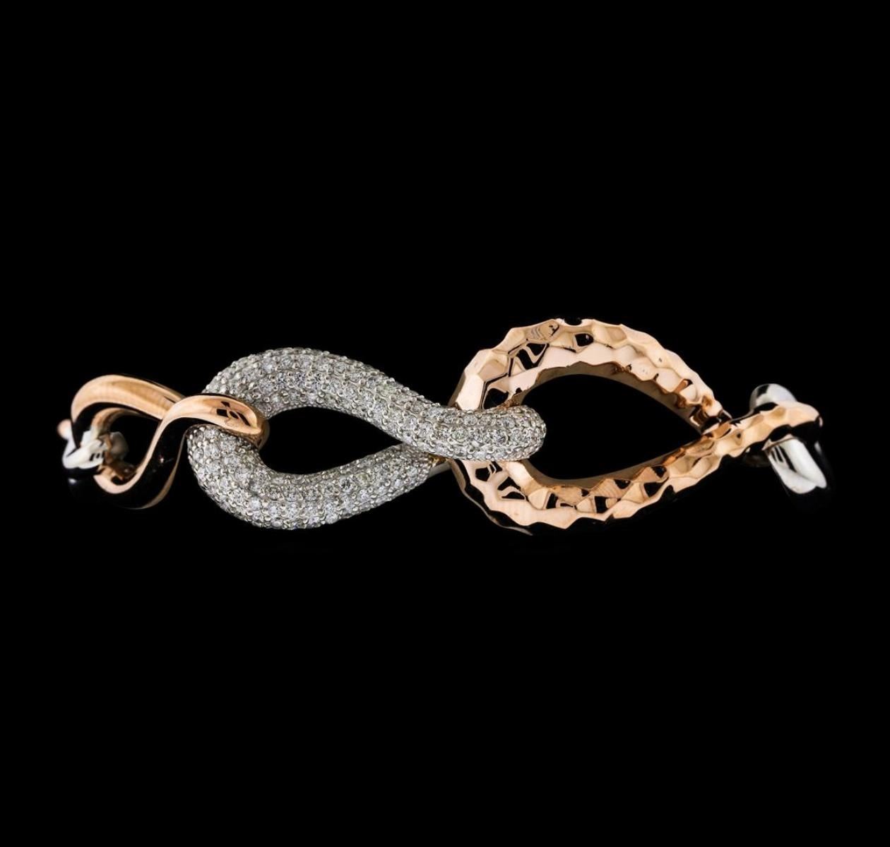One electronically tested 14KT rose and white gold lady's combination cast & assembled fashion bracelet with a lobster claw clasp with a bright polish with milgrain detailing finish. The featured lady's bracelet is composed of graduated, interlocking mobius motifs and can be worn between approximately 7 and 7.5 inches long. Identified with markings of 'K14'. Condition is new, good workmanship. Containing: One Hundred Sixty-Nine prong set round brilliant cut diamonds, measuring 1.60 - 1.50 x 0.96mm (depth est.) approximate total weight of 169 Stones = 2.36ct. Graded in the setting. Clarity VS-2 to SI-2. Color: G - I Cut Good. Total Weight of Diamonds 2.36ct.. Total Weight of Bracelet 27.00gm. GAS Appraised.
