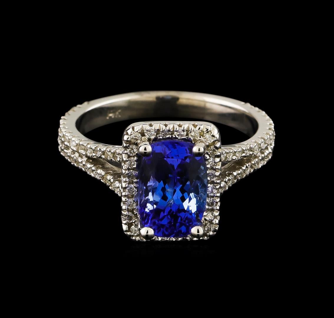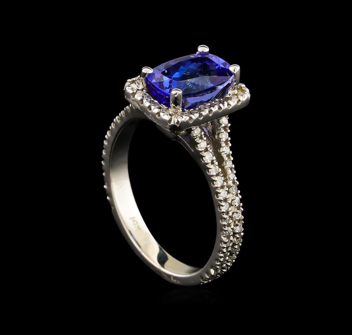 One electronically tested 14KT white gold lady's cast fashion ring with a split shank halo with a bright polish finish. The featured lady's ring has a shank measuring 2.47 millimeters wide. Identified with markings of "14K". Condition is new, good workmanship. Containing: One prong set rectangular cushion modified brilliant cut natural tanzanite, measuring 9.05 x 6.15 x 5.34mm, approximate weight of 2.36ct., clarity is eye clean, medium dark, moderately strong, violetish blue color, (GIA vB 6/4), cut is good. Graded in the setting. One Hundred Four prong set round brilliant cut diamonds, measuring 1.15 - 1.05 x 0.67mm (depth est.) approximate total weight of 104 Stones = 0.51ct. Graded in the setting. Clarity: SI-1 to I-1. Color: H - I. Cut Good. Total Weight of Colored Stones 2.36ct. Total Weight of Diamonds 0.51ct. Total Weight of Ring 3.80gm.