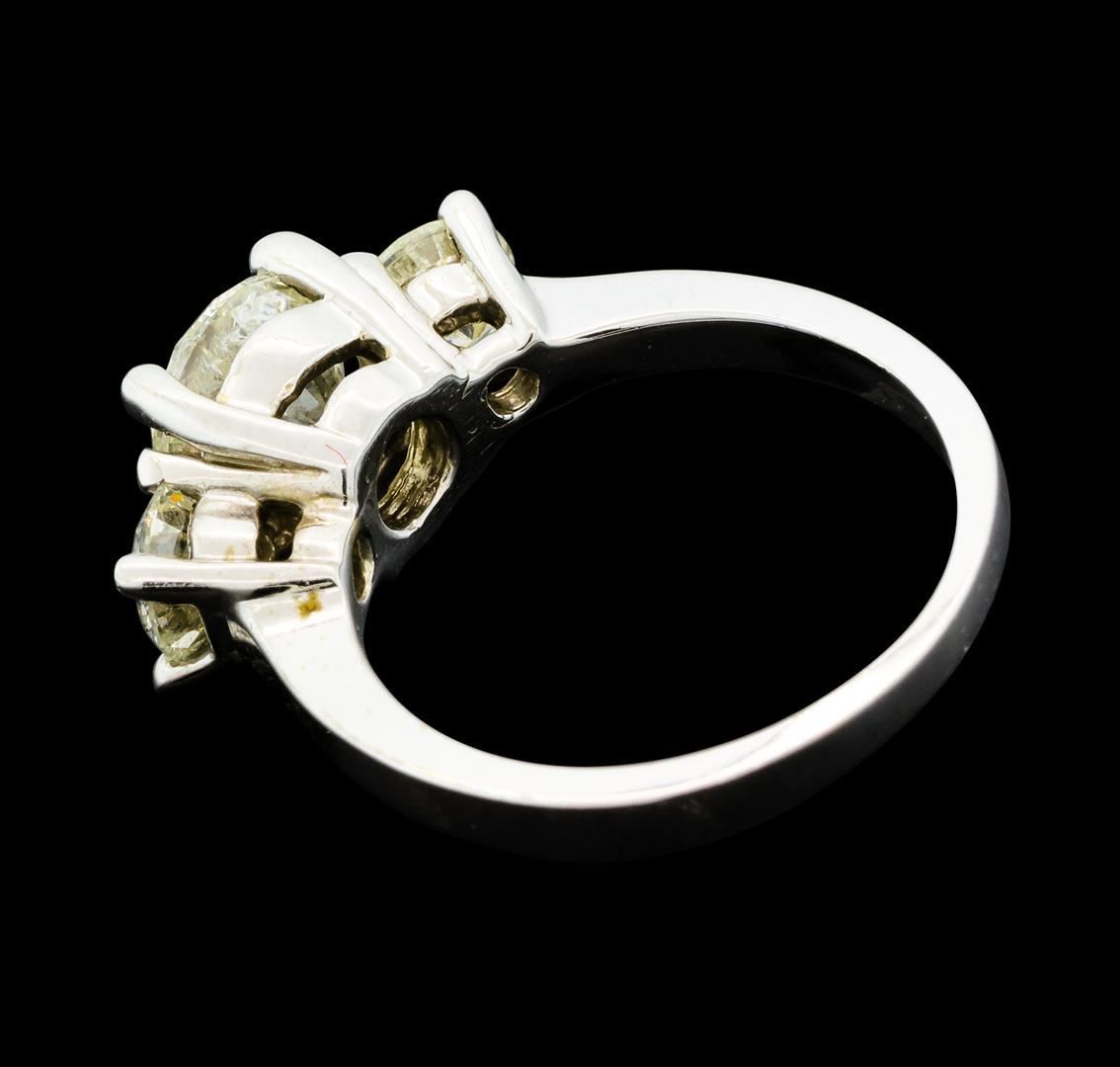 One electronically tested 14KT white gold lady's cast three stone wedding ring with a straight line motif with a bright polish finish. The featured lady's ring has a shank measuring 1.82 millimeters wide. Identified with markings of '14K'. Condition is new, good workmanship. Containing: One prong set round brilliant cut diamond, measuring 7.26 - 7.24 x 4.60mm (depth est.) approximate weight of 1.52ct. Graded in the setting. Clarity I-1. Color: J Cut Good Two prong set round brilliant cut diamonds, measuring 4.82 - 4.65 x 3.03mm (depth est.) approximate total weight of 2 Stones = 0.85ct. Graded in the setting. Clarity SI-2 to I-1. Color: I - J Cut Good. Total Weight of Diamonds 2.37ct.. Total Weight of Ring 4.50gm. GAS Appraised.