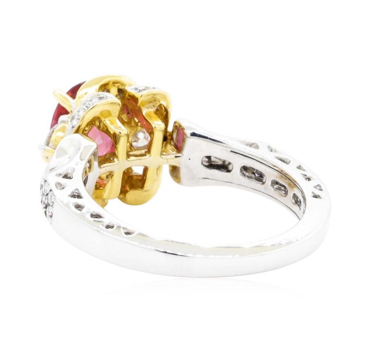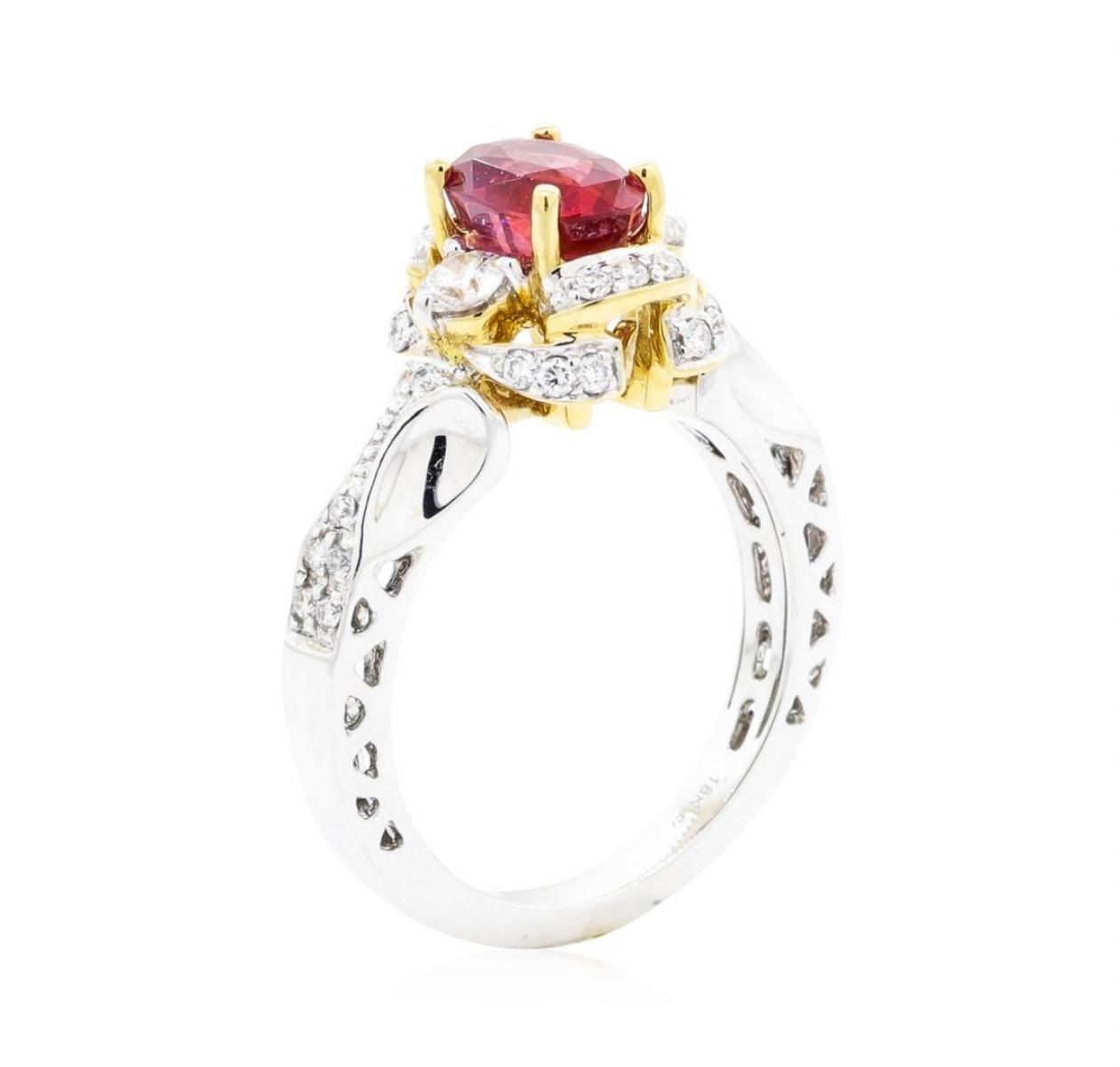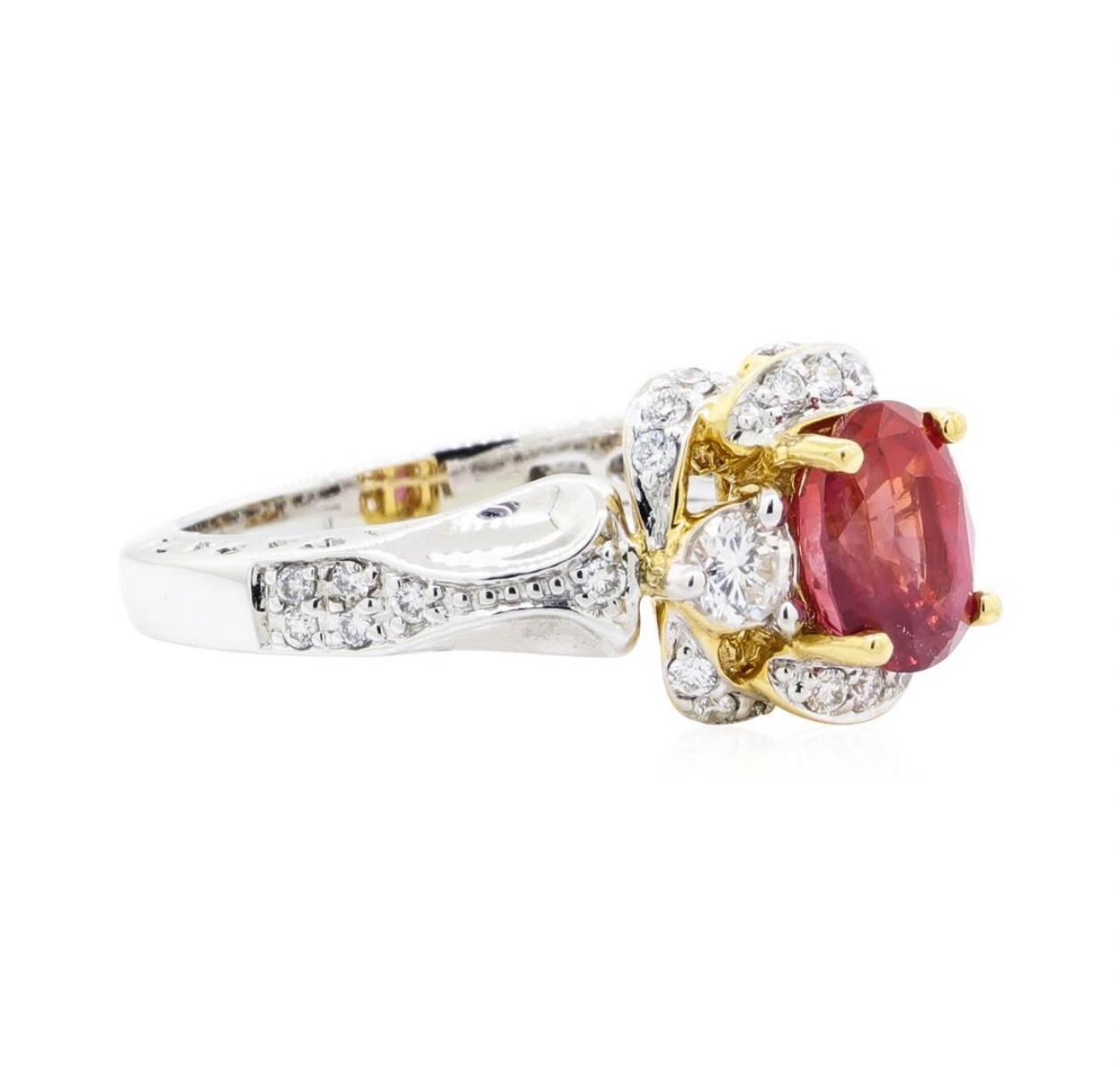One electronically tested 18KT white and yellow gold lady's combination cast & assembled fashion ring with a scalloped halo with a bright polish finish. The featured lady's ring has a shank measuring 2.32 millimeters in width. Identified with markings of '18K'. Condition is new, good workmanship. Containing: One prong set oval modified mixed cut natural orange sapphire, measuring 7.70 x 5.75 x 4.75mm, (depth est.) approximate weight of 1.85ct., clarity is moderately included, medium dark, very slightly brownish, reddish orange color, (GIA rO 6/3), cut is good. Transmitting light somewhat diffusely, transparent to translucent. No indications of heat treatment. Graded in the setting in the GRS Laboratory, Report #GRS2018-030791. Two prong set round brilliant cut diamonds, measuring 3.50 - 3.45 x 2.16mm (depth est.) approximate total weight of 2 Stones = 0.32ct. Graded in the setting. Color H - I Clarity SI-1 Cut Good Thirty prong set round brilliant cut diamonds, measuring 1.35 - 1.15 x 0.75mm (depth est.) approximate total weight of 30 Stones = 0.20ct. Graded in the setting. Color H - I Clarity SI-1 to SI-2 Cut Very Good. Total Weight of Colored Stones 1.85ct.. Total Weight of Diamonds 0.52ct.. Total Weight of Ring 7.40gm GAS Appraised at $9575.00. GAS Appraised.