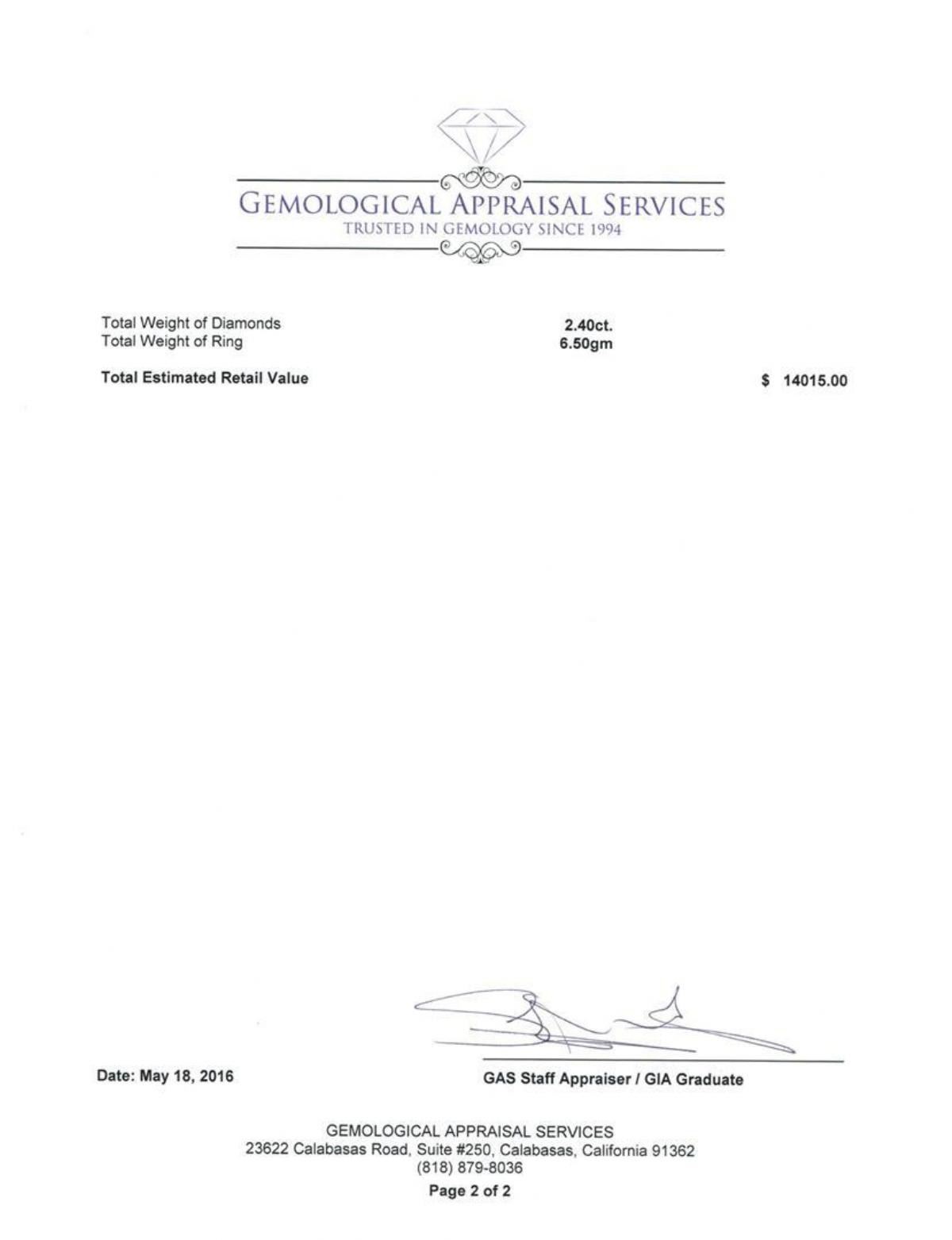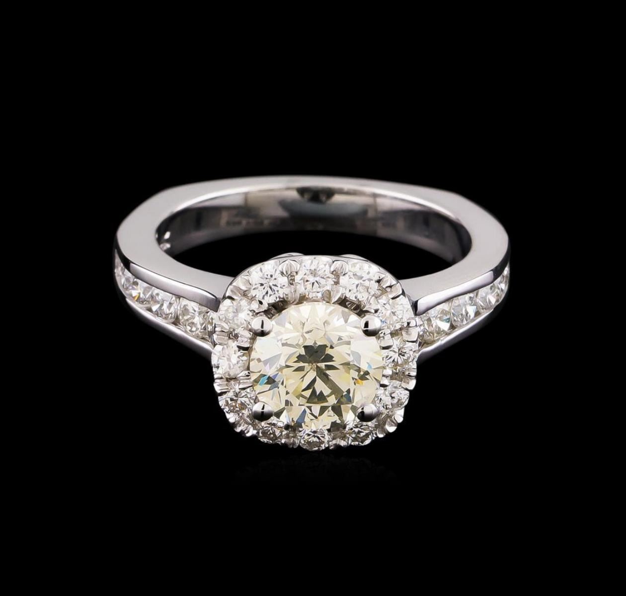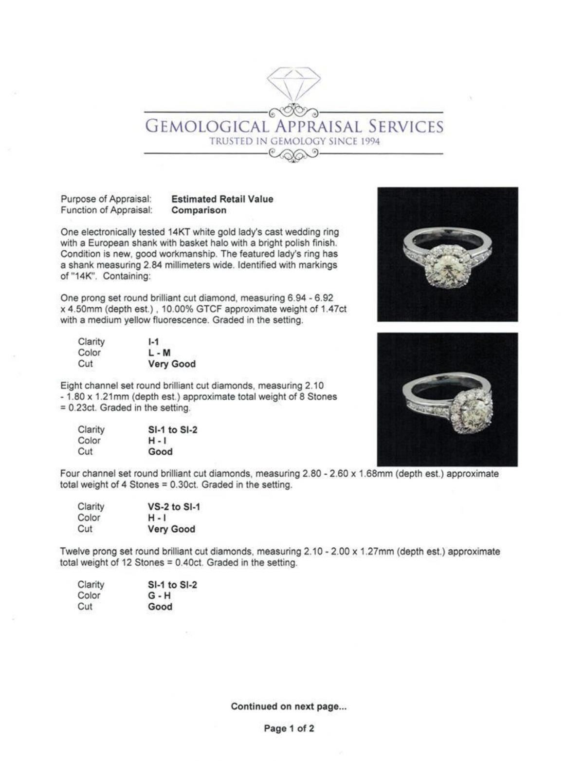 One electronically tested 14KT white gold lady's cast wedding ring with a European shank with basket halo with a bright polish finish. The featured lady's ring has a shank measuring 2.84 millimeters wide. Identified with markings of "14K". Condition is new, good workmanship. Containing: One prong set round brilliant cut diamond, measuring 6.94 - 6.92 x 4.50mm (depth est.) , 10.00.%. GTCF approximate weight of 1.47ct with a medium yellow fluorescence. Graded in the setting. Clarity: I-1. Color: L - M. Cut Very Good Eight channel set round brilliant cut diamonds, measuring 2.10 - 1.80 x 1.21mm (depth est.) approximate total weight of 8 Stones = 0.23ct. Graded in the setting. Clarity: SI-1 to SI-2. Color: H - I. Cut Good Four channel set round brilliant cut diamonds, measuring 2.80 - 2.60 x 1.68mm (depth est.) approximate total weight of 4 Stones = 0.30ct. Graded in the setting. Clarity: VS-2 to SI-1. Color: H - I. Cut Very Good Twelve prong set round brilliant cut diamonds, measuring 2.10 - 2.00 x 1.27mm (depth est.) approximate total weight of 12 Stones = 0.40ct. Graded in the setting. Clarity: SI-1 to SI-2. Color: G - Good. Total Weight of Diamonds 2.40ct. Total Weight of Ring 6.50gm. GAS Appraised.