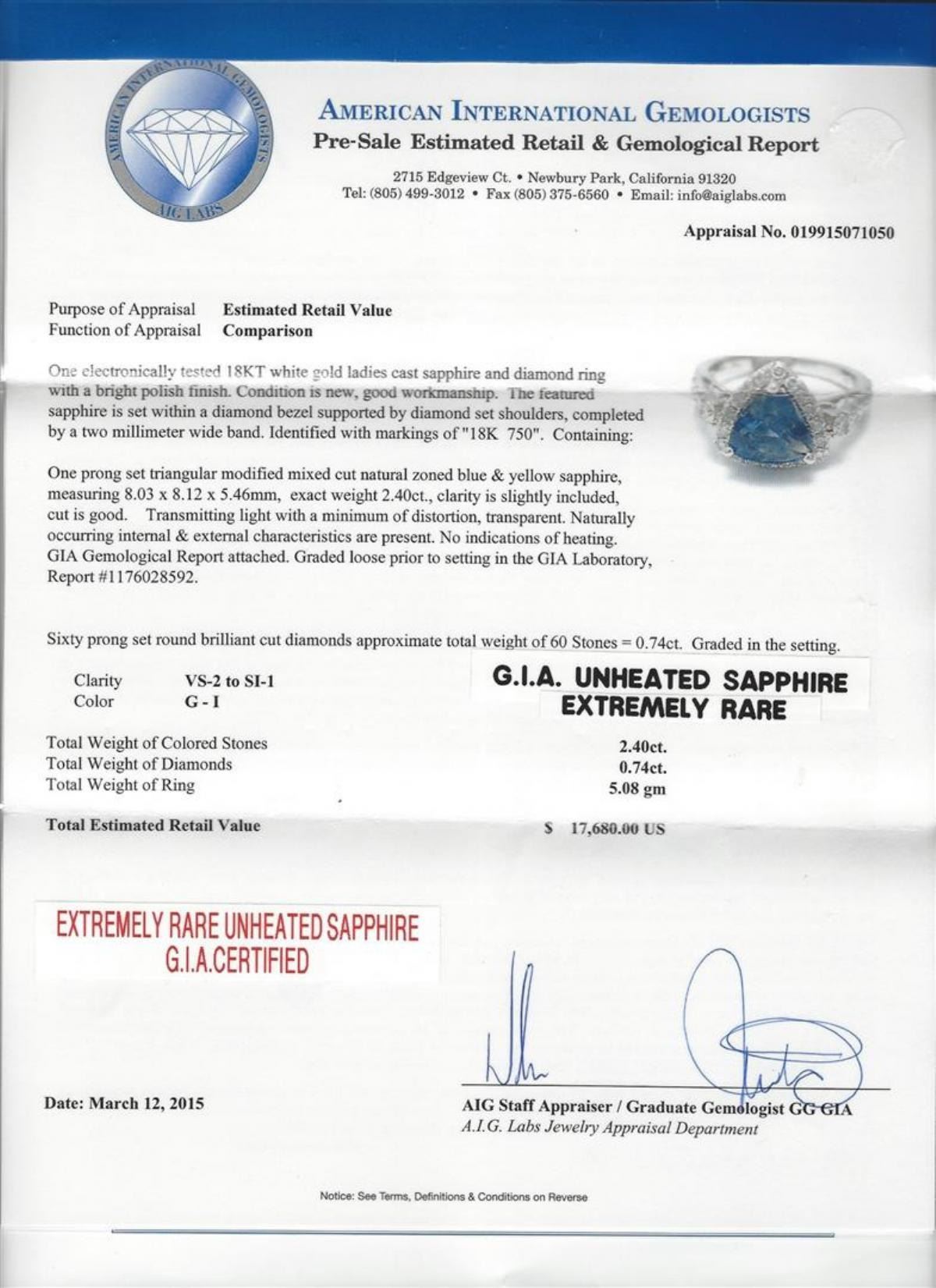 One 2.40ct Sapphire and Diamond Ring - 18KT White Gold. AIG certified. See Appraisal for more details. AIG Appraised.