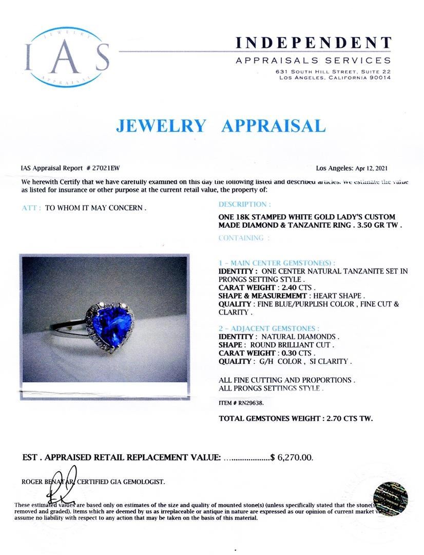 ONE 18K STAMPED WHITE GOLD LADY'S CUSTOM MADE DIAMOND & TANZANITE RING. 3.50 GR TW. CONTAINING: 1 â€" MAIN CENTER GEMSTONE(S): IDENTITY : ONE CENTER NATURAL TANZANITE SET IN PRONGS SETTING STYLE. CARAT WEIGHT : 2.40 CT. SHAPE & MEASUREMEMT : HEART SHAP