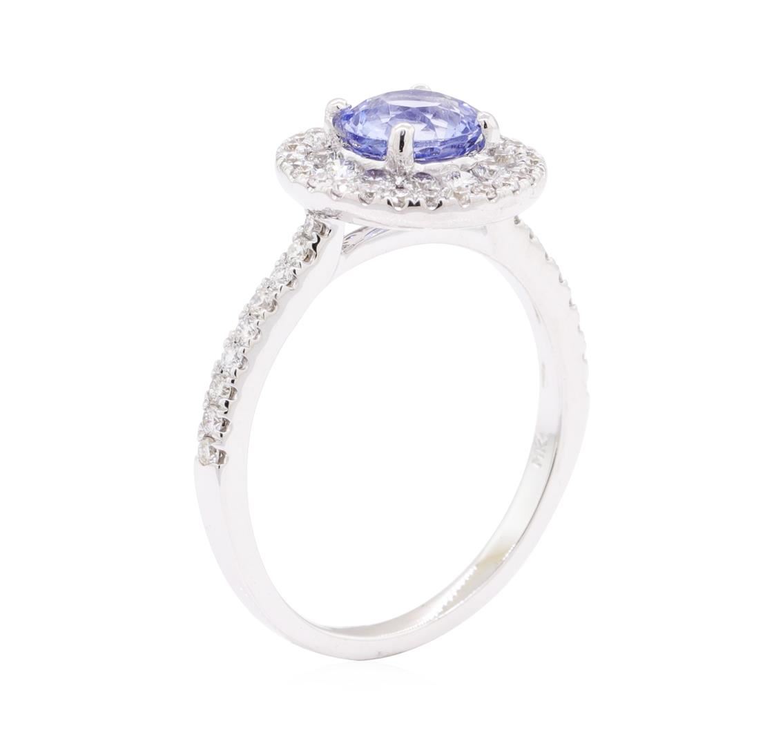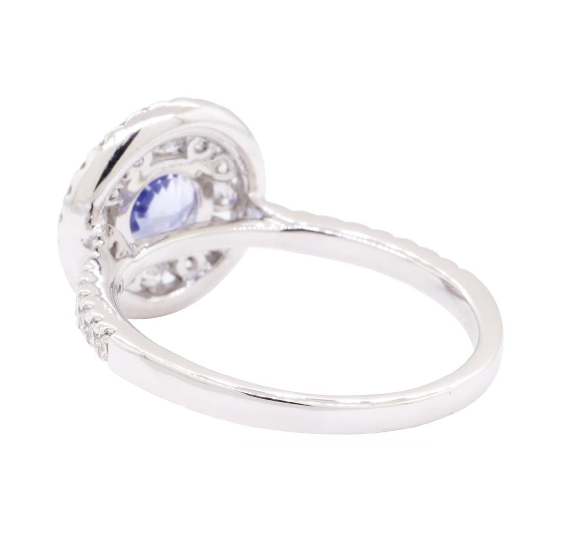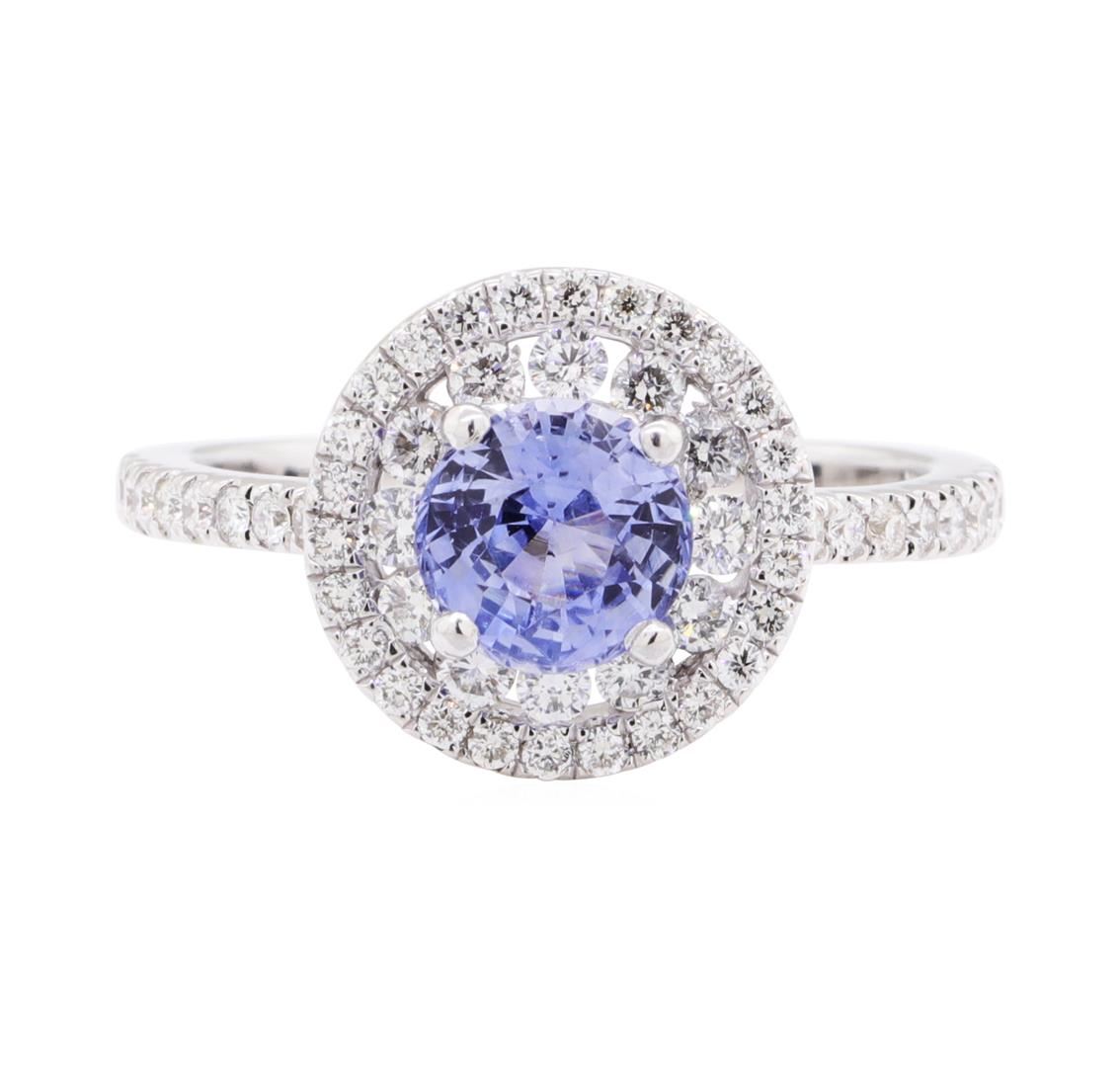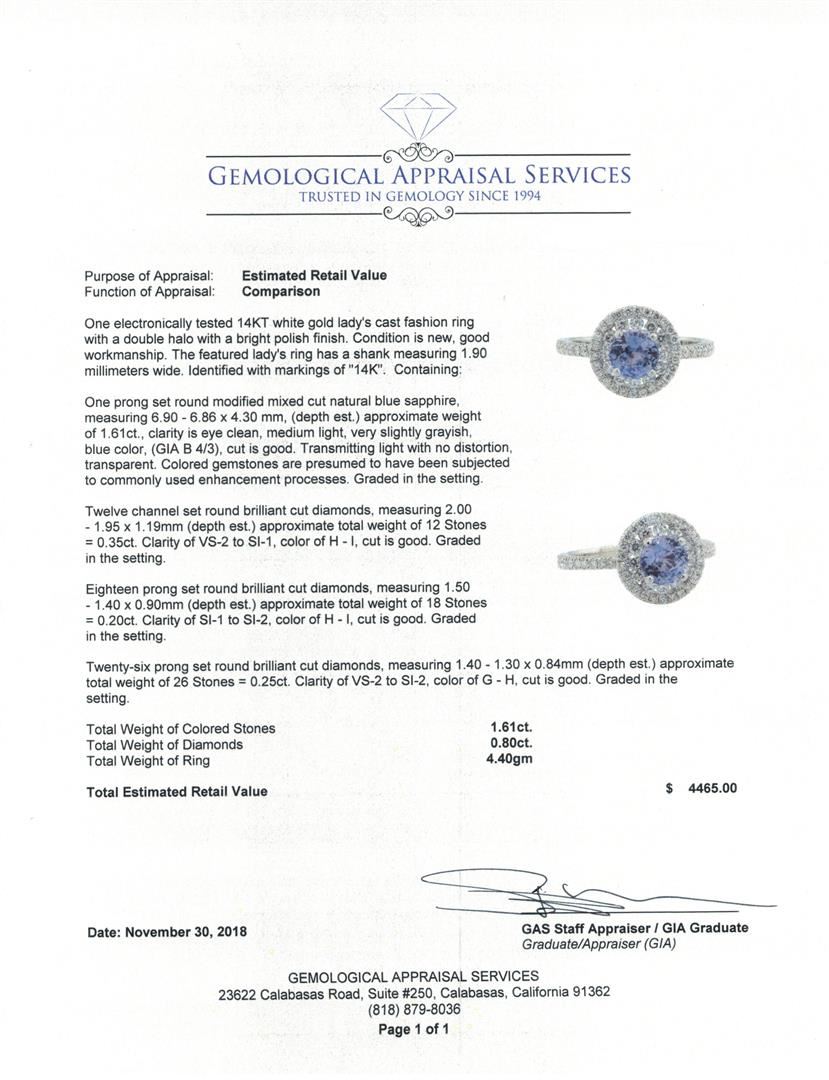 One electronically tested 14KT white gold lady's cast fashion ring with a double halo with a bright polish finish. The featured lady's ring has a shank measuring 1.90 millimeters wide. Identified with markings of '14K'. Condition is new, good workmanship. Containing: One prong set round modified mixed cut natural blue sapphire, measuring 6.90 - 6.86 x 4.30 mm, (depth est.) approximate weight of 1.61ct., clarity is eye clean, medium light, very slightly grayish, blue color, (GIA B 4/3), cut is good. Transmitting light with no distortion, transparent. Colored gemstones are presumed to have been subjected to commonly used enhancement processes. Graded in the setting. Twelve channel set round brilliant cut diamonds, measuring 2.00 - 1.95 x 1.19mm (depth est.) approximate total weight of 12 Stones = 0.35ct. Graded in the setting. Color H - I Clarity VS-2 to SI-1 Cut Good Eighteen prong set round brilliant cut diamonds, measuring 1.50 - 1.40 x 0.90mm (depth est.) approximate total weight of 18 Stones = 0.20ct. Graded in the setting. Color H - I Clarity SI-1 to SI-2 Cut Good Twenty-Six prong set round brilliant cut diamonds, measuring 1.40 - 1.30 x 0.84mm (depth est.) approximate total weight of 26 Stones = 0.25ct. Graded in the setting. Color G - H Clarity VS-2 to SI-2 Cut Good. Total Weight of Colored Stones 1.61ct.. Total Weight of Diamonds 0.80ct.. Total Weight of Ring 4.40gm GAS Appraised at $4465.00. GAS Appraised.