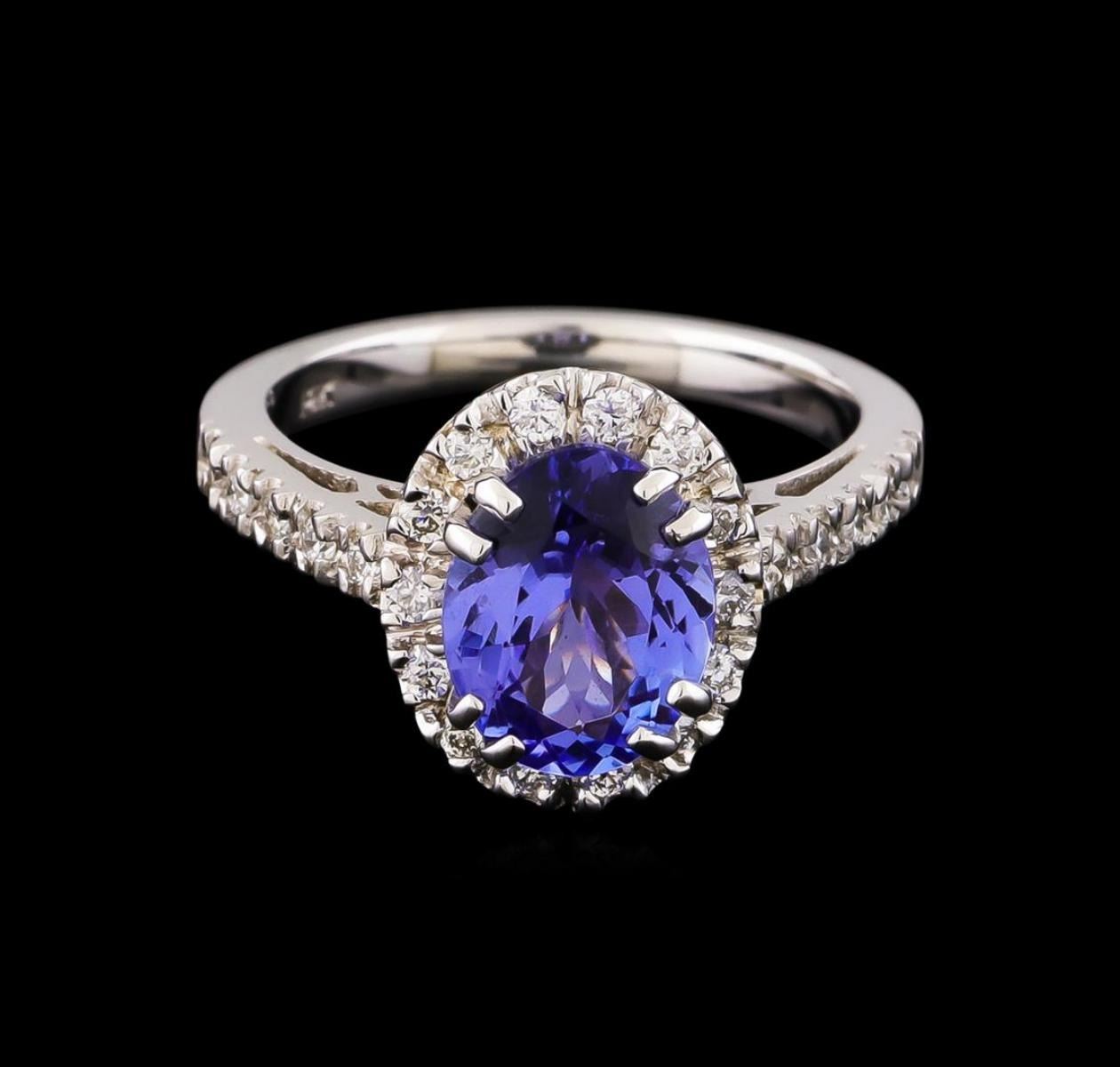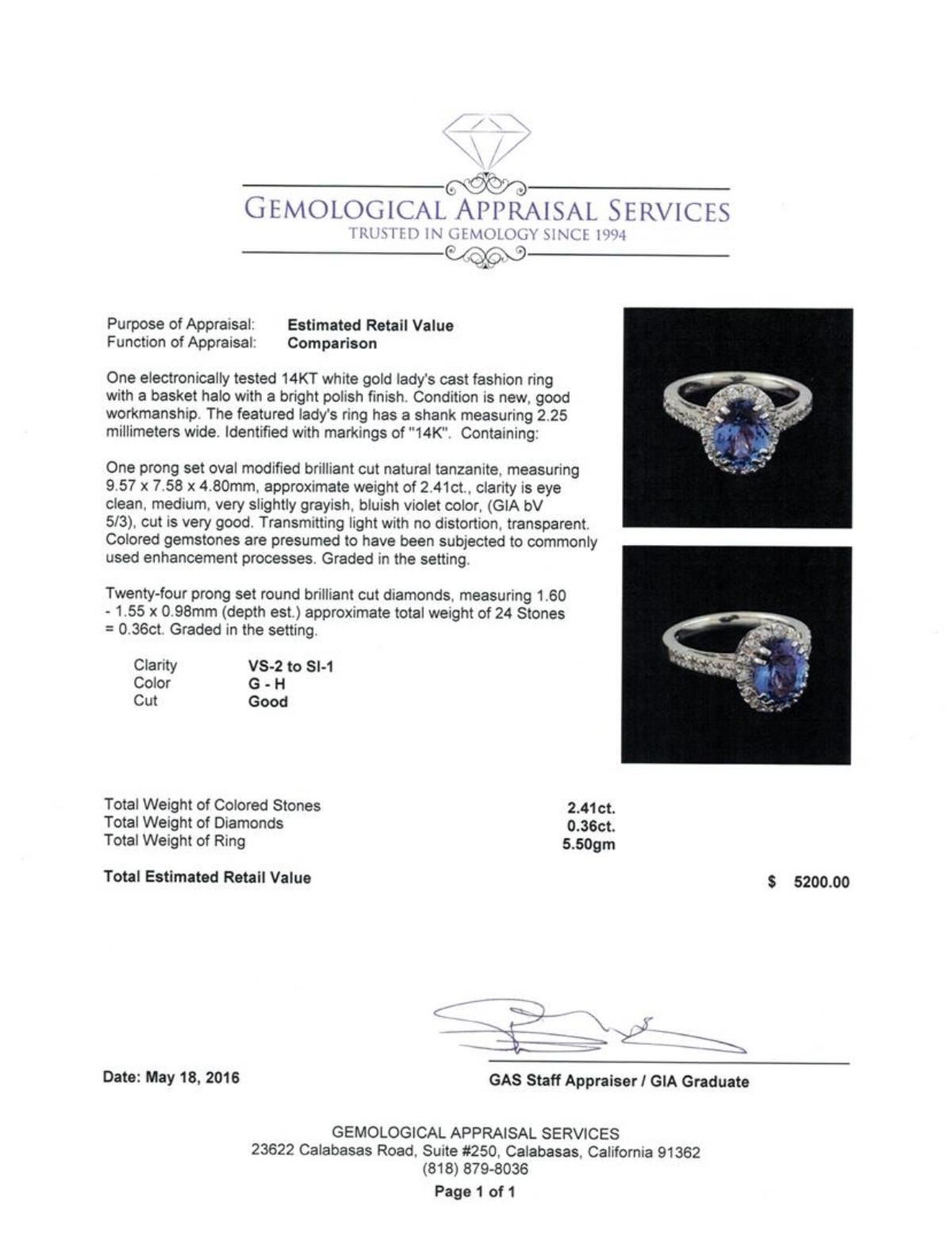 One electronically tested 14KT white gold lady's cast fashion ring with a basket halo with a bright polish finish. The featured lady's ring has a shank measuring 2.25 millimeters wide. Identified with markings of "14K". Condition is new, good workmanship. Containing: One prong set oval modified brilliant cut natural tanzanite, measuring 9.57 x 7.58 x 4.80mm, approximate weight of 2.41ct., clarity is eye clean, medium, very slightly grayish, bluish violet color, (GIA bV 5/3), cut is very good. Transmitting light with no distortion, transparent. Colored gemstones are presumed to have been subjected to commonly used enhancement processes. Graded in the setting. Twenty-Four prong set round brilliant cut diamonds, measuring 1.60 - 1.55 x 0.98mm (depth est.) approximate total weight of 24 Stones = 0.36ct. Graded in the setting. Clarity: VS-2 to SI-1. Color: G - Good. Total Weight of Colored Stones 2.41ct. Total Weight of Diamonds 0.36ct. Total Weight of Ring 5.50gm. GAS Appraised.
