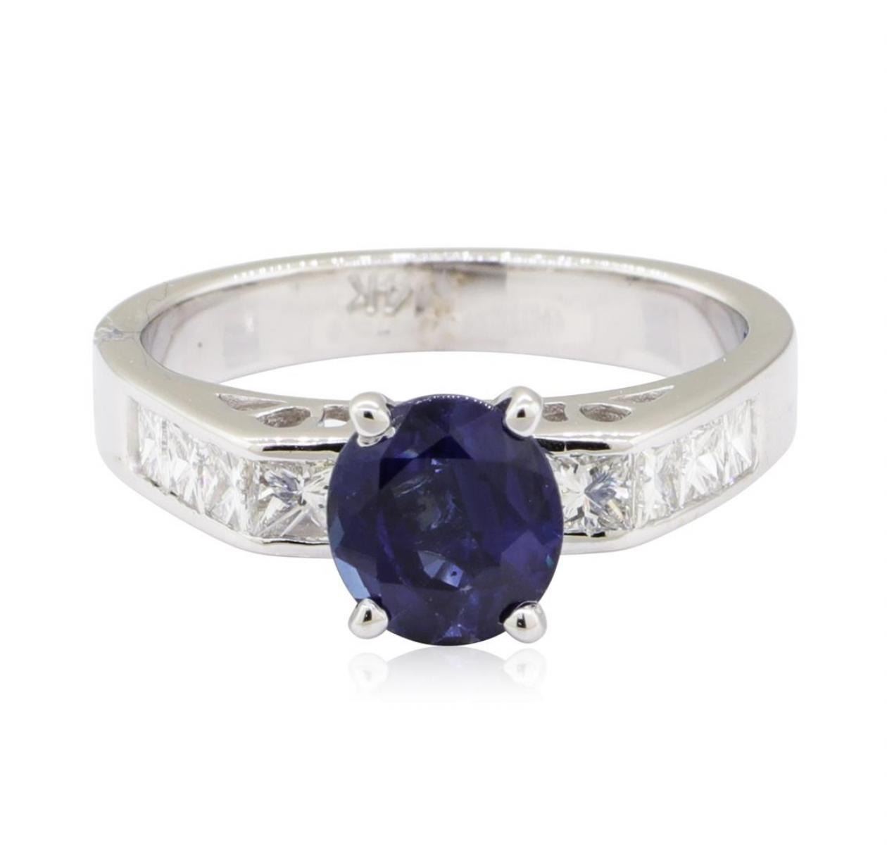 One electronically tested 14KT white gold lady's combination cast & assembled fashion ring with a straight line cathedral shank with a bright polish finish. The featured lady's ring has a shank measuring 3.10 millimeters wide. Identified with markings of '14K'. Condition is new, good workmanship. Containing: One prong set oval modified mixed cut natural blue sapphire, measuring 7.14 x 6.62 x 3.90mm, (depth est.) approximate weight of 1.62ct., clarity is slightly included, medium dark, moderately strong, blue color, (GIA B 6/4), cut is good. Transmitting light with a minimum of distortion, transparent. Colored gemstones are presumed to have been subjected to commonly used enhancement processes. Graded in the setting. Eight channel set princess cut diamonds, measuring 2.60 x 2.50 x 1.88mm (depth est.) approximate total weight of 8 Stones = 0.80ct. Graded in the setting. Color H - I Clarity VS-2 to SI-1 Cut Good. Total Weight of Colored Stones 1.62ct.. Total Weight of Diamonds 0.80ct.. Total Weight of Ring 4.60gm GAS Appraised at $4945.00. GAS Appraised.