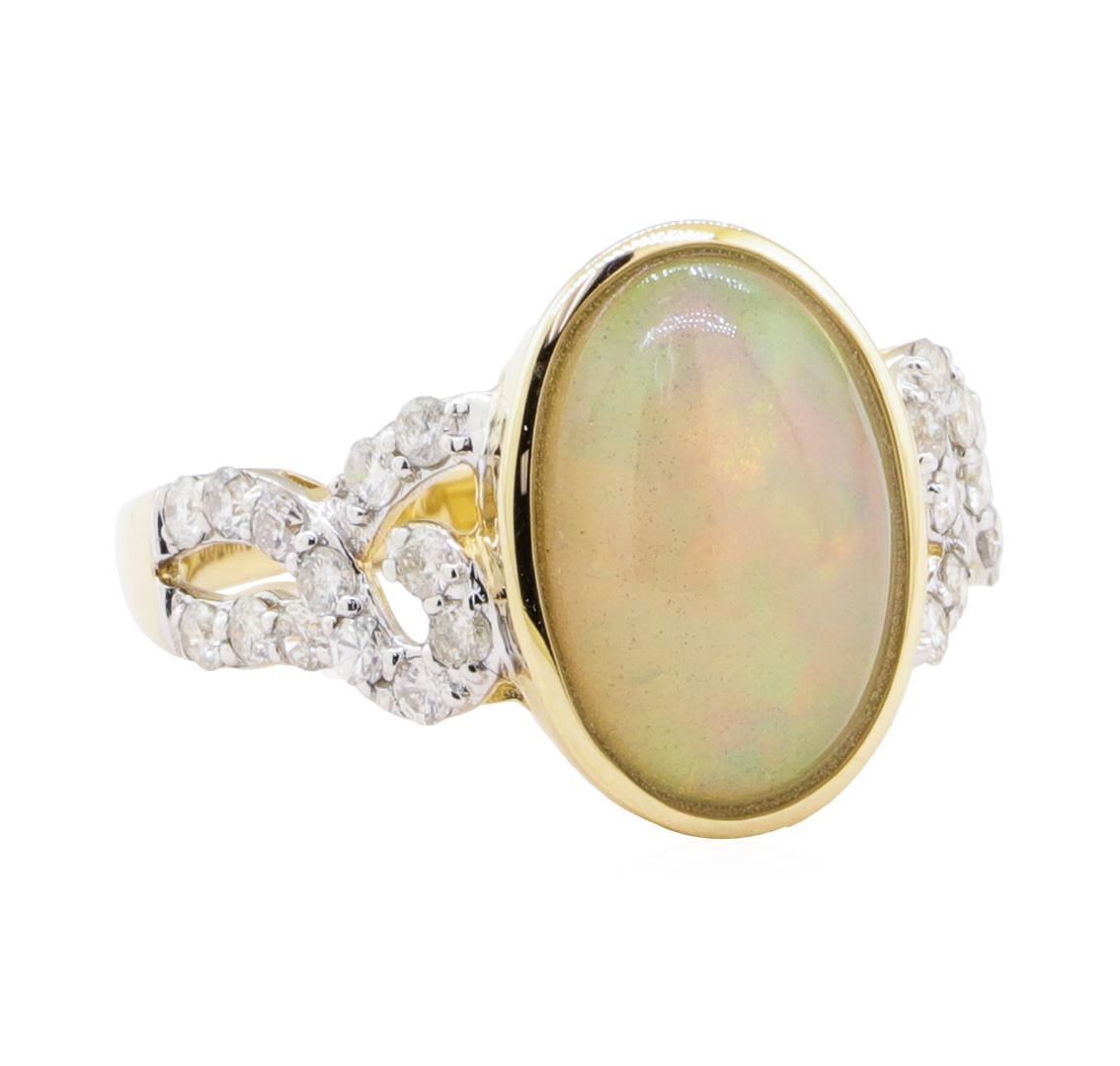 One ladies 14k yellow gold Diamond Ring weighing approx. 4.00 grams. Containing: One Oval Cabochon Opal weighing approx. 2.44 carat and 26 Round Brilliant cut Diamonds total weight approx. 0.48 carat Gem Type: Opal Shape/cut:: Oval Cabochon Carat weight: Approx. 2.44 carat Measurements: Approx. 12.50 x 8.50 mm Setting: Bezel set Gem Type: Diamond Shape/cut: Round Brilliant cut Carat weight: Total approx. 0.48 carat Color: H - J Clarity: I1 - I2 Metal Content: 14k Yellow Gold Setting: Prong set ESTIMIATED RETAIL REPLACEMENT VALUE; $2, 973.00 US