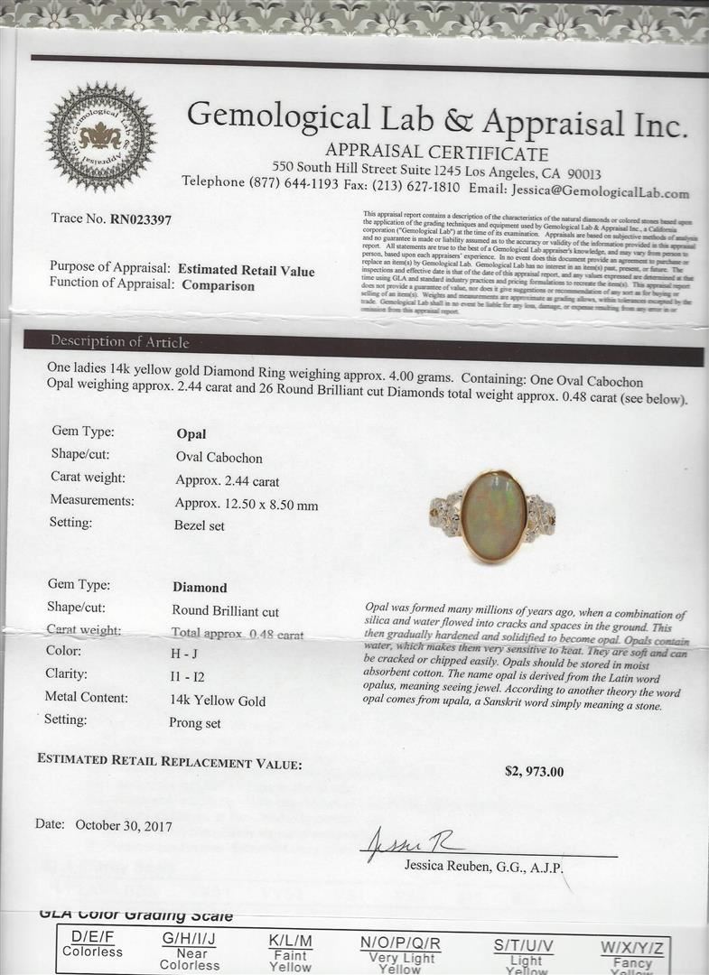 One ladies 14k yellow gold Diamond Ring weighing approx. 4.00 grams. Containing: One Oval Cabochon Opal weighing approx. 2.44 carat and 26 Round Brilliant cut Diamonds total weight approx. 0.48 carat Gem Type: Opal Shape/cut:: Oval Cabochon Carat weight: Approx. 2.44 carat Measurements: Approx. 12.50 x 8.50 mm Setting: Bezel set Gem Type: Diamond Shape/cut: Round Brilliant cut Carat weight: Total approx. 0.48 carat Color: H - J Clarity: I1 - I2 Metal Content: 14k Yellow Gold Setting: Prong set ESTIMIATED RETAIL REPLACEMENT VALUE; $2, 973.00 US