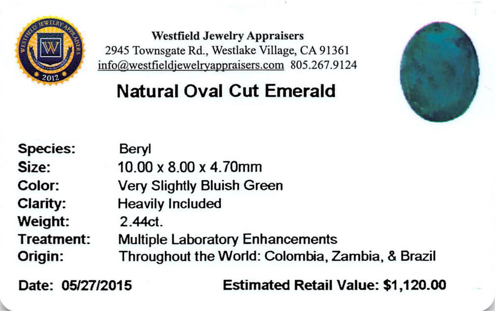 One oval mixed cut natural emerald, measuring 10.00 x 8.00 x 4.70mm, exact weight 2.44ct., clarity is heavily included, type III, medium dark, very slightly grayish, very slightly bluish green color, (GIA vslbG 6/3), cut is good. Transmitting light somewhat diffusely, translucent, Naturally occurring internal & external characteristics are present, Indications of multiple laboratory enhancements, including high temperature heat treatment. Westfield Appraised.