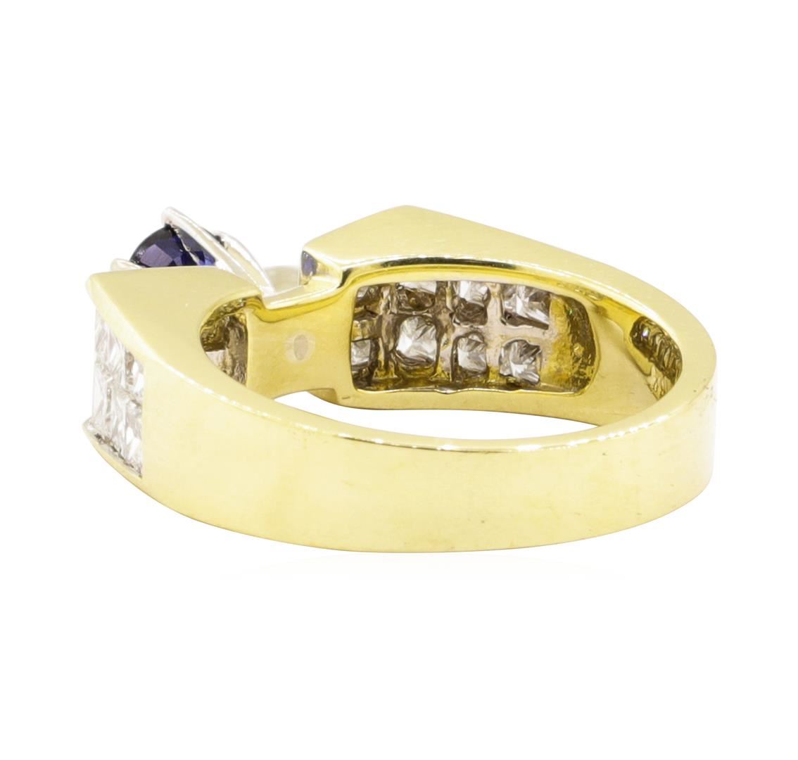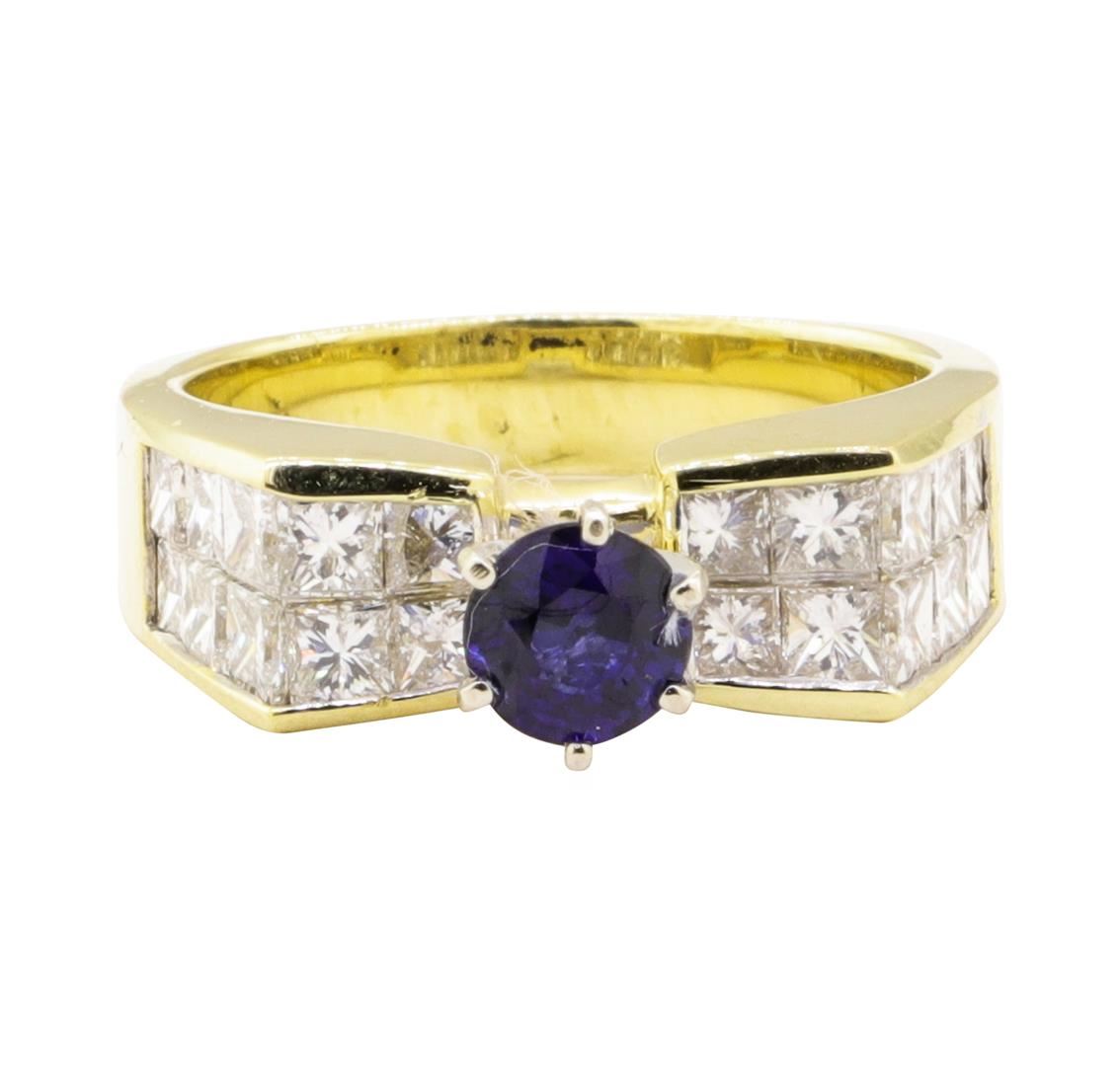 One electronically tested 18KT yellow gold lady's combination cast & assembled fashion ring with a elevated shoulders motif with a bright polish finish. The featured lady's ring has a shank measuring 3.85 millimeters wide. Identified with markings of '18K'. Condition is new, good workmanship. Containing: One prong set round modified mixed cut natural blue sapphire, measuring 5.12 - 5.08 x 3.32 mm, (depth est.) approximate weight of 0.70ct., clarity is eye clean, medium dark, moderately strong, violetish blue color, (GIA vB 6/4), cut is very good. Transmitting light with no distortion, transparent. Colored gemstones are presumed to have been subjected to commonly used enhancement processes. Graded in the setting. Twenty invisible set princess cut diamonds, measuring 2.50 x 2.30 x 1.73mm (depth est.) approximate total weight of 20 Stones = 1.75ct. Graded in the setting. Color G - H Clarity VS-2 to SI-1 Cut Very Good. Total Weight of Colored Stones 0.70ct.. Total Weight of Diamonds 1.75ct.. Total Weight of Ring 7.70gm GAS Appraised at $5150.00. GAS Appraised.